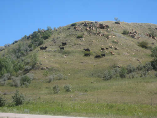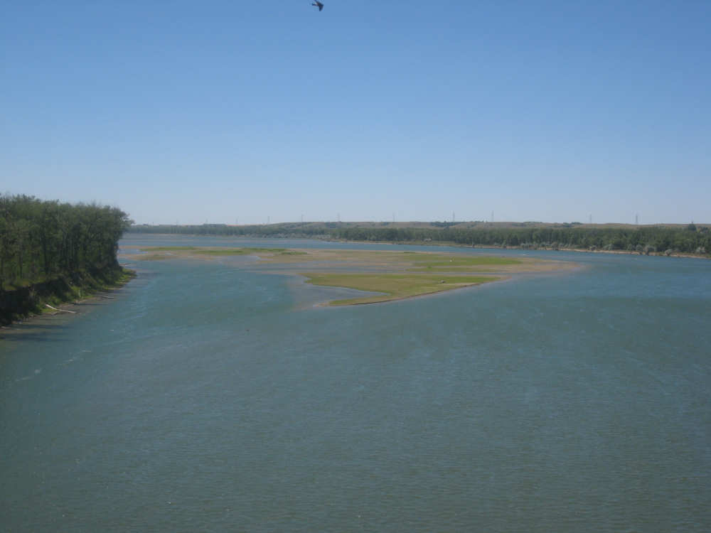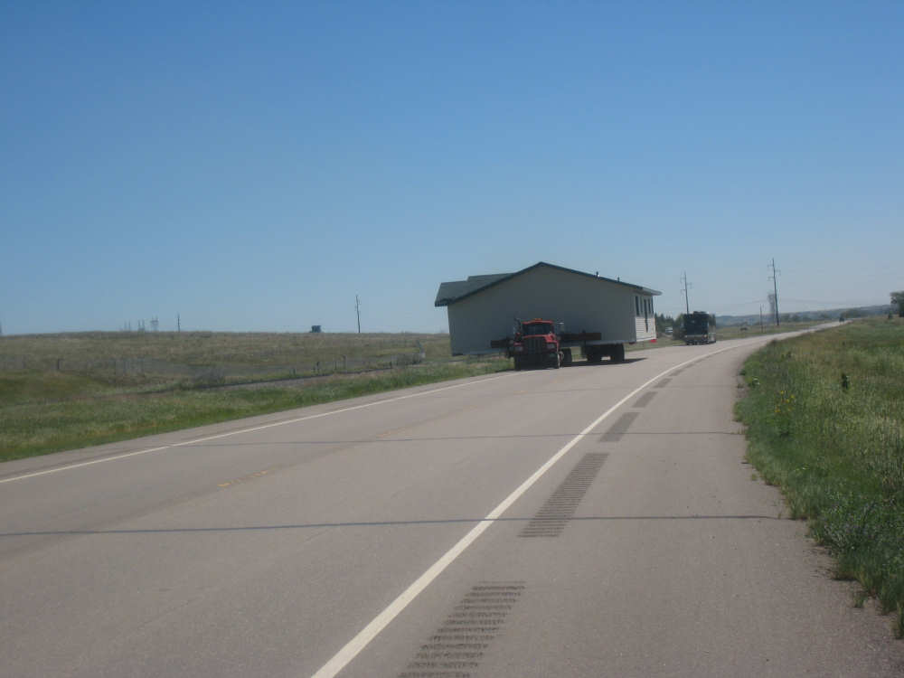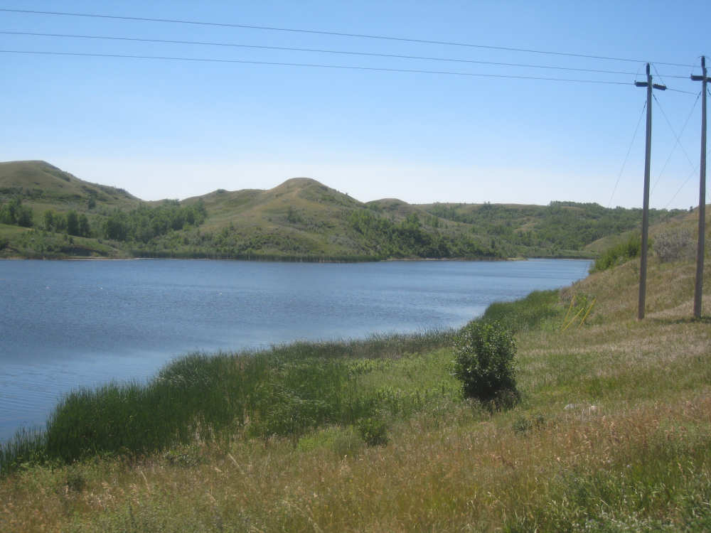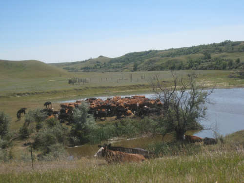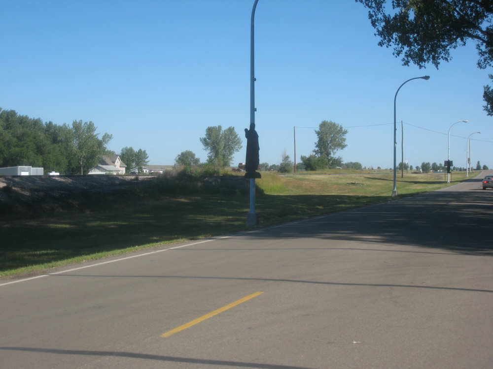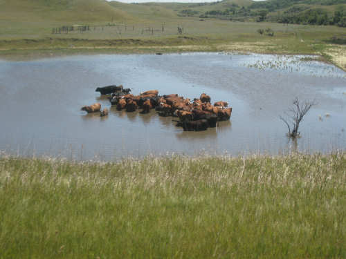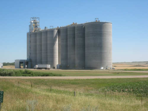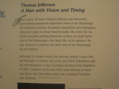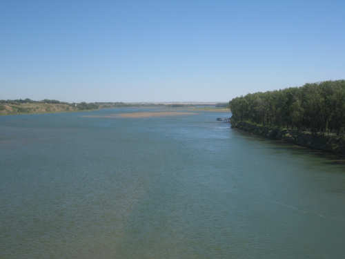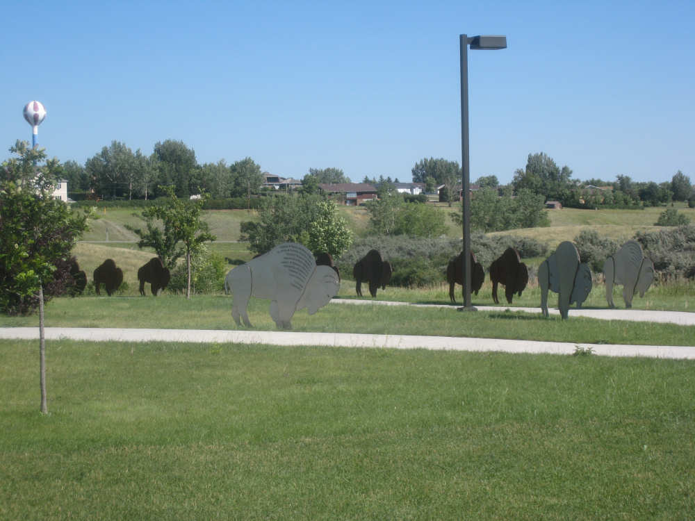 After lunch, we got back on Rt. 200 (alternate) and headed toward Washburn and the Missouri River. This stretch was fairly uneventful until we reached the river, except for seeing a bank of windmills turning in the distance at one turn in the road. We also saw a very wide house being transported, and a group of cows enjoying a dip in a stream. As we neared the river, we also went by Mandan Lake, a small lake nestled among hills, with a beautiful deep blue color. We also passed a wetlands area. The river itself looked very low. Les had told us that the rainfall had been extremely low for the last 5 years and had just gotten better this year, so water levels in general were low. In any case, it was still a lovely river. We had a long climb into Washburn on the other side of the river. The North Dakota Lewis & Clark Interpretive Center was to our left as we approached Hwy. 83 and our motel was on our right. We opted to go to the motel first and unload and then head back to the Interpretive Center. The center was supposed to be open until 7 (summer hours) we were told, but when we got there, they said it was closing at 5, so we only had about a half-hour to tour it. The main exhibit was fairly small, though, with some additional art exhibits which we did not go through. The exhibit dealt primarily with Lewis & Clark's dealings with the local Indians, the 3 tribes discussed at the Knife River exhibit. It also had a lifesize replica of a partially-made dugout canoe, being carved out of a cottonwood log. The enormous statues in front of the center, Lewis & Clark in formal attire meeting with an Indian chief, were among the highlights of the center.