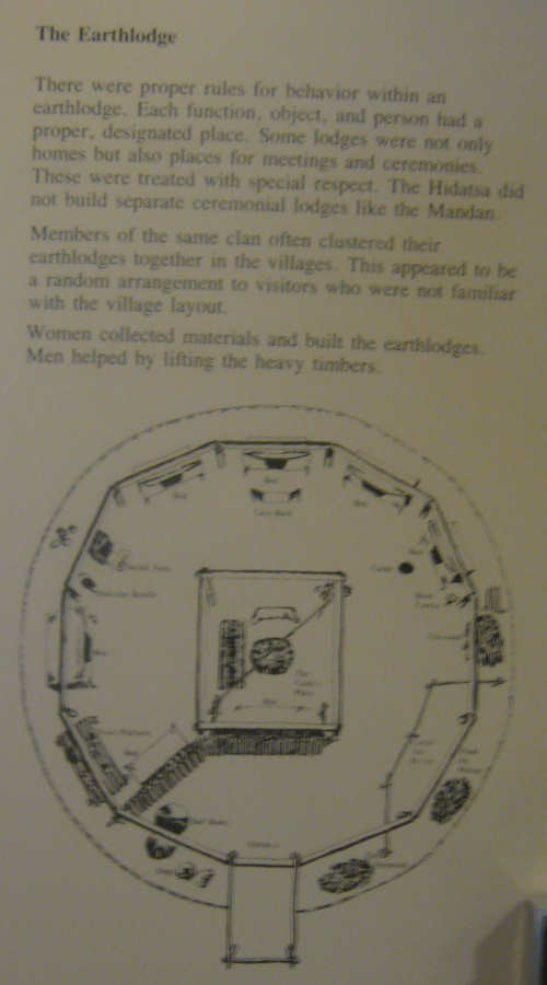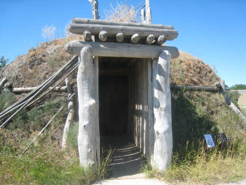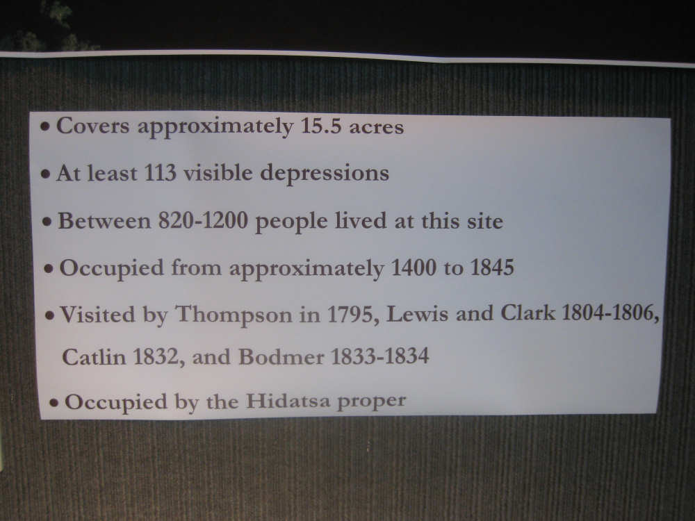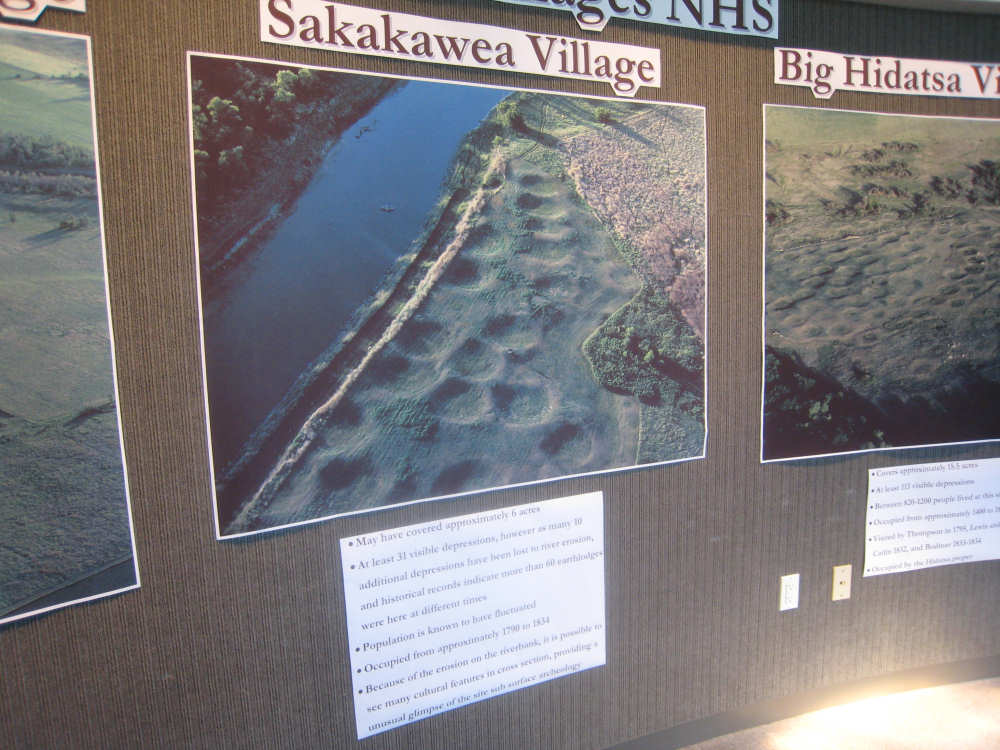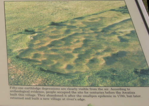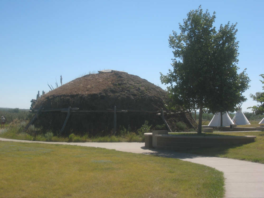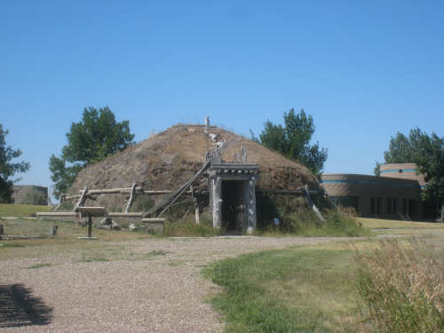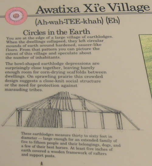 The difference between yesterday and today was night and day - today was sunny, not a cloud in sight, with a strong tailwind. Very pleasant riding. We left around 8:50 after a very pleasant breakfast with Les & Jerine, and stopped at the grocery store in town to stock up on bananas and cookies, which we'd run out of. Then we headed east until the turnoff to Stanton, where we turned north to go visit the Knife River Indian Village exhibit. This exhibit preserves the sites of the Hidatsa, Mandan, and Arikara Indian villages that had been located there for periods ranging from 1400-1845. Lewis & Clark spent a winter in the area at nearby Fort Mandan and developed a good relationship with the natives living there. The structures which the Indians lived in were primarily earthlodges, large round earthen structures reinforced by timber. They seemed to be very well constructed, warm and yet well-ventilated. The impressions left by these structures were round depressions in the earth, presumably just packed down from people living inside them. The depressions are a bit hard to see from the ground but are clearly visible from aerial views.
