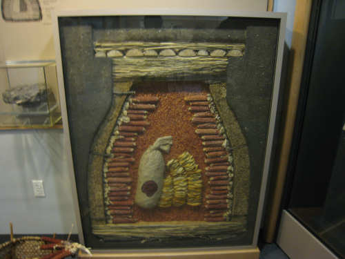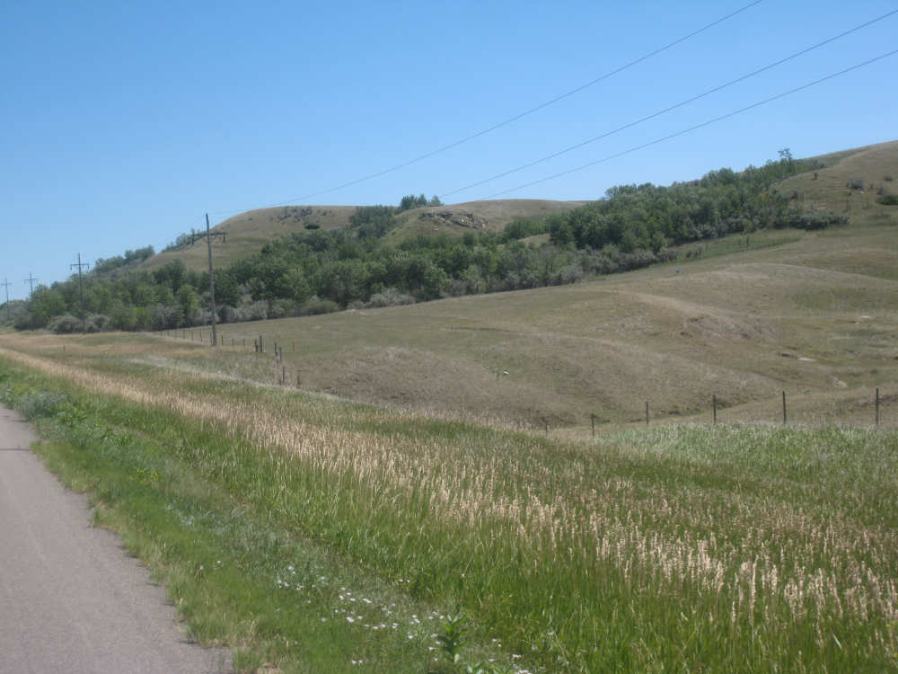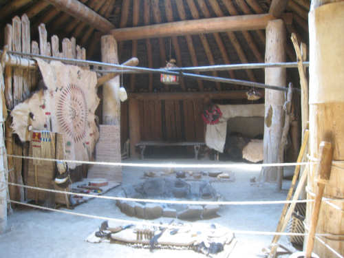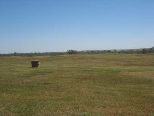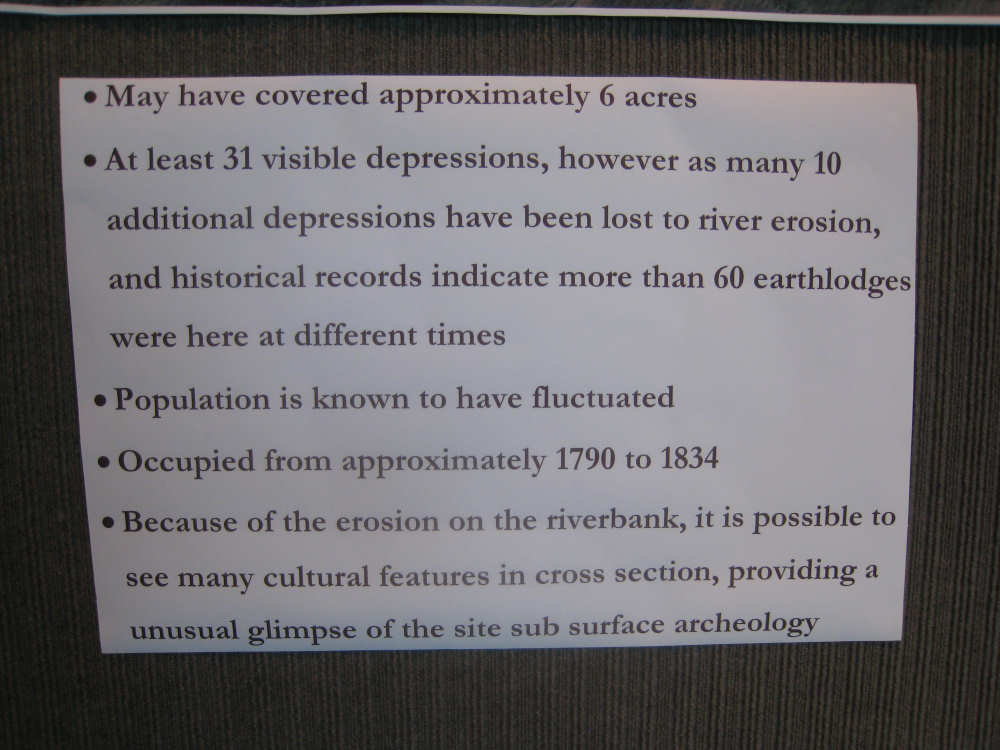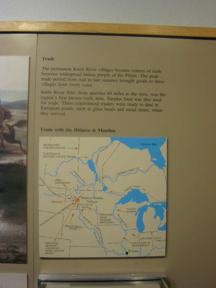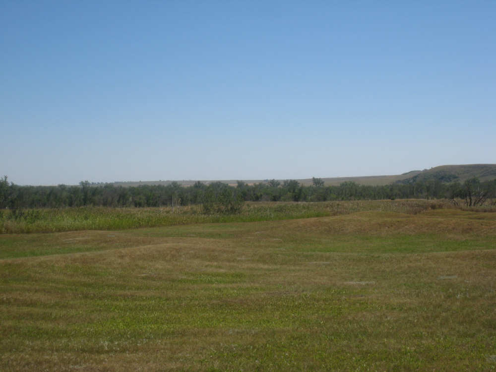 The difference between yesterday and today was night and day - today was sunny, not a cloud in sight, with a strong tailwind. Very pleasant riding. We left around 8:50 after a very pleasant breakfast with Les & Jerine, and stopped at the grocery store in town to stock up on bananas and cookies, which we'd run out of. Then we headed east until the turnoff to Stanton, where we turned north to go visit the Knife River Indian Village exhibit. This exhibit preserves the sites of the Hidatsa, Mandan, and Arikara Indian villages that had been located there for periods ranging from 1400-1845. Lewis & Clark spent a winter in the area at nearby Fort Mandan and developed a good relationship with the natives living there. The structures which the Indians lived in were primarily earthlodges, large round earthen structures reinforced by timber. They seemed to be very well constructed, warm and yet well-ventilated. The impressions left by these structures were round depressions in the earth, presumably just packed down from people living inside them. The depressions are a bit hard to see from the ground but are clearly visible from aerial views.