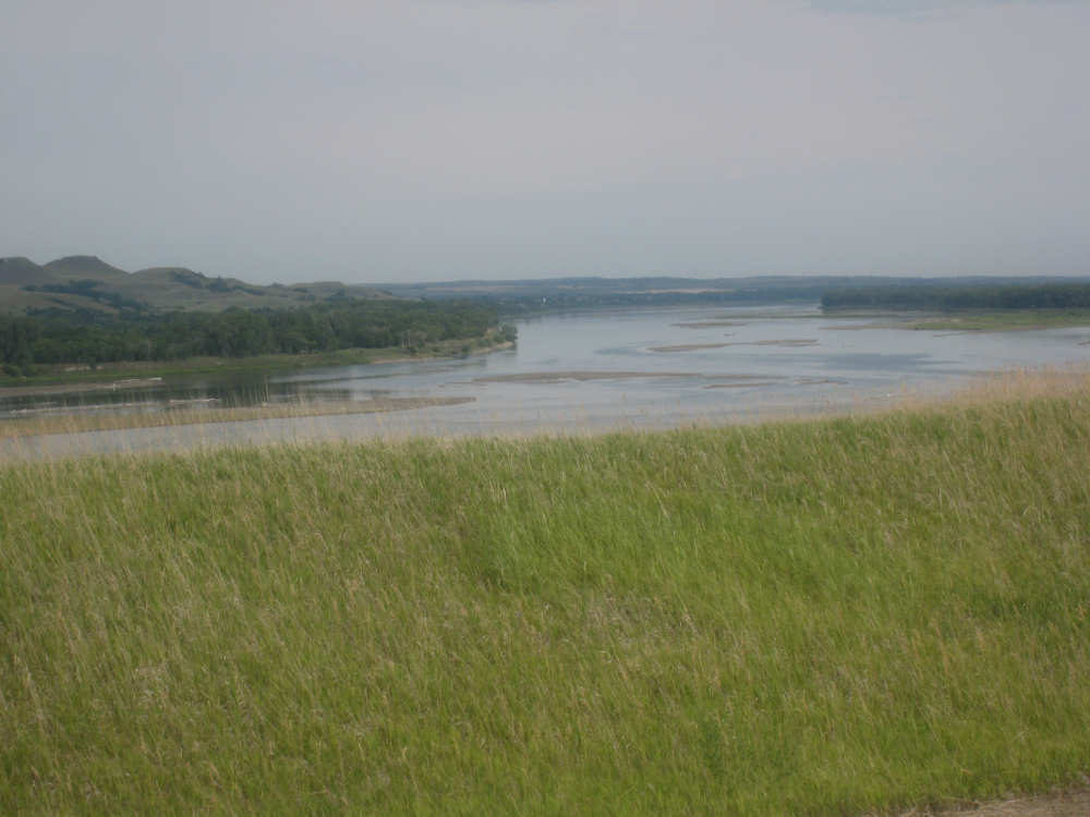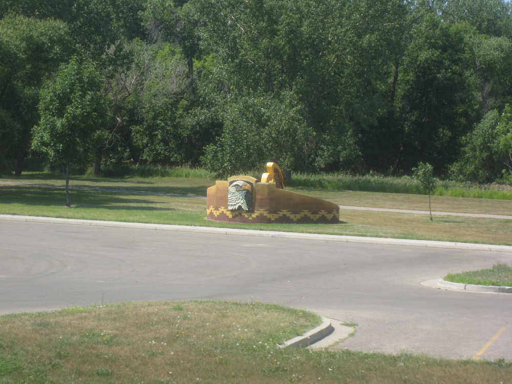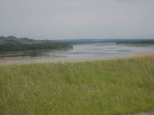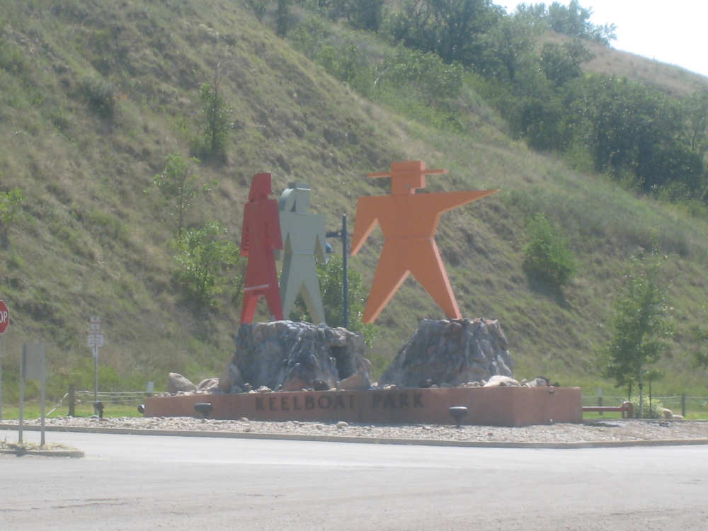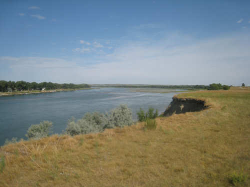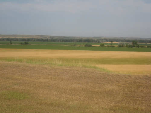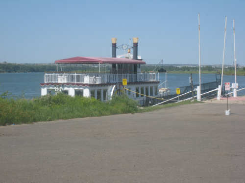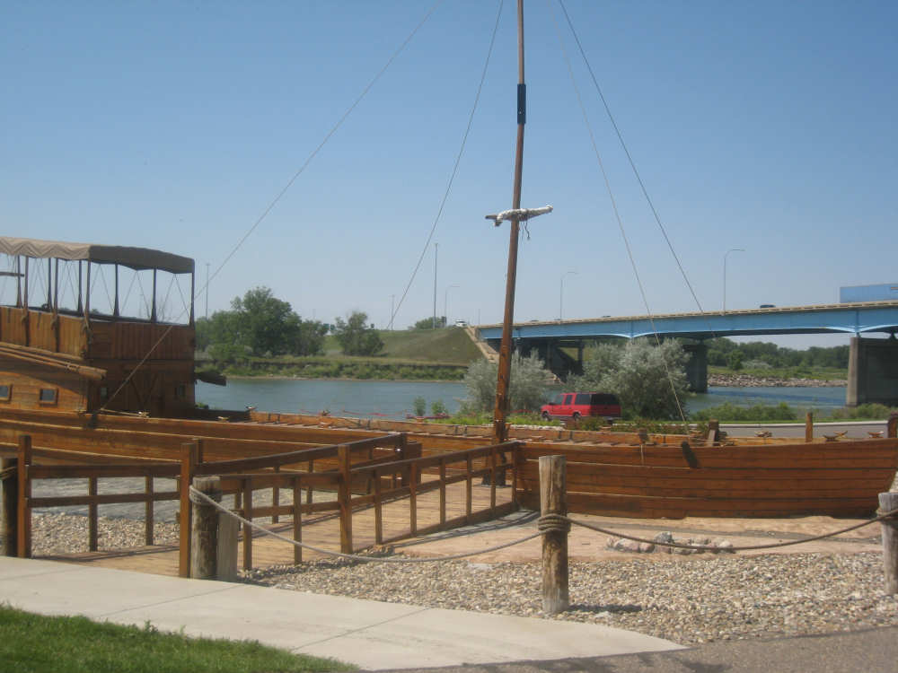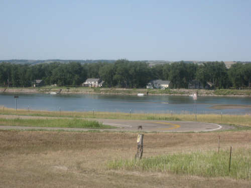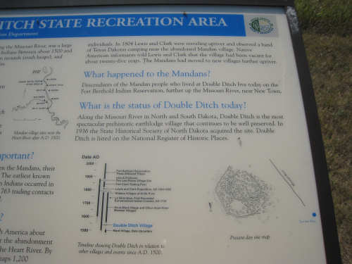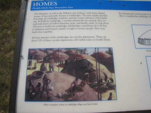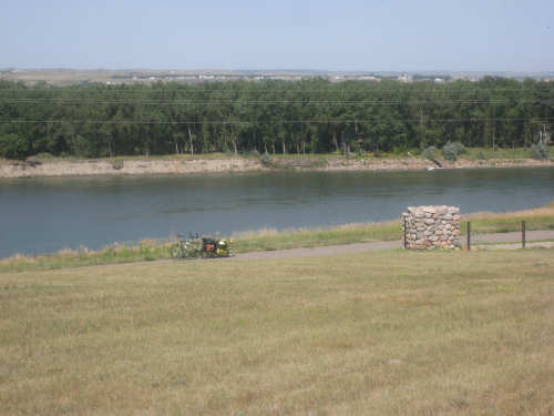 Wednesday, July 30, 2008 Sorry for the technical difficulties yesterday, but all is working fine today and yesterday's pictures are now up. Another beautiful day today, cool and sunny with a calm wind in the morning - excellent biking weather. It was rolling hills again today, too, and the wind, once it got going, was from the south, but we made out fine. We went into downtown Washburn to find breakfast and found a quaint little town with a great cafe. Banners on the lampposts called Washburn the winter home of Lewis & Clark, referring to the place they camped during their first winter, just south of here. We then set out on Hwy. 83 and, shortly afterward, turned off onto Rt. 1804, the more scenic road that runs closer to the river. We got some great views of the Missouri today, as well as the farmhouses, crops, and trees alongside it and the hills and buttes behind it. It was a very lovely day. We noticed that many of the crops were not grain, which was practically all we saw in Montana - here we saw corn and other crops as well as wheat and hay. We were also surprised to find that someone in North Dakota has the same sense of humor that we saw in Texas. One of the farms' fence posts were each decorated with an old cowboy boot or shoe, like the farm called Boot Hill that we saw near Hunt, TX (see the April 14 page). We did a little more sight-seeing today, at another earthlodge village called Double Ditch (no explanation why it was called that). This one had been inhabited by the Mandan Indians but had already been abandoned when Lewis & Clark arrived there in 1804. Almost 90% of the Mandans had been wiped out by a smallpox epidemic and the survivors had relocated farther north. We got pictures of several plaques, one of them describing the square-looking buttes we had seen earlier along the river, but others mostly talking about the earthlodges and the Mandans. Some of the pictures may seem like repeats of yesterday's but we thought the floor plan shown here was clearer than yesterday's, so we included it. The village site also had a lovely stone shelter that had been built in the Depression as one of the Conservation Corps projects, and there was a plaque about that. Shortly after the Double Ditch village, we began to get into the outskirts of Bismarck. We got onto a parallel road called River Road that ran along the river. This brought us to a bike trail, parallel to the road, which wound through a series of parks. The first one was Pioneer Park which had a pavilion, picnic area, and woods along the river. The second, more elaborate one, was Keelboat Park with an interesting sculpture of Lewis, Clark & Sakagawea, a replica of a keelboat, and a small steamboat that gave rides up and down the river. It also had a restaurant, and given it was around 1 pm, we stopped and had a delicious lunch. We continued along the bike path through about 3 more miles of lovely parks before we arrived at our motel at 2 pm. We found our motel to be very well situated, near restaurants and near a bike shop. After unloading everything, we headed over to the bike shop to get it looked over. We also managed to get a bike seat cover for my seat which is coming apart at the seams. I'm hoping the seat cover will keep the seat together for the rest of the trip, so I can get a new one at home. It was another short and pleasant day - 43 miles in a little over 4 hours of bike time. The next two days will be longer and a little tougher, we expect. Here's hoping the weather cooperates, at least! |