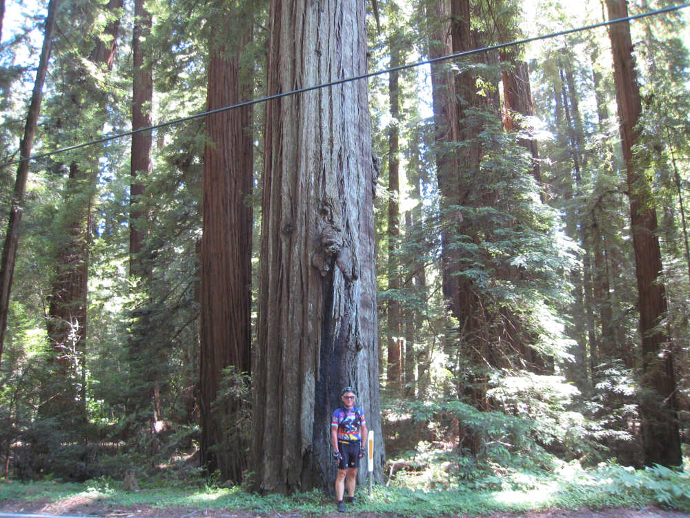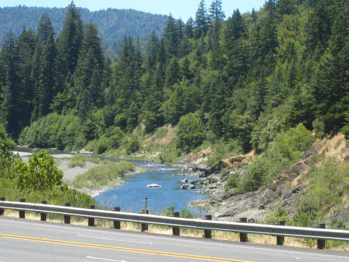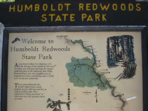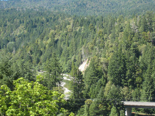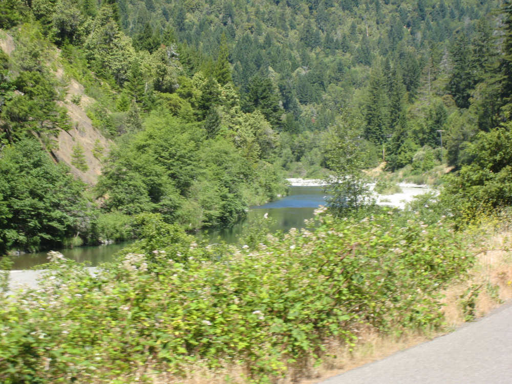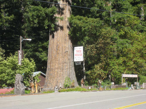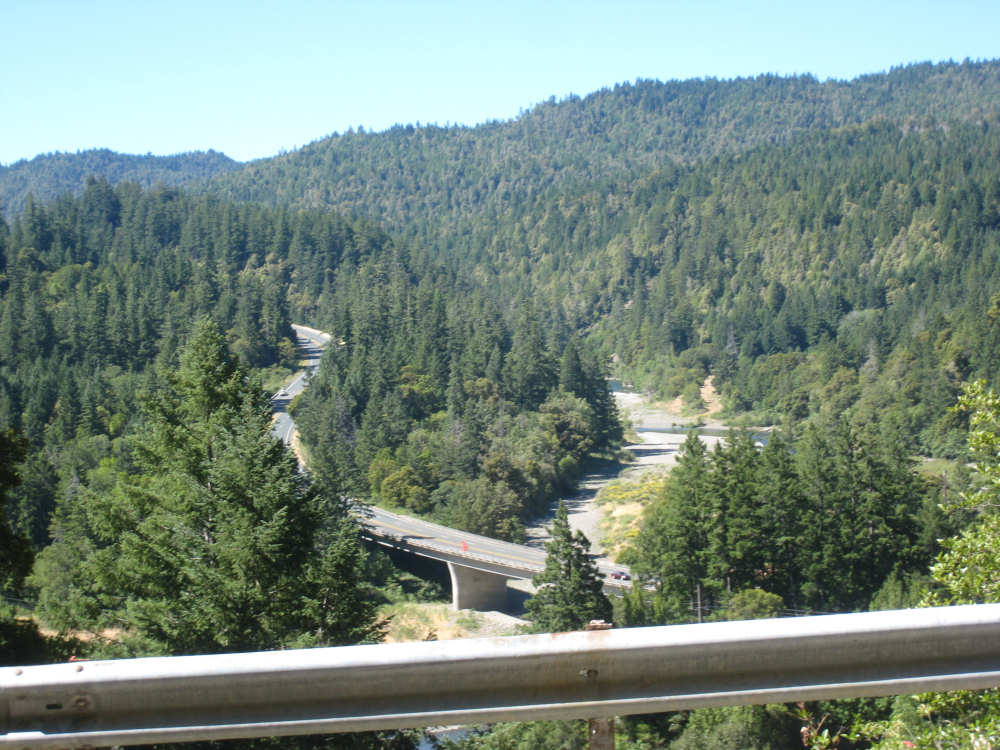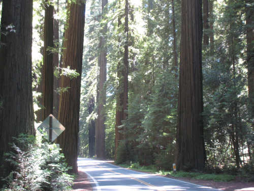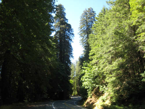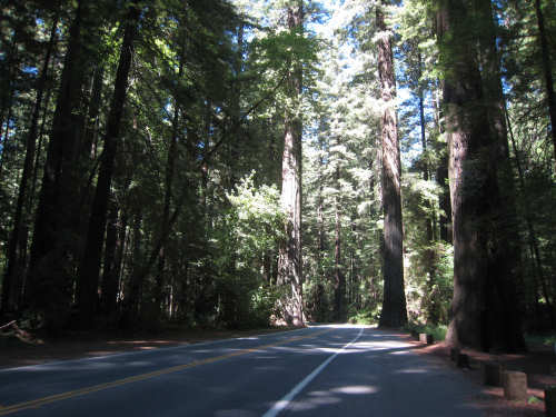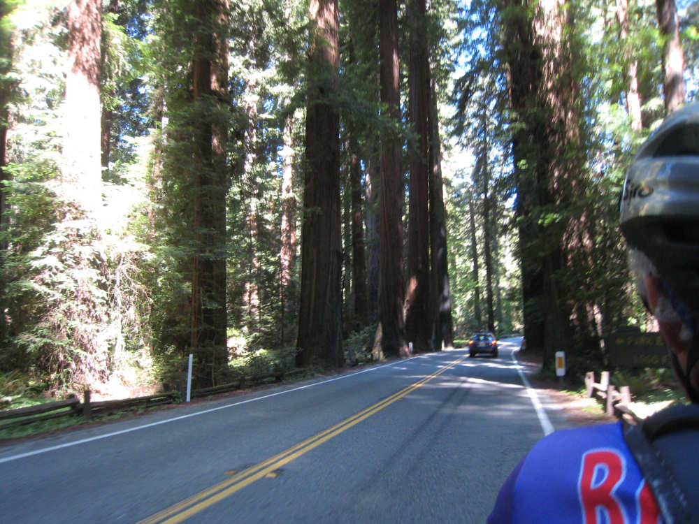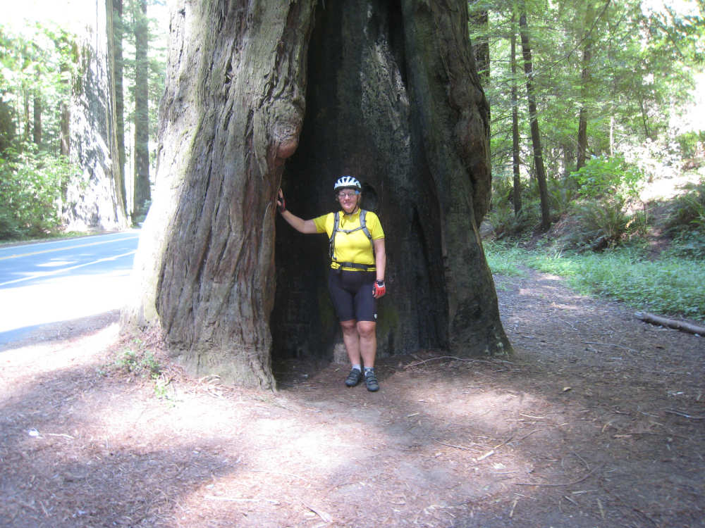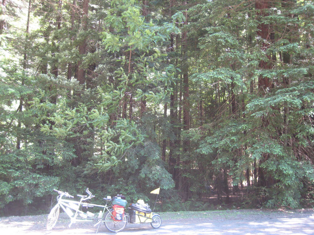Monday, June 09, 2008 Our campsite last night was quite international. Besides Audrey from Quebec and the 4 people from Austria, another couple of guys from England arrived fairly late. There was only one American in the hiker/biker site besides us, he was from San Francisco and was doing a whirlwind tour from Portland back to San Fran in just a couple of weeks. We had some breakfast at our favorite new restaurant across the street from the campsite, including 2 more brownies like the ones we had last night. The restaurant is called the Peg House, which we thought was named after the owner, but she told us it was because the entire house was held together with wooden pegs - no nails, screws or other metal fasteners. Truly an amazing place; not to be missed if you're in the area. Today was about redwoods. We started off on 101, a fairly busy road but wider than Hwy. 1. There were already some touristy redwood places popping up along the road - the World Famous Tree House, the Living Chimney Tree, etc. - and there were lots of places offering wood carvings, the most common subjects of which were bears, Native American Indian chiefs, sea captains, and other odd characters. Many of them were quite good. We also started seeing logging trucks again, this time with redwoods; we've heard that we'll be seeing a lot more of them as we continue north. We took a little detour off 101 for a bit onto Rt. 271 which was very scenic and a lot calmer than 101. We went up a hill and for a while were overlooking 101, as well as the sparkling Eel River, which snaked alongside us pretty much all day. We rejoined 101 after a few miles and "officially" entered Redwoods Country. We saw a Road Narrows sign (roads seem to only narrow, they never say they widen) and soon realized that it had shrunk to squeeze between large redwood trees on either side of it - pretty amazing for a major road like 101. The road did widen again later and went up some pretty steep hills. At least, they seemed steep - we seemed to still be pretty tired out from the hill into Leggett yesterday. We stopped to rest midway up one hill and a guy on a bike soon came up alongside us. He was touring too, and seemed to do it frequently - he was familiar with a lot of the places we'd been and were planning on going. He said his name was Adrian and we had a very nice time talking with him; he had quite an upbeat attitude and clearly loved biking around the country. He went off ahead of us but left us feeling much cheerier than before we stopped - another "bike angel" showing up just when we needed one. We stopped in Garberville for lunch and chatted with a motorcyclist from the area. He told us a lot about the Columbia River Gorge and other places and was quite interesting. We set off again - by now it was quite warm and the wind was still pretty calm, like yesterday. After the next hill, we were feeling quite wiped out. We came to the turnoff for the Avenue of the Giants (Redwoods, that is). which we had been looking forward to for some while. According to the information sign, this road covers 32 miles of redwood forest, over 53,000 acres, 17,000 of which are ancient trees, some of which live as long as 2,000 years. They are also the world's tallest trees, reaching heights of 360 feet. At first, it didn't seem very different from 101, except that the traffic was a bit lighter and there were no trucks. The heat was still oppressive and we were ready to call it a day. Then we started getting into the redwood groves - it was nice and shady, much cooler, and of course beautiful to look at. The trees were nothing short of majestic. and like being in an immense cathedral, they inspired one to silence. Most of the rest of the day's ride was fairly easy and downhill overall. We went in and out of the groves, kept getting peeks of the Eel River from time to time, and eventually arrived at Myers Flat and found our campground. This was a private campground, not a state park and had 2 things we haven't seen in a campground for some time - free showers and a laundromat (not free). We don't have cell phone access, but we do have electricity and wi-fi, so no excuses about the website. We arrived around 4 pm, set up the tent, showered and went to the one restaurant in town for dinner - delicious food, amazingly enough - and then did laundry and worked on the website. We had a short day - 43.5 miles - which we did in 4-1/2 hours of bike time. Tomorrow's a longer day but we'll end in a motel again and the day after will be a rest day - hooray! |