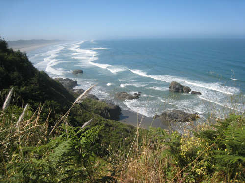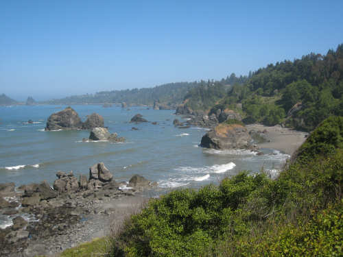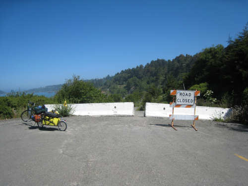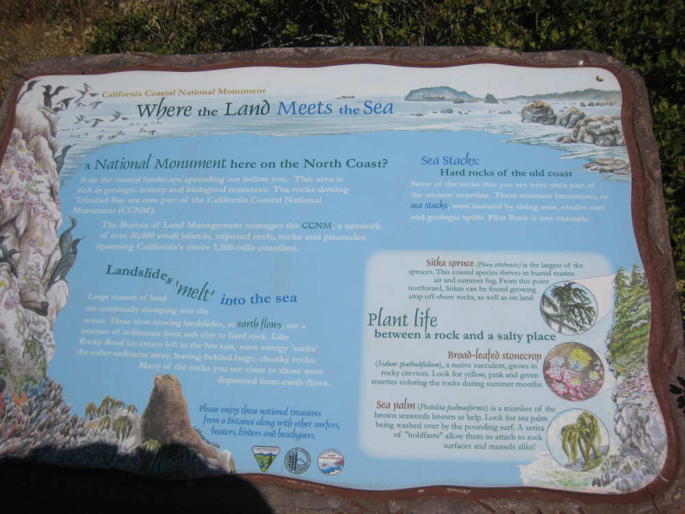 We started out going past the Humboldt Bay which became Arcata Bay. We had some good views of the water early on, but we soon were in the midst of groves of trees, mostly pines it seemed, with some redwoods. Crossing over a narrow bridge over a body of water near Arcata, we found an amazing system we'd never seen on a bridge before. There was a "bicycle detection device" just before the bridge, which detected our bike as it approached the bridge and set off flashing lights to alert the motorists on both sides that there was a bike on the bridge! It was a good thing, because two cars couldn't pass each other and our bike at the same time on this bridge. Soon after Arcata, we crossed the Mad River and came to McKinleyville, another large town that housed the Humboldt State University. Here, we finally caught a view of the ocean again. We passed by Clam Beach and got to the Trinidad exit, where we got onto Scenic Drive, a narrow little road that took us closer to the ocean. We hadn't been on it long when we saw a Road Closed Ahead sign. We decided to forge on and see what it looked like. We stopped at an overlook to take some pictures and asked a woman there whether the road really was closed ahead. She said it was closed to cars, but assured us that we would be able to get through. It turned out she was right, but there was a short stretch of gravel road that we decided to walk over. After that, it was a bit rough but wasn't bad. There was a plaque at the Road Closed barrier that explained the geology of the coast in that area. There are rock formations called sea stacks that "were once part of the ancient coastline. These resistant formations were isolated by rising seas, erosive surf and geologic uplift." It also said that "large masses of land are continuallly slumping into the ocean. These slow moving landslides, or earth flows, are a mixture of sediments from soft clay to hard rock...Wave energy 'melts' the softer sediment away, leaving behind large, chunky rocks. Many of the rocks you see close to shore were deposited from earth flows."