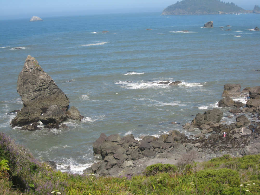 Pilot Rock, the white rock in the upper left, and Trinidad Head, the large rock