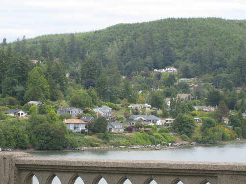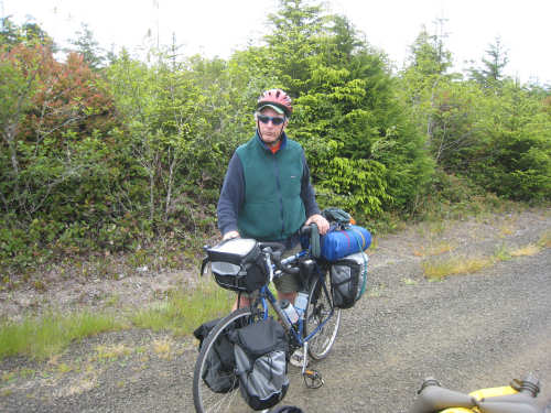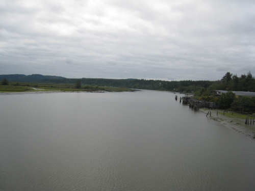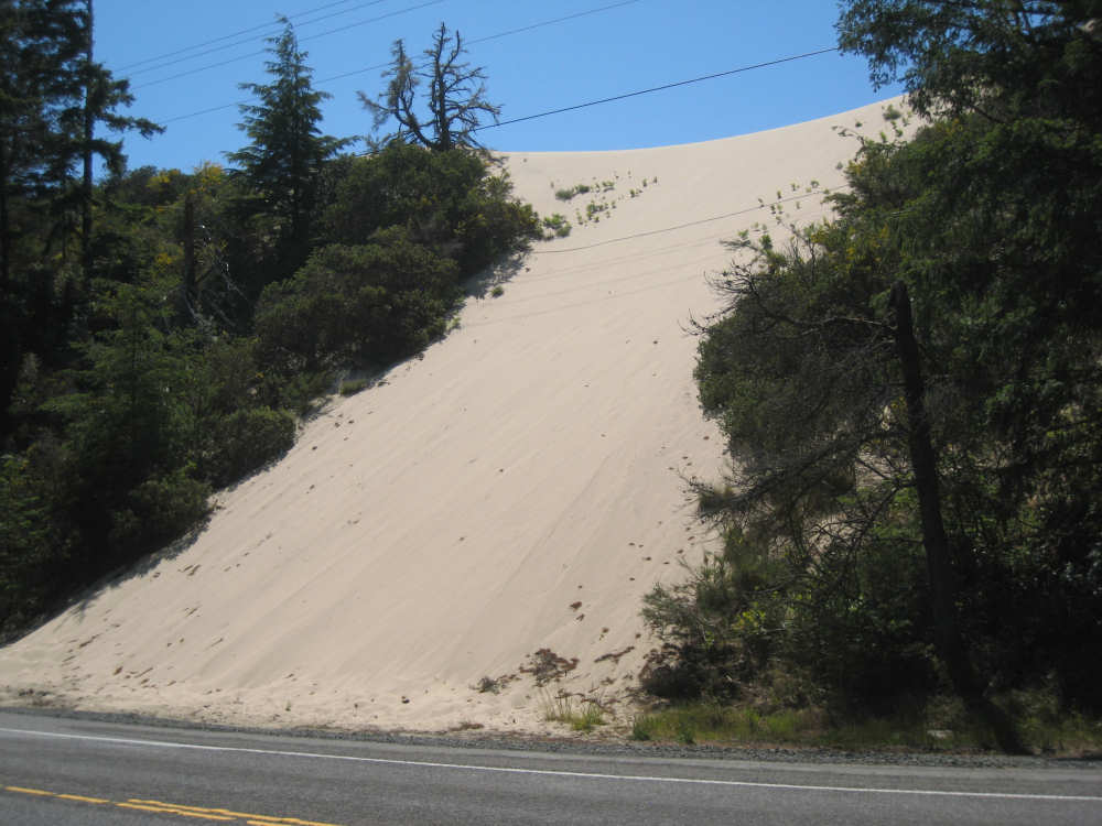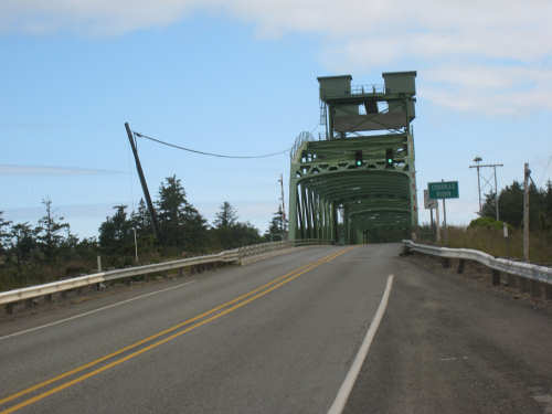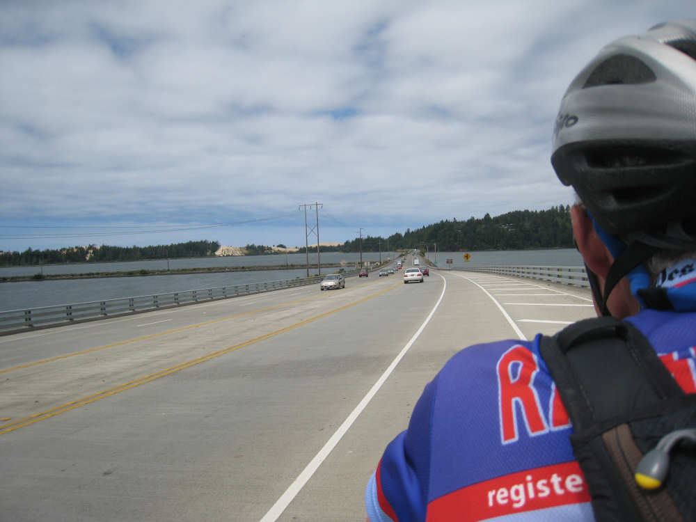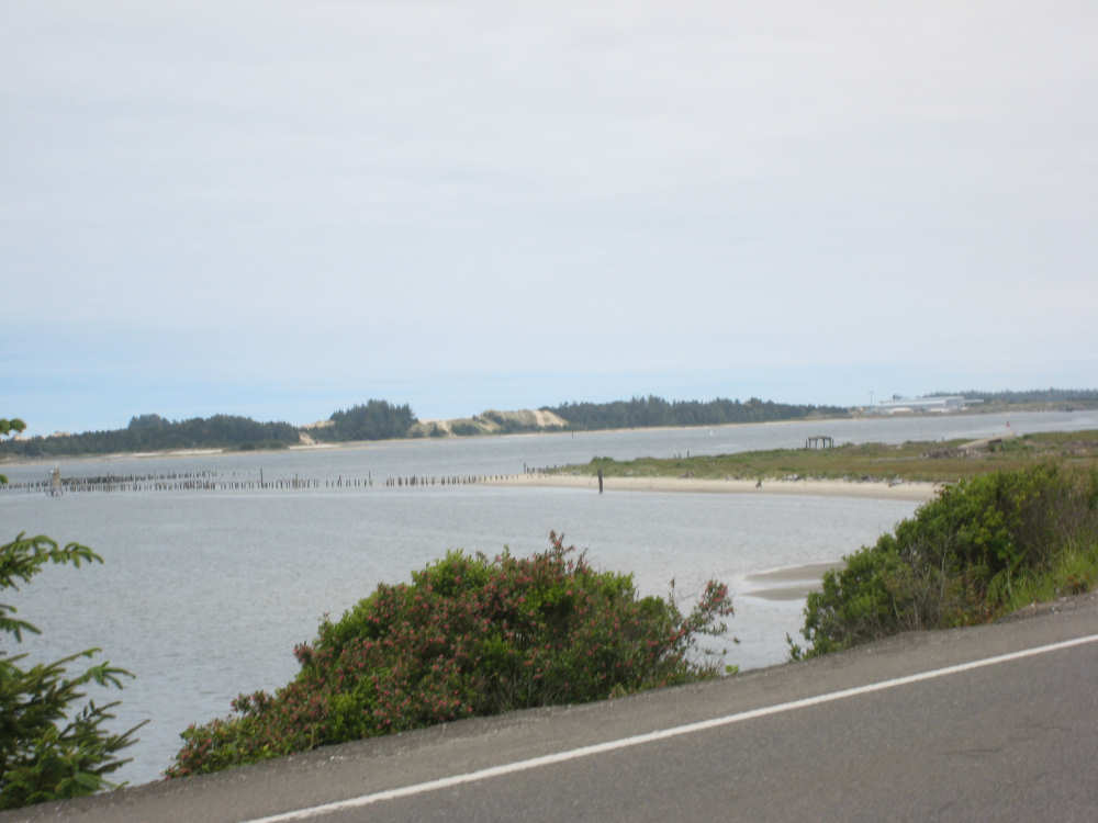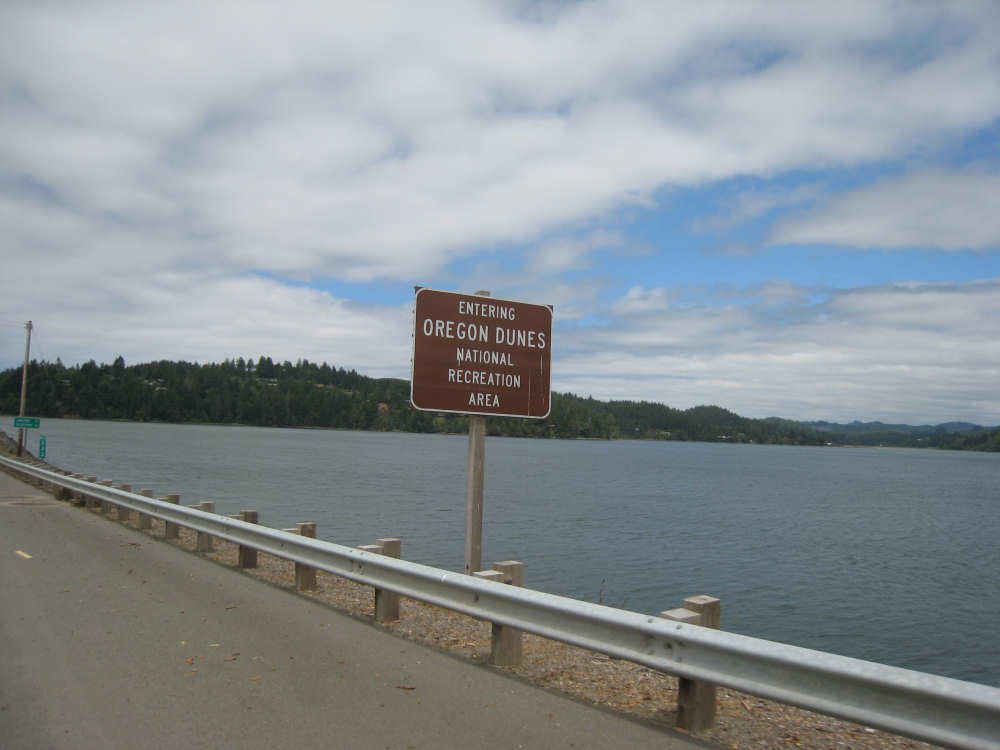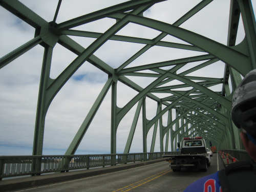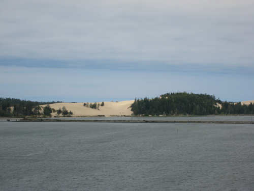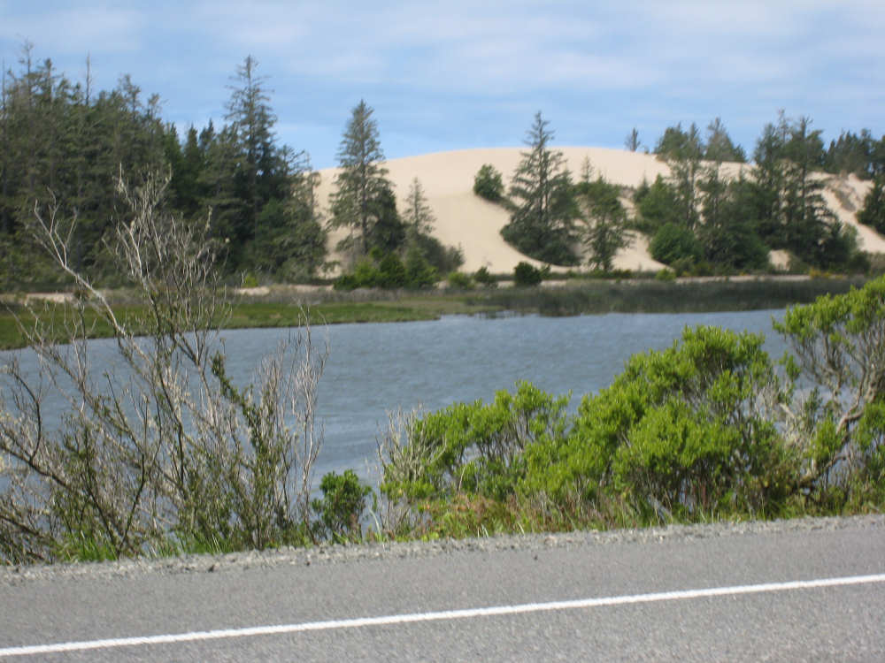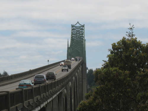 Wednesday, June 18, 2008 We left our motel in Bandon this morning at about 7. It was chilly and cloudy but not very windy. We wandered through the streets toward 101, looking for a breakfast place; a gas station owner told us to head into the Old Town area where we would find a cafe, which we did. The cafe was busy, lots of locals who were interesting to listen to, as well as several tourists. The Old Town was done up in historic style - very cute and artsy. We headed out on 101 for a short ways, but then turned off onto a back road which we would be following for the next 20 miles or so to Charleston, next to Coos Bay. We have gotten pretty paranoid about going on Adventure Cycling-recommended back roads by now, but this one seemed more direct and maybe a little less hilly than 101, so we gave it a try. It wasn't bad, a little rough and narrow, but almost no traffic (except for one stretch that was wider, smoother, and also had more traffic). It was a little hillier than we thought, but nothing major, just a lot of ups and downs. It was also very scenic - lots of wooded hills and deep rolling ravines. There were a few houses here and there and some clear-cut areas that looked quite sad, but otherwise it was beautifully lush and majestic. The highlight of our morning, besides the scenery, was running into 2 sets of bicyclists at the same point on one of these back roads. We had just come up a rise and saw 2 bikes coming up from the other side. We had stopped to take a picture a little ways down from the top and noticed that they were stopping at the top. We biked up the rest of the way and said hello. They were two spry older gents who were out for a ride; the hill they had just come up was a good deal steeper on their side than on ours, so they had stopped for a rest. As we were talking, a second couple of guys came up the hill and stopped to talk, too. They were intrigued by our tandem and our crazy load, not to mention our crazy itinerary. They told us a little about the Coos Bay bridge we would be crossing today and that we had been told we had to walk across; they mentioned that the sidewalk was very narrow, which I didn't like the sound of. After many more ups and downs, we finally came into the town of Charleston, on the Coos Bay, and stopped for lunch. The restaurant had a nice view of the mud flats beside the bay, on which several people were out digging for clams. Our waitress and a few other locals asked about our trip and wished us luck - seemed like a very friendly town. Then we set off for the bridge. The first thing we noticed, besides how big and beautiful it was, was that there was a lot of construction on our side of the bridge. The sidewalk, on which we were presumably supposed to walk, was closed and there wasn't any sign saying we had to walk across. Pat decided the road was wide enough for traffic to get by us, so we headed across (with much trepidation on my part). It was very narrow and cars backed up behind us when there was traffic passing the other way, passing us only when the other lane was clear. There was a fair amount of traffic going both ways. I was busy trying to get pictures while pedaling as fast as I could so we could get over the bridge, but we finally got busted. A loud voice over a bullhorn told us to go to the other side of the bridge and get on the sidewalk there - not an easy thing to do since the sidewalk curb was very high. But we managed and proceeded to walk across the rest of the bridge. There wasn't a lot of room for me to stand in between my handlebars and the panniers in back, and the sidewalk was very narrow as our fellow bikers had said, so once we got over to the downhill side, Pat walked the bike himself and I followed behind making sure it didn't fall over on him. We were relieved to get to the other side. The bridge itself was truely stunning, though. It was a historic bridge under renovation; one of the things they were doing was cleaning the sides of the bridge and the part they had finished was a beautiful white stone, compared to the gray color on the rest of the bridge stone work. The rest of the day was fairly non-eventful. We crossed over the Haynes Inlet next to the Bay and came into the Oregon Dunes National Recreation Area where there are miles and miles of huge sand dunes along the ocean. The sand seemed to swallow up the trees around the dunes in places, and at one point a very tall dune came right up to the road - a very tenuous-looking situation! There were several lakes and creeks along the road as well and it was all very scenic. The sun had finally just begun to come out so it felt a little warmer, but was still pretty cool. The traffic along 101 at this point was fairly heavy which made the afternoon less pleasant than it might have been. We came to the turn-off for Winchester Bay, our evening's destination after passing a large and beautiful lake, aptly called Clear Lake. Winchester Bay is a small fishing town next to the large Umpqua River. We reached our motel about 4 pm after riding a little over 52 miles in a little under 6 hours of bike time, not as good as yesterday, but not bad considering we had about a mile of walking across the bridge. |