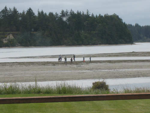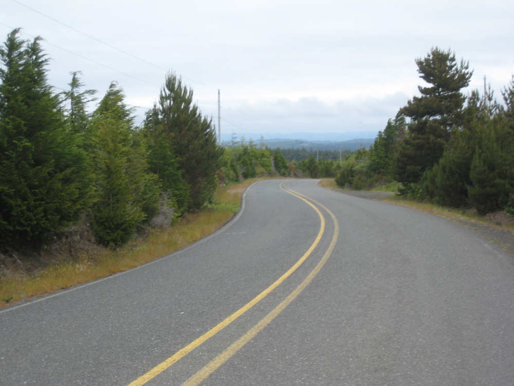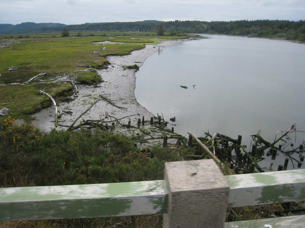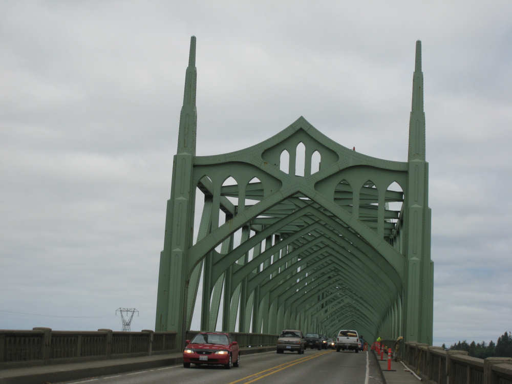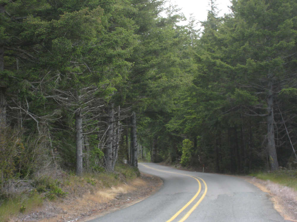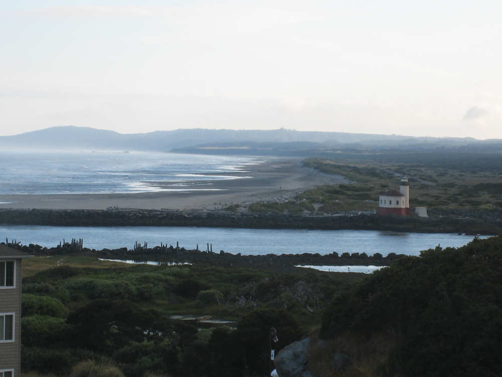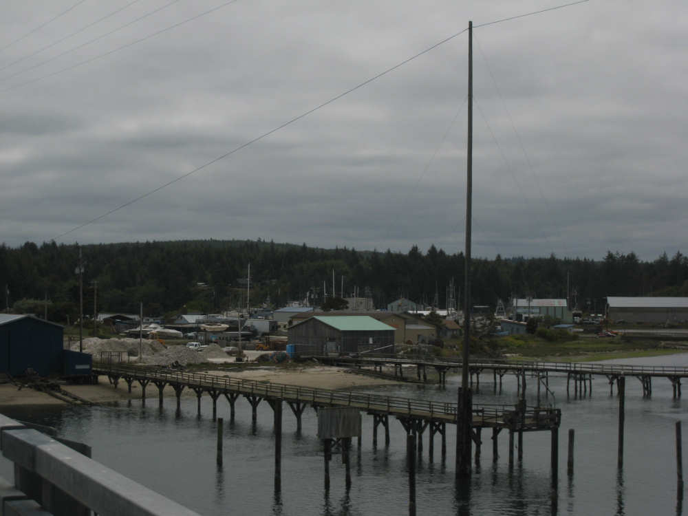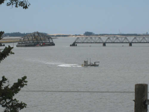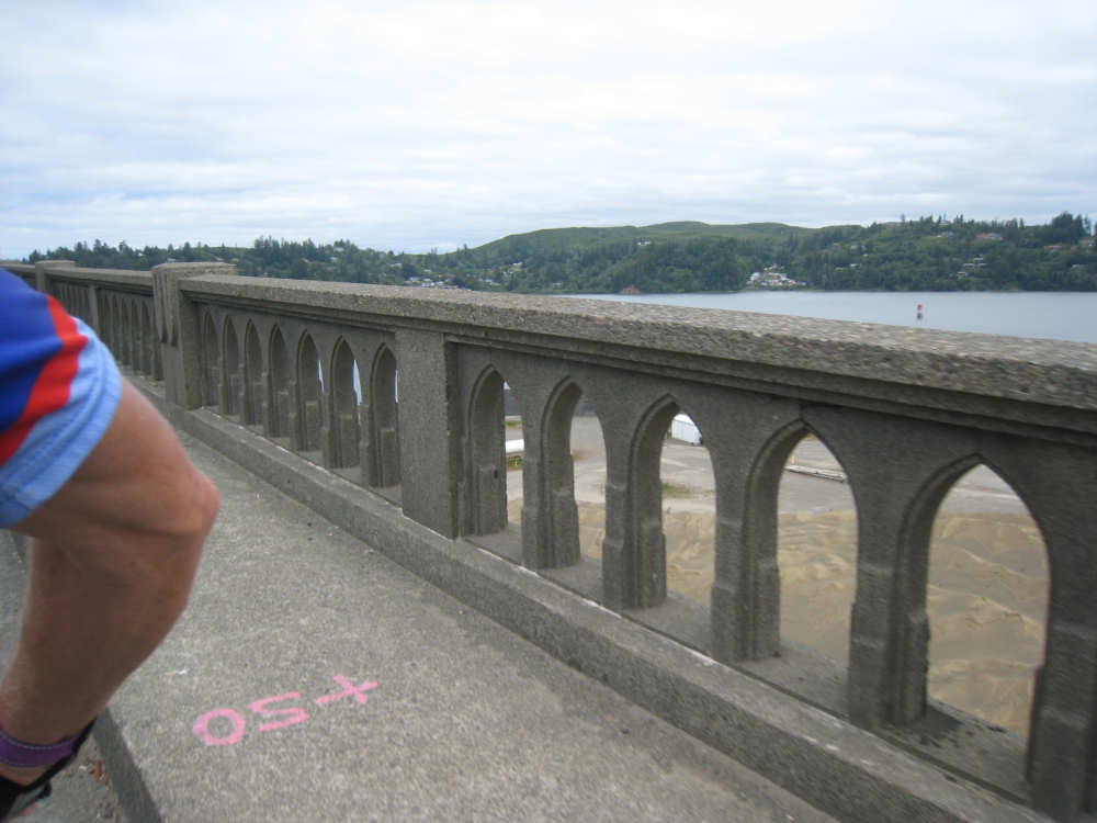 Wednesday, June 18, 2008 We left our motel in Bandon this morning at about 7. It was chilly and cloudy but not very windy. We wandered through the streets toward 101, looking for a breakfast place; a gas station owner told us to head into the Old Town area where we would find a cafe, which we did. The cafe was busy, lots of locals who were interesting to listen to, as well as several tourists. The Old Town was done up in historic style - very cute and artsy. We headed out on 101 for a short ways, but then turned off onto a back road which we would be following for the next 20 miles or so to Charleston, next to Coos Bay. We have gotten pretty paranoid about going on Adventure Cycling-recommended back roads by now, but this one seemed more direct and maybe a little less hilly than 101, so we gave it a try. It wasn't bad, a little rough and narrow, but almost no traffic (except for one stretch that was wider, smoother, and also had more traffic). It was a little hillier than we thought, but nothing major, just a lot of ups and downs. It was also very scenic - lots of wooded hills and deep rolling ravines. There were a few houses here and there and some clear-cut areas that looked quite sad, but otherwise it was beautifully lush and majestic. The highlight of our morning, besides the scenery, was running into 2 sets of bicyclists at the same point on one of these back roads. We had just come up a rise and saw 2 bikes coming up from the other side. We had stopped to take a picture a little ways down from the top and noticed that they were stopping at the top. We biked up the rest of the way and said hello. They were two spry older gents who were out for a ride; the hill they had just come up was a good deal steeper on their side than on ours, so they had stopped for a rest. As we were talking, a second couple of guys came up the hill and stopped to talk, too. They were intrigued by our tandem and our crazy load, not to mention our crazy itinerary. They told us a little about the Coos Bay bridge we would be crossing today and that we had been told we had to walk across; they mentioned that the sidewalk was very narrow, which I didn't like the sound of. After many more ups and downs, we finally came into the town of Charleston, on the Coos Bay, and stopped for lunch. The restaurant had a nice view of the mud flats beside the bay, on which several people were out digging for clams. Our waitress and a few other locals asked about our trip and wished us luck - seemed like a very friendly town. Then we set off for the bridge. The first thing we noticed, besides how big and beautiful it was, was that there was a lot of construction on our side of the bridge. The sidewalk, on which we were presumably supposed to walk, was closed and there wasn't any sign saying we had to walk across. Pat decided the road was wide enough for traffic to get by us, so we headed across (with much trepidation on my part). It was very narrow and cars backed up behind us when there was traffic passing the other way, passing us only when the other lane was clear. There was a fair amount of traffic going both ways. I was busy trying to get pictures while pedaling as fast as I could so we could get over the bridge, but we finally got busted. A loud voice over a bullhorn told us to go to the other side of the bridge and get on the sidewalk there - not an easy thing to do since the sidewalk curb was very high. But we managed and proceeded to walk across the rest of the bridge. There wasn't a lot of room for me to stand in between my handlebars and the panniers in back, and the sidewalk was very narrow as our fellow bikers had said, so once we got over to the downhill side, Pat walked the bike himself and I followed behind making sure it didn't fall over on him. We were relieved to get to the other side. The bridge itself was truely stunning, though. It was a historic bridge under renovation; one of the things they were doing was cleaning the sides of the bridge and the part they had finished was a beautiful white stone, compared to the gray color on the rest of the bridge stone work. The rest of the day was fairly non-eventful. We crossed over the Haynes Inlet next to the Bay and came into the Oregon Dunes National Recreation Area where there are miles and miles of huge sand dunes along the ocean. The sand seemed to swallow up the trees around the dunes in places, and at one point a very tall dune came right up to the road - a very tenuous-looking situation! There were several lakes and creeks along the road as well and it was all very scenic. The sun had finally just begun to come out so it felt a little warmer, but was still pretty cool. The traffic along 101 at this point was fairly heavy which made the afternoon less pleasant than it might have been. We came to the turn-off for Winchester Bay, our evening's destination after passing a large and beautiful lake, aptly called Clear Lake. Winchester Bay is a small fishing town next to the large Umpqua River. We reached our motel about 4 pm after riding a little over 52 miles in a little under 6 hours of bike time, not as good as yesterday, but not bad considering we had about a mile of walking across the bridge. |
