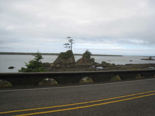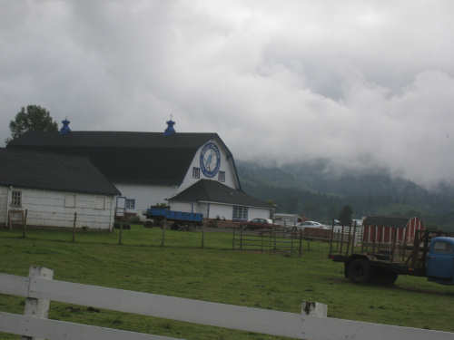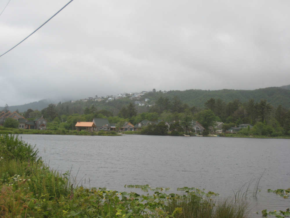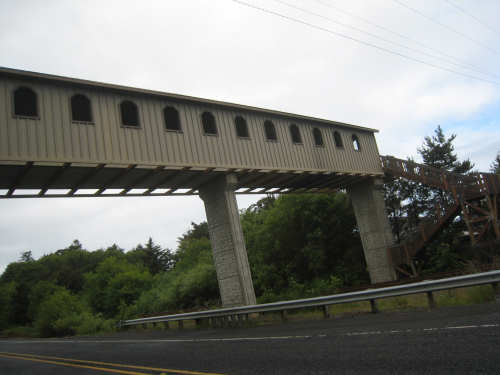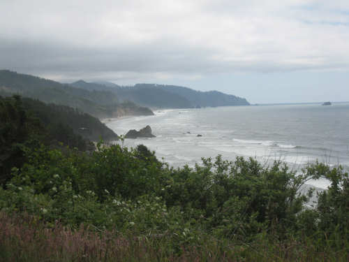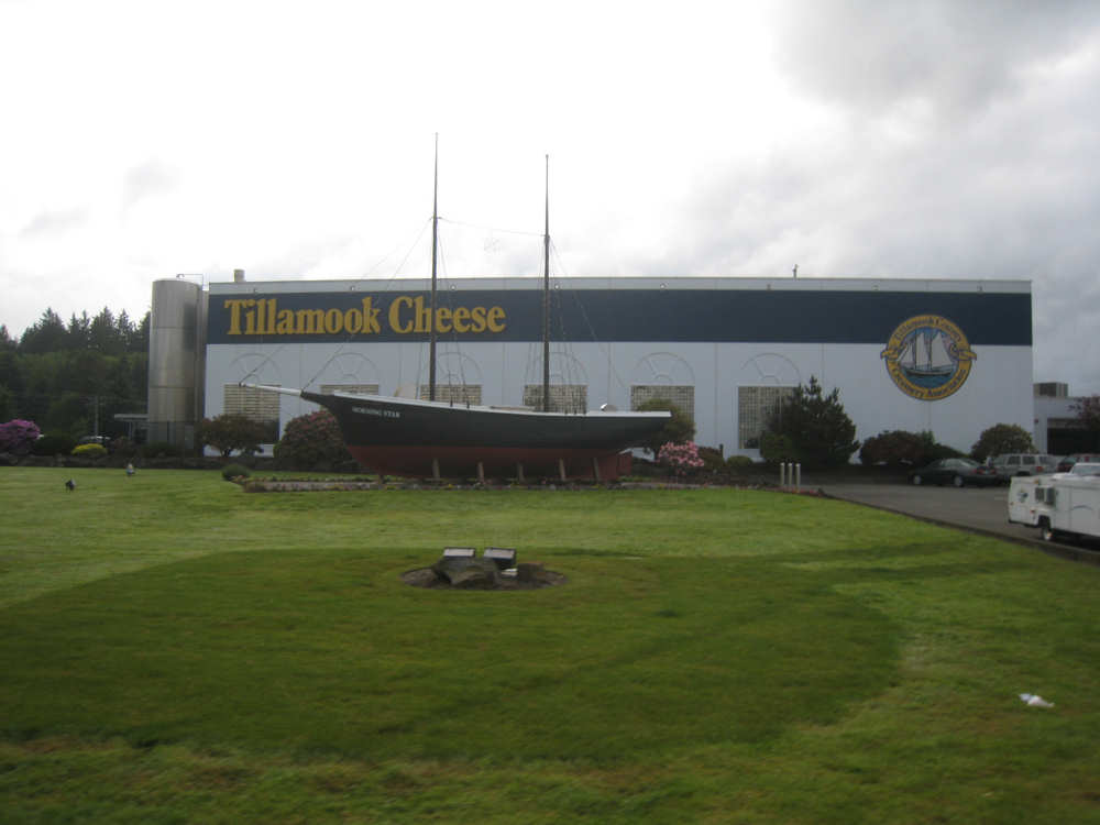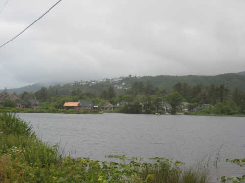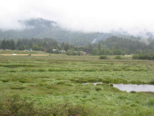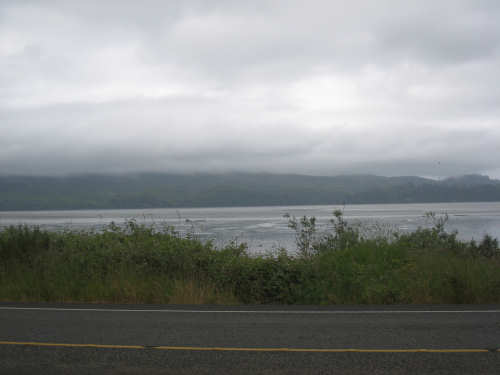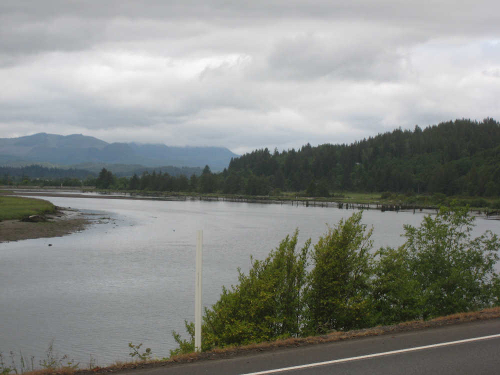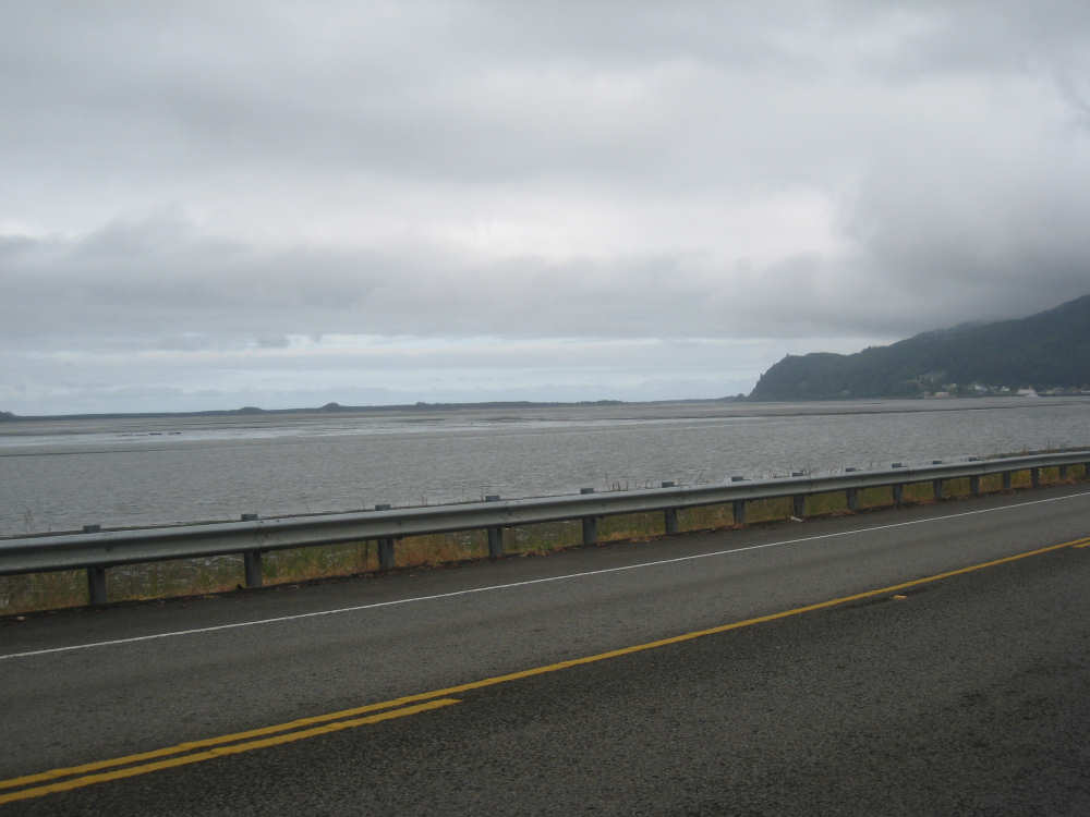 We had a lot of misgivings about today. Our map showed us having 3 big hills in the second half of the day, 2 back-to-back and 1 near the end and lots of little ups and downs all the rest of the day. We had a late start, too, what with having to wait until 7 to get our bike out of the storage room the motel insisted we keep it in, and breakfast not being open until 7 as well (and then we ended up with the most disorganized waiter ever, so not a good start to the day). It had rained a little overnight and the morning was cool and cloudy, not foggy though. We finally set out around 8:30, knowing we had about 25 easy miles until our first climb. We left the town of Tillamook, passing marshy fields with pastures behind them, and tree-covered mountains behind them. Very pastoral. We also passed the Tillamook Cheese factory, a large building with a lovely ship parked in front. We hoped to see the Tillamook Ice Cream factory, but didn't come across it.