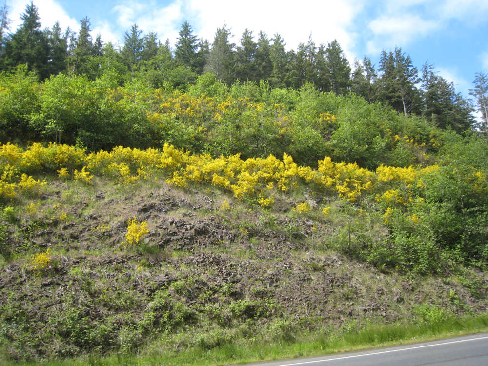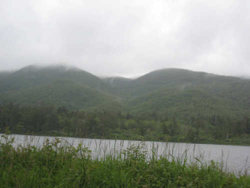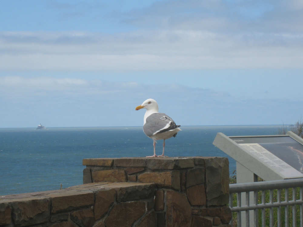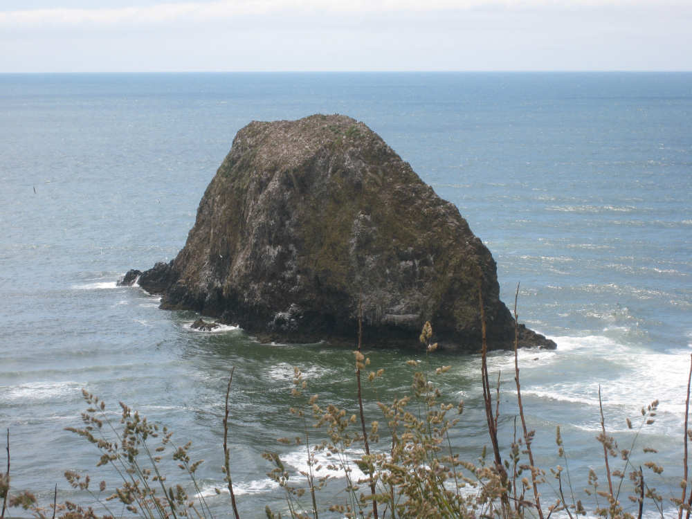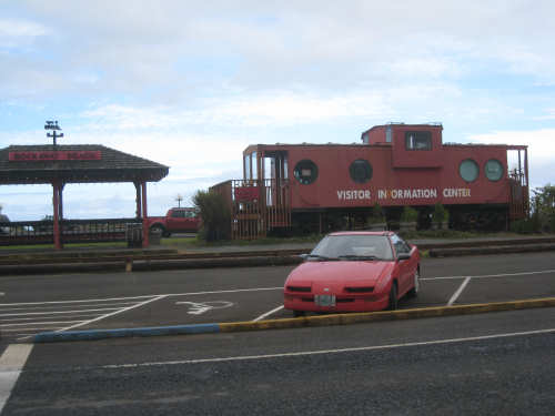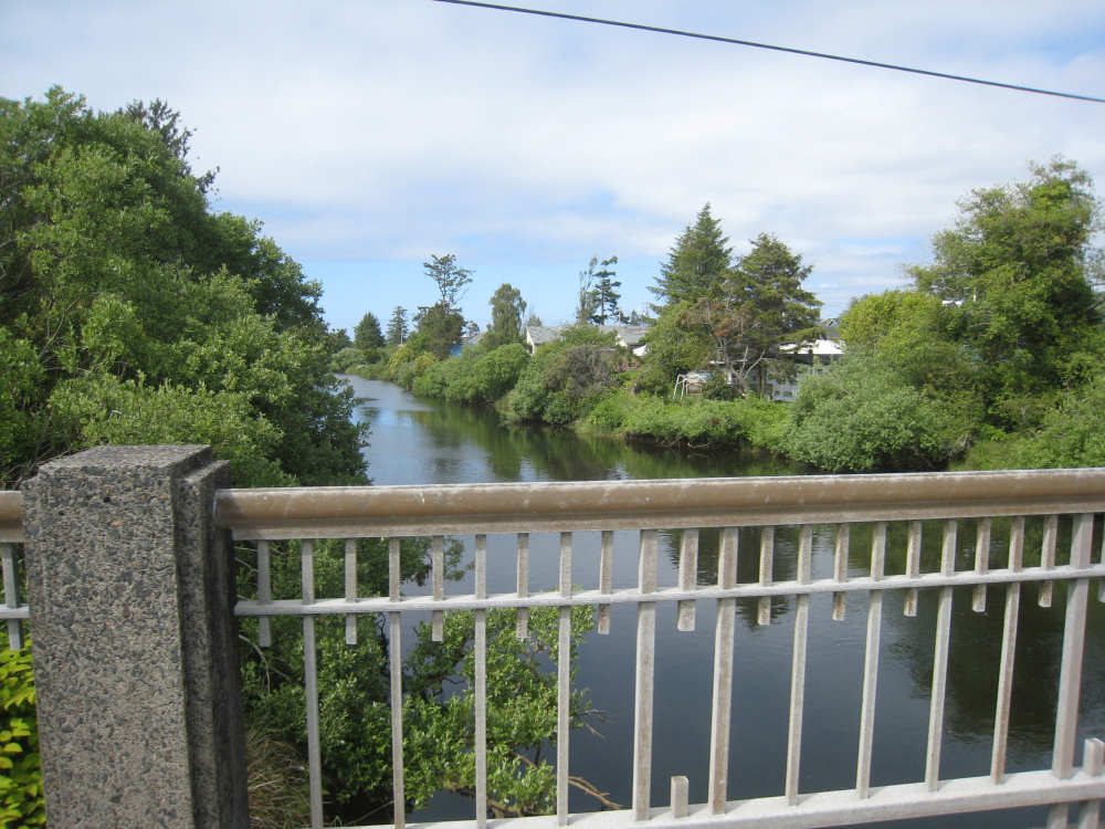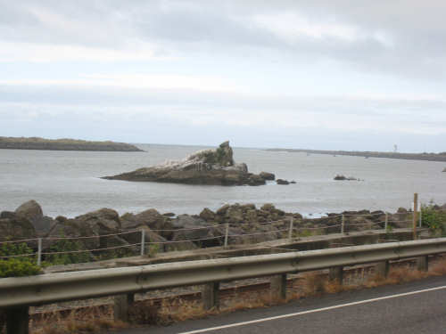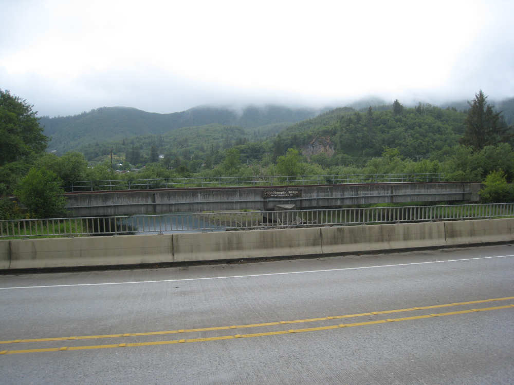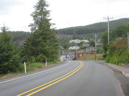 We had a lot of misgivings about today. Our map showed us having 3 big hills in the second half of the day, 2 back-to-back and 1 near the end and lots of little ups and downs all the rest of the day. We had a late start, too, what with having to wait until 7 to get our bike out of the storage room the motel insisted we keep it in, and breakfast not being open until 7 as well (and then we ended up with the most disorganized waiter ever, so not a good start to the day). It had rained a little overnight and the morning was cool and cloudy, not foggy though. We finally set out around 8:30, knowing we had about 25 easy miles until our first climb. We left the town of Tillamook, passing marshy fields with pastures behind them, and tree-covered mountains behind them. Very pastoral. We also passed the Tillamook Cheese factory, a large building with a lovely ship parked in front. We hoped to see the Tillamook Ice Cream factory, but didn't come across it.