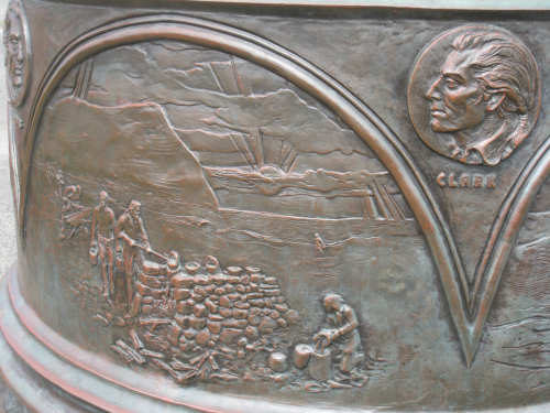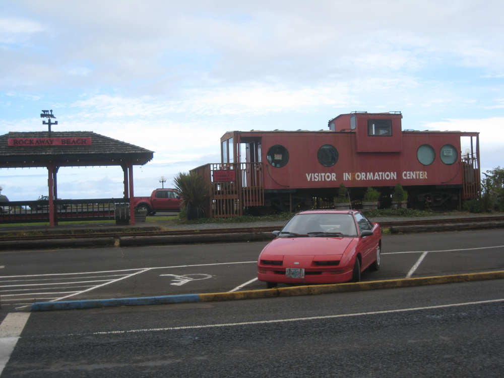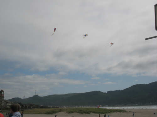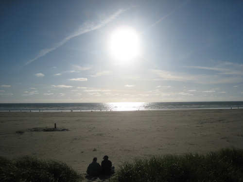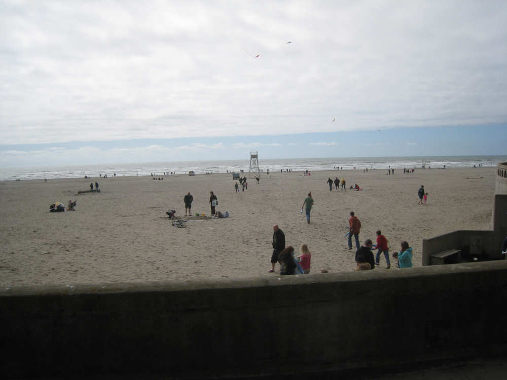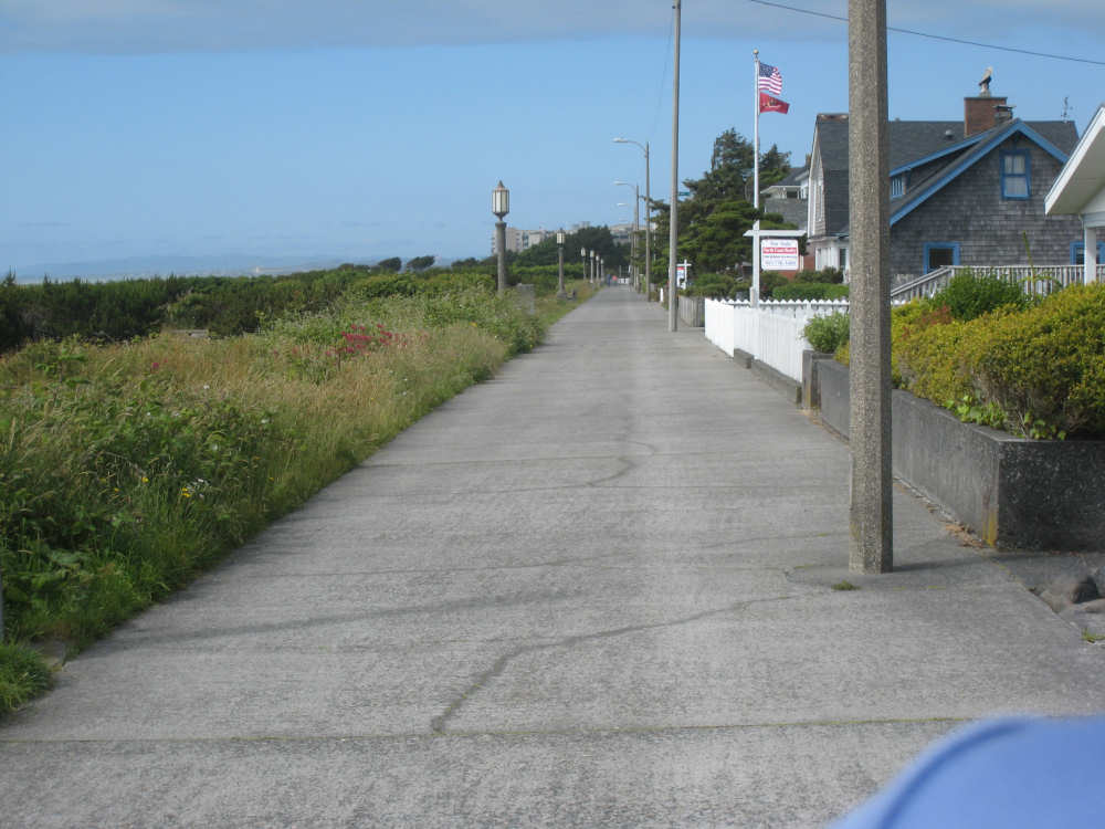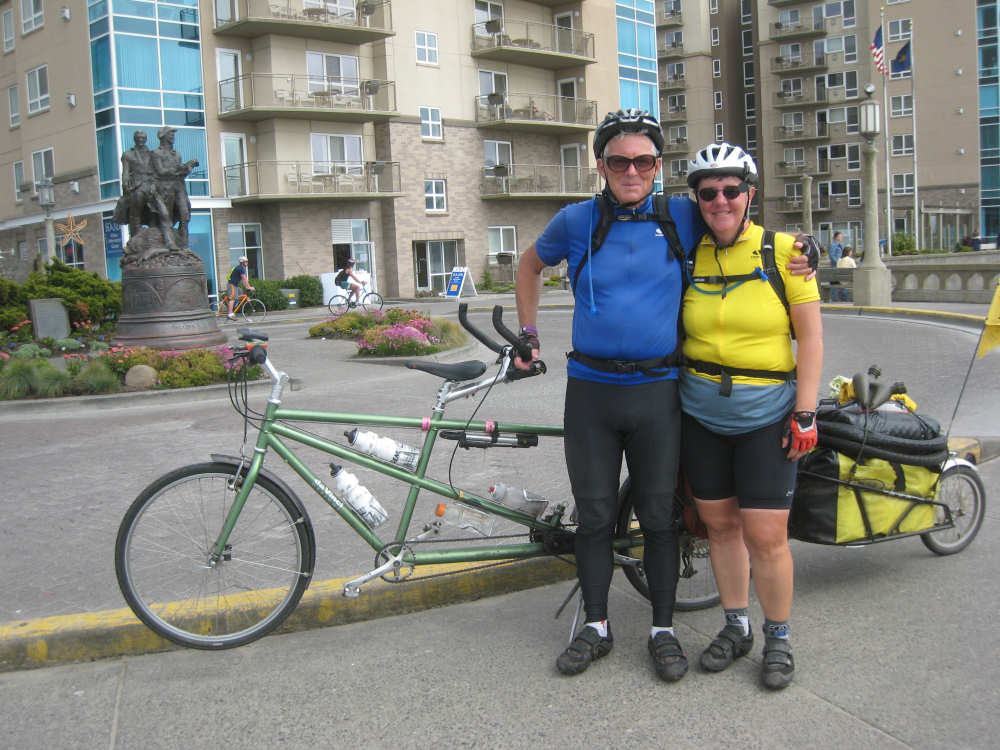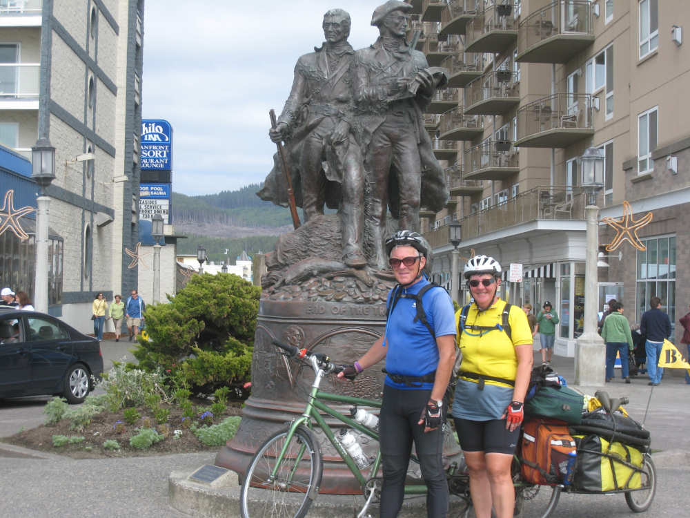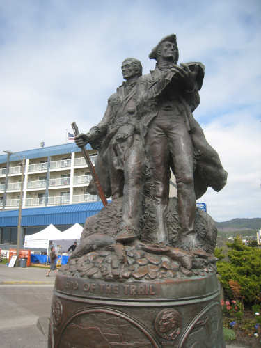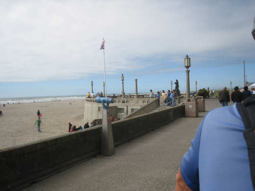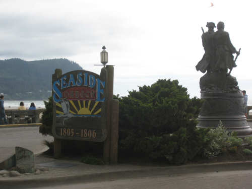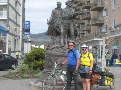 The rest of the journey was rather uneventful. We went through a couple more towns and were by the ocean most of the time but couldn't see much of it with the houses and trees along the road. We went up and down a few small hills and then came to our third big one. This one was even shorter (a little over a mile) and about as steep as the other two, but it seemed a bit harder, probably from our being tireder. We crossed the little Necanicum River and began to get close to Seaside. We started seeing references to the Lewis and Clark trail even before we got to town. We reached the street we were to turn off for the center of town and followed it to the end, turning right onto a walking/biking trail along the ocean, called the Promenade. There were several people on the trail, on the dunes, and on the beach next to the ocean. Shore houses lined the walk along one side. We continued down the trail to Broadway where there was a plaza with a statue of Lewis and Clark, marked End of the Trail. Seaside is where they completed their Northwestern journey, and where they spent a few weeks preparing for the trip back. One of their primary activities here was boiling sea water to make salt. We had two nice people take our picture at the statue and we took a number of pictures of the beach and the statue before heading to our motel. We lucked out again on the motel, the Hillcrest Inn - the owner was so impressed with our rig and our trip that he gave us a free upgrade to a room with a jacuzzi-type tub and some bath salts for it. It is a very comfortable and very friendly place. We strolled into town, a lively resort town, for dinner and then headed back to the Promenade again for more pictures.
