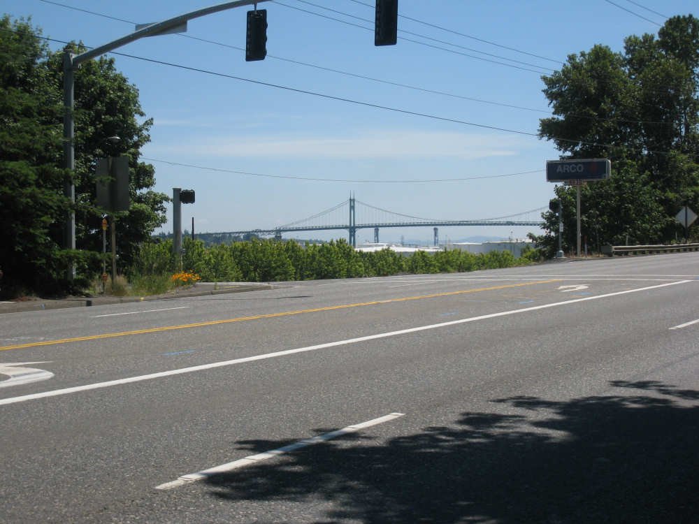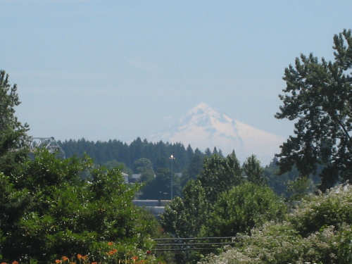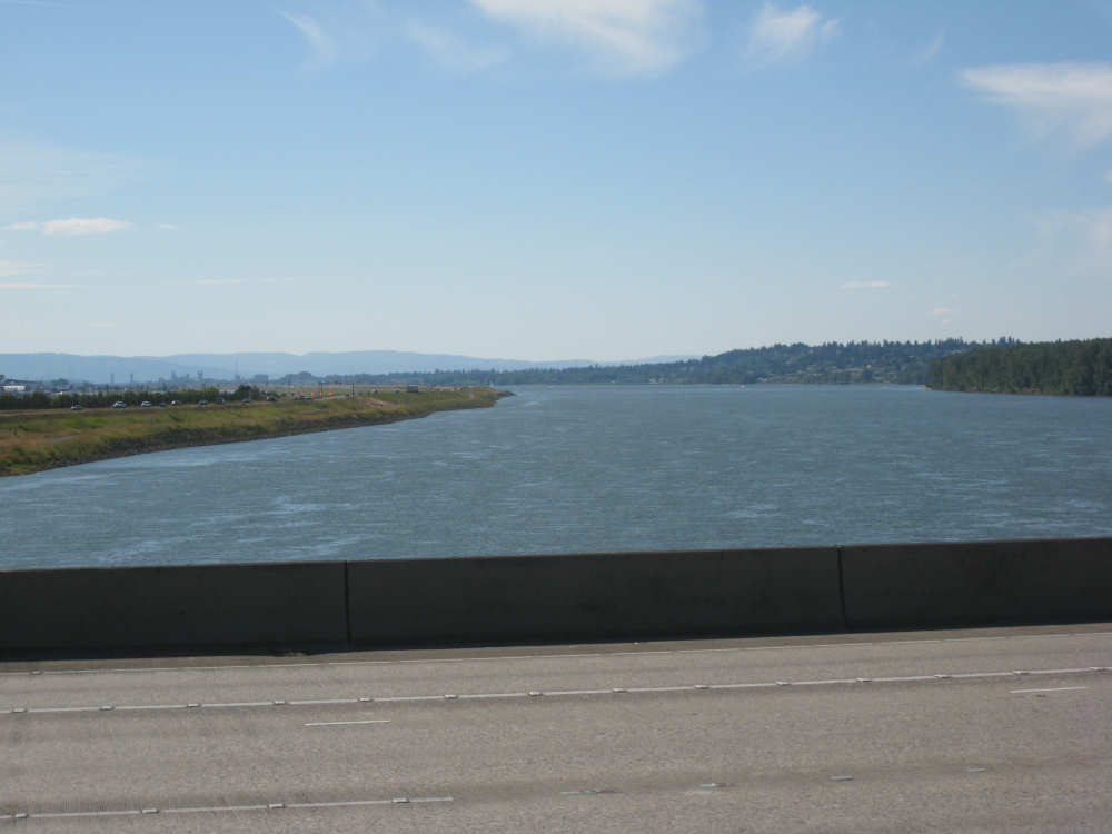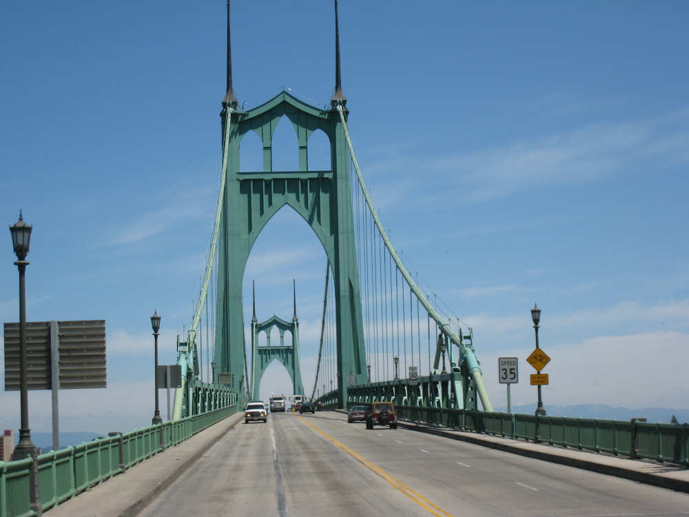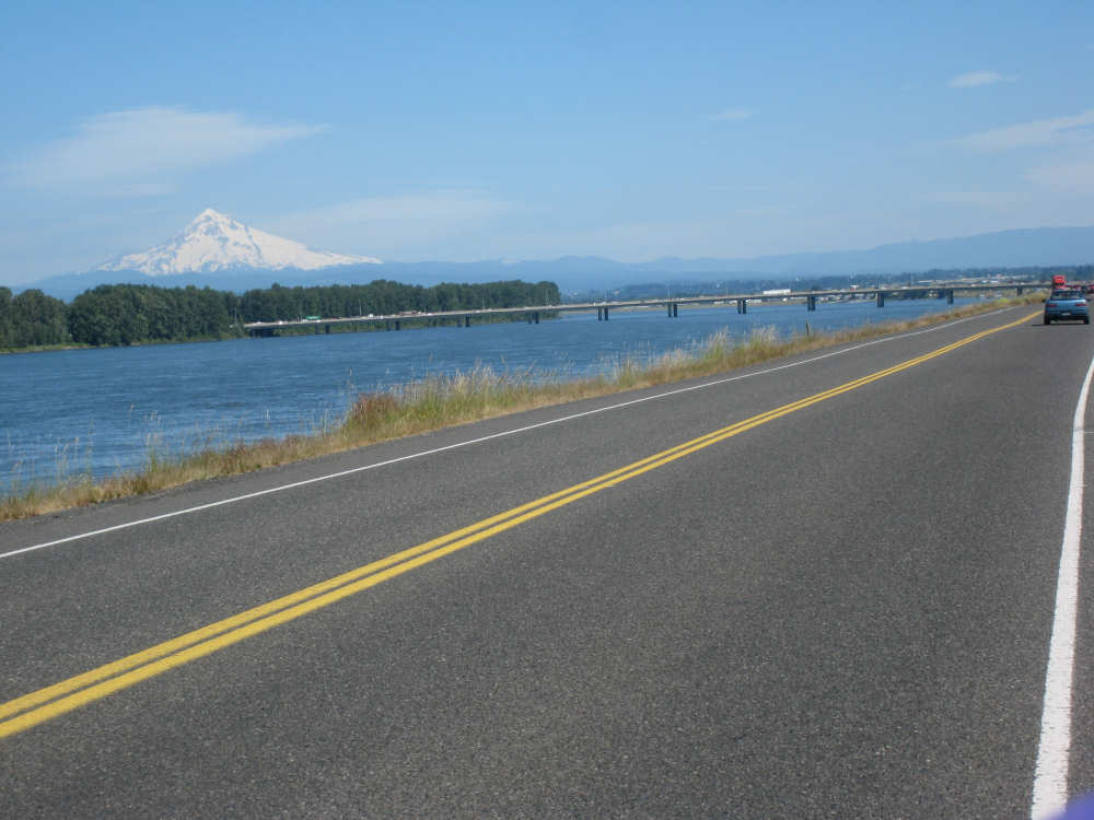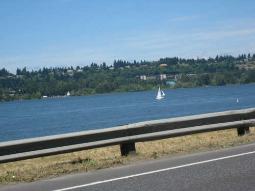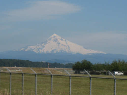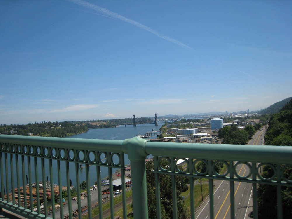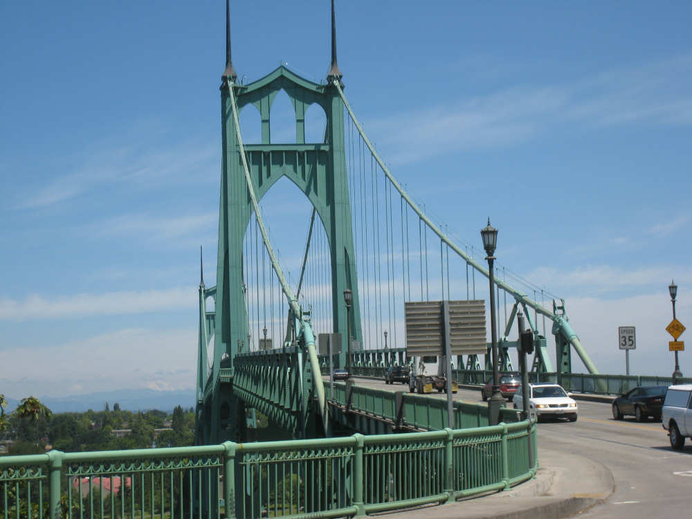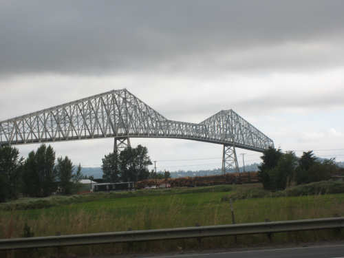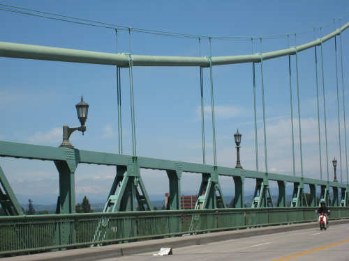 Wednesday, June 25, 2008 Yep, today started out chilly and cloudy, but it cleared up again mid-morning and became quite warm by mid-afternoon. We didn't see any temperature readings then, but it felt like high 80's by the time we ended the day. We left Longview around 7:30, having had breakfast at a place right next to our motel, and headed back over that really high bridge back into Oregon. The traffic was fairly light this morning so it didn't rattle nearly as much, thankfully. There were huge stacks of logs on the Washington side of the river, maybe even more so than the Oregon side. We followed the Columbia again today, not close enough to see a lot of the time. We did see marshes and valleys and lots of forests, though. At one point, we startled a blue heron who flew off a little ways and settled back down again in the high grasses. We stopped to see if I could get a photo without scaring him off and I did manage to get one before his mate came squawking over and the two of them flew off. Unfortunately, I didn't get one of the two of them in flight. We passed through a few small towns again today, stopping to eat lunch at one of them. Pat noticed the front tire was soft and we kept riding until we got to the next town, St. Helens, thinking we'd find a good place to sit and change it. What we found was a bike shop and Pat decided it would be nice to let someone else fix it so we went in. After a long struggle (our Kevlar tires are hard to get on and off), we had a new inner tube on and we stopped next door at a Chicago-style sandwich shop for lunch. This was the second time Pat let someone else change a tire for him, the last time being in Tempe, AZ when we had to get a new rim for the front tire, and this time ended the same as the last one - after another 30 miles or so, the tire blew and he had to change it again. We had a long day today, 68 miles, the longest we've done in a while. The route was mostly quite flat so it went fairly quickly and uneventfully. We approached Portland after about 48 miles and meandered through its residential streets for about 10 more miles, passing a bit of the University of Portland. We began to see glimpses of snow-covered Mount Hood in the distance; it looked quite ethereal, a large white peak hovering against a pale blue sky. We had to go across the St. John's bridge across the Willamette River, an offshoot of the Columbia, to get into Portland. The bridge was a beautiful old bridge, designed by the same person who designed the Golden Gate, we found out later. The road to the bridge and the bridge itself were both quite narrow and had lots of traffic, including a fair number of trucks. The bridge, at least, had two lanes each way but no shoulder, so we had to take up a whole lane. Luckily, it was pretty short. From there, we worked our way back over to the Columbia River and had an early dinner at a place on the river. Then we headed along the river to 205, getting much better views of Mount Hood as well as the Portland airport, which we went right by. After some difficulty, we found our way onto the bike path for 205. It turned out to be a lane in-between the north- and south-bound lanes of traffic. We were glad to be out of the traffic, because at this point it was rush hour and there were lots of cars zooming both ways between Portland and Vancouver, on the Washington side. The bridge was low on the water (which I liked) but tended uphill towards Washington, the most climb we'd had all day. It was a long bridge, about 2 miles, and crossed an island midway. This bike path is where our tire went, so at least we were out of traffic when we had to change it. We had a little difficulty finding our way around after we reached the Washington side, but we managed to find Dick and Dorothy's home after a bit, arriving around 6 pm. Dorothy had some delicious home-made strawberry cheesecake waiting for us, just the thing after a long, hot day of riding. We quickly felt at home and had a nice chat with the two of them over cheesecake and coffee. Then we set to work on our website and went to bed. We finished the day at 68 miles in 6-1/4 bike hours, a good average considering how long a day it was. Tomorrow, we continue to relax at Dick and Dorothy's for our rest day. |