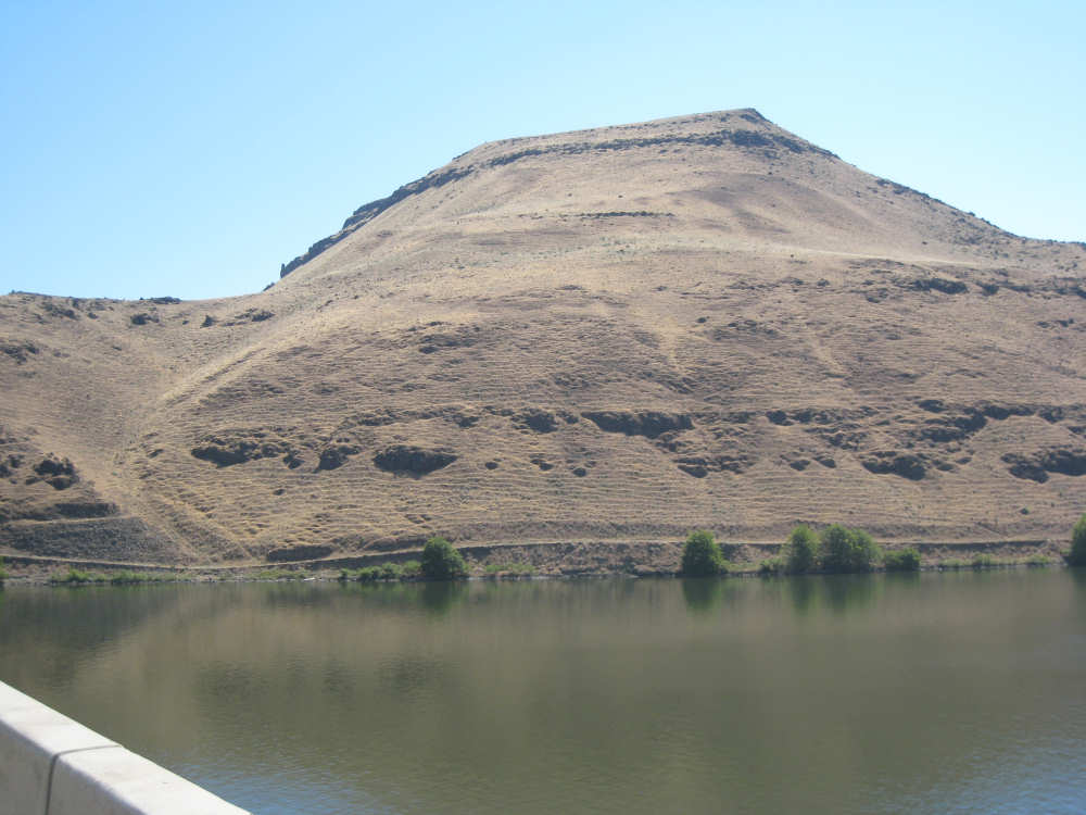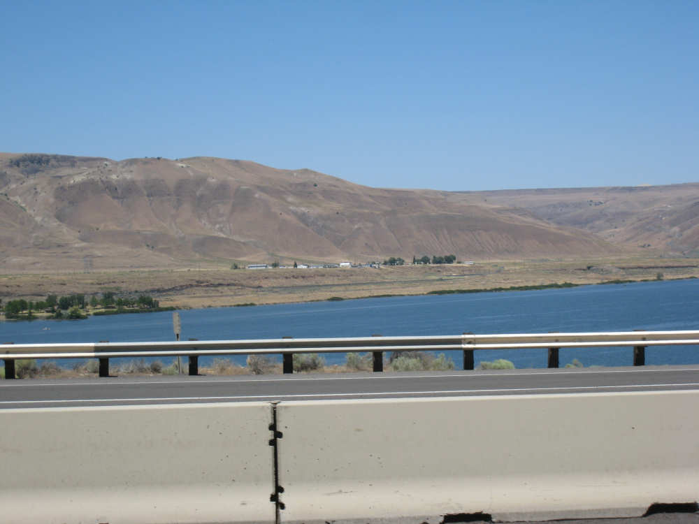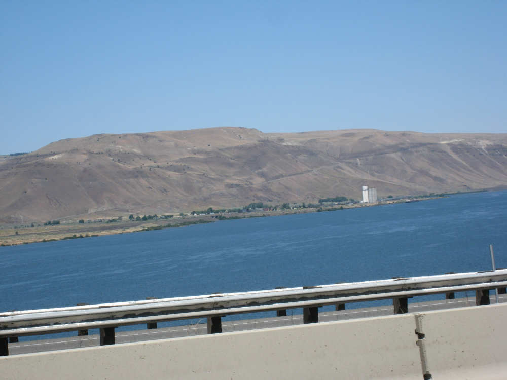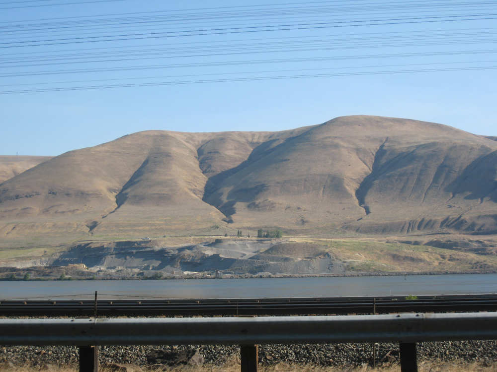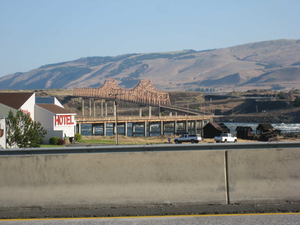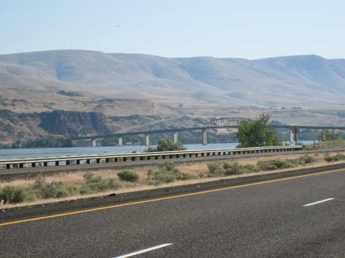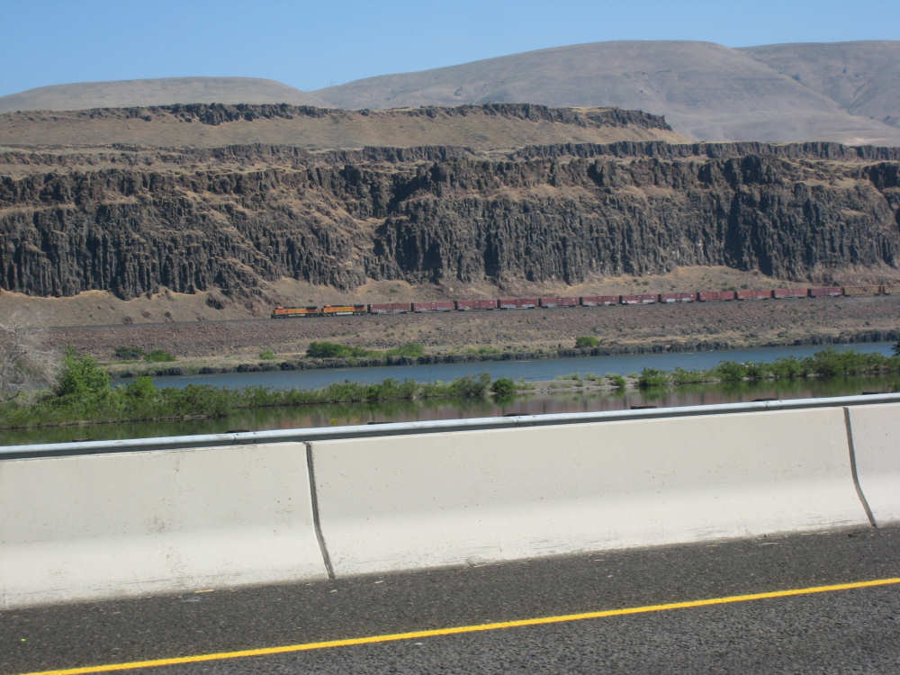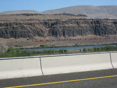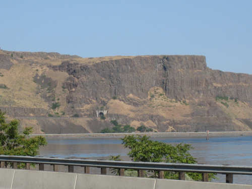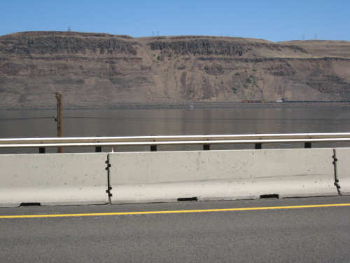 Sunday, June 29, 2008 OK, we are total, total wimps. You may have noticed we're not in a park in West Roosevelt. Well, last night as we checked today's route again and I was fussing about the 55 miles in 100+ heat and chance of thunderstorms and lots of hills ending up with tenting in a town park with no facilities, Pat noticed that there was a little town across the river from West Roosevelt and wondered why we couldn't just stay in Oregon on I-84 again today and stop there. We found a motel in town and they had an opening so here we are! About half the climb and we are in an air-conditioned motel room with a restaurant right next door (I just heard the first thunderclap). This change makes tomorrow's route shorter, too, since we would have been in Washington all day, popping back into Oregon for our motel. This way, we'll stay in Oregon, mostly on I-84 and then on 730 which heads straight into Umatilla. We started out early this morning, leaving The Dalles at 7 am, and got to Arlington at 1:45, so we weren't out in the worst part of the heat for long. Tomorrow, we hope to do the same, and with only 48 miles to go, we should make it in even earlier. The next two days after that, though, are both 75 mile days and there's not much we can do about that, so we're hoping the temperatures cool off some by then. So, today we were on I-84 all day, right next to the Columbia River on the Oregon side. The Washington side was pretty spectacular, mostly huge, brown grass-covered hills that seemed to go right down to the river. Somehow they carved out a railroad track close to the river and we saw lots of trains going by. Hwy. 14 (the one we were supposed to be on) also runs along there, higher up in the hills. We rarely saw cars and trucks going by there and often couldn't even tell where the road could be. We took lots of pictures of the Washington hills because they were so impressive, and a few have trains or trucks going by to try to give a sense of the scale. You'll probably have a hard time seeing them, they look miniscule. The Oregon side was equally impressive, mainly for the basalt cliffs that were still prevalent. There were a few places, especially toward the end of the day, where the hills were rounded, brown grassy slopes like Washington's, but mostly it was very rocky. We saw a deer, a blue heron, a hawk and lots of smaller birds and squirrels. We hope you're not getting tired of hills and river, because that's mostly what we have again in today's pictures. We also saw a few interesting bridges across the river, and a couple of large dams, as well as some side rivers and channels. We're still finding it fascinating so we hope you do too. We ended the day at a little under 54-1/2 miles in slightly over 5 hours of bike time, certainly a lot better than we could have done on the Washington side. And it's raining and very windy out at the moment. |