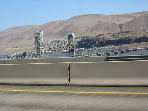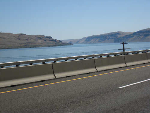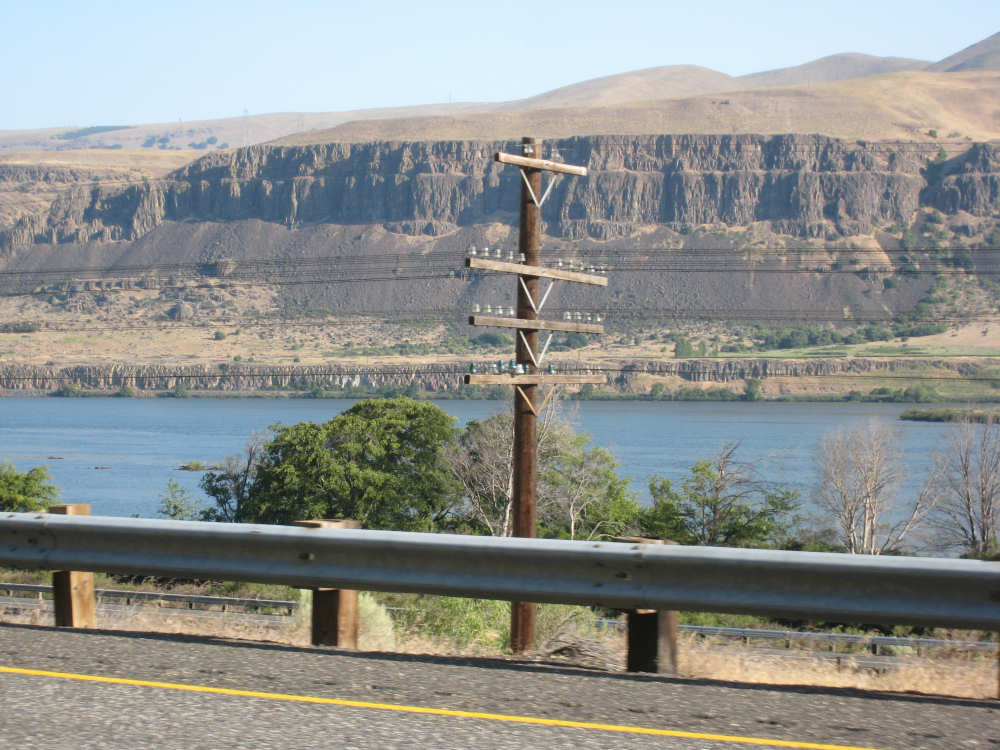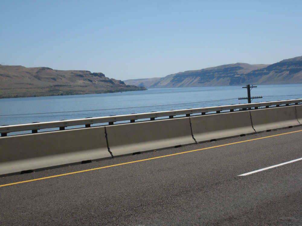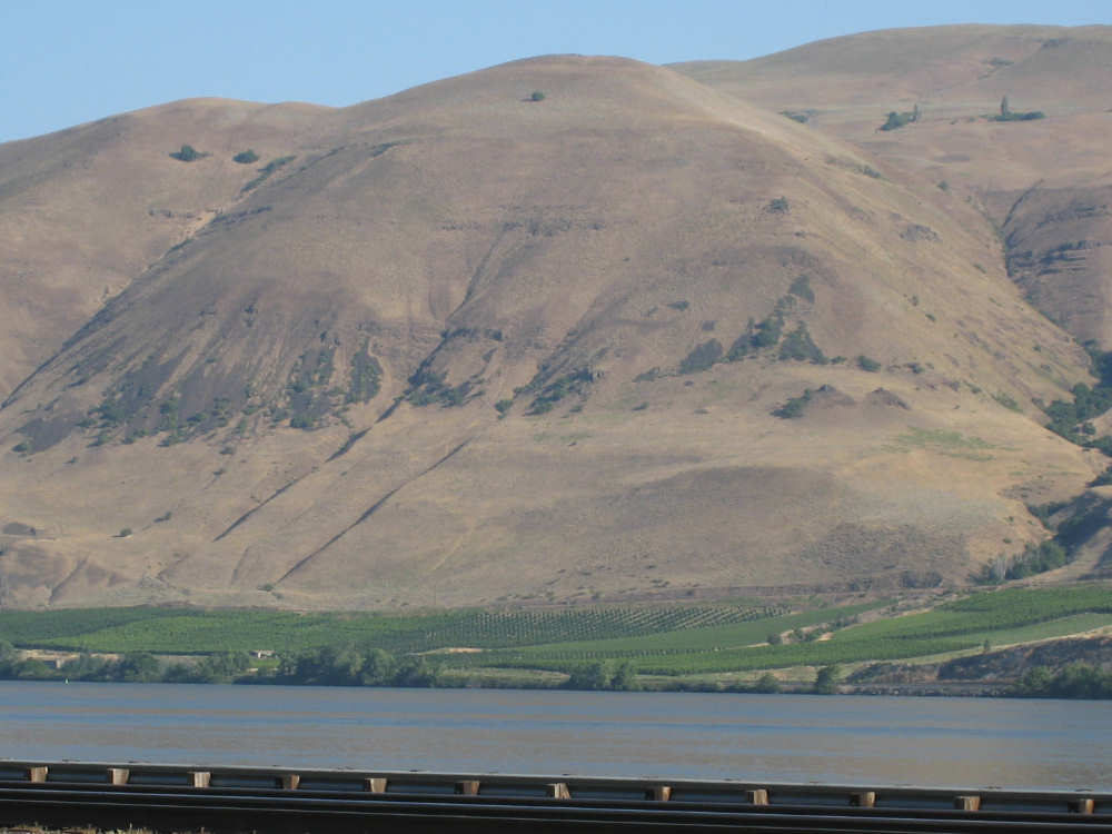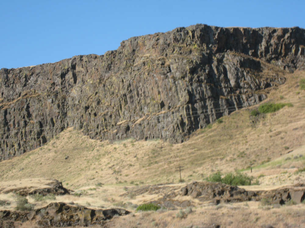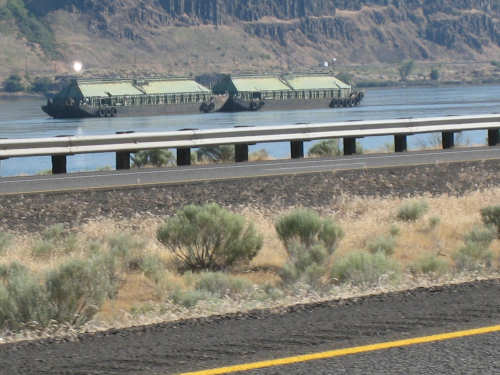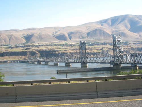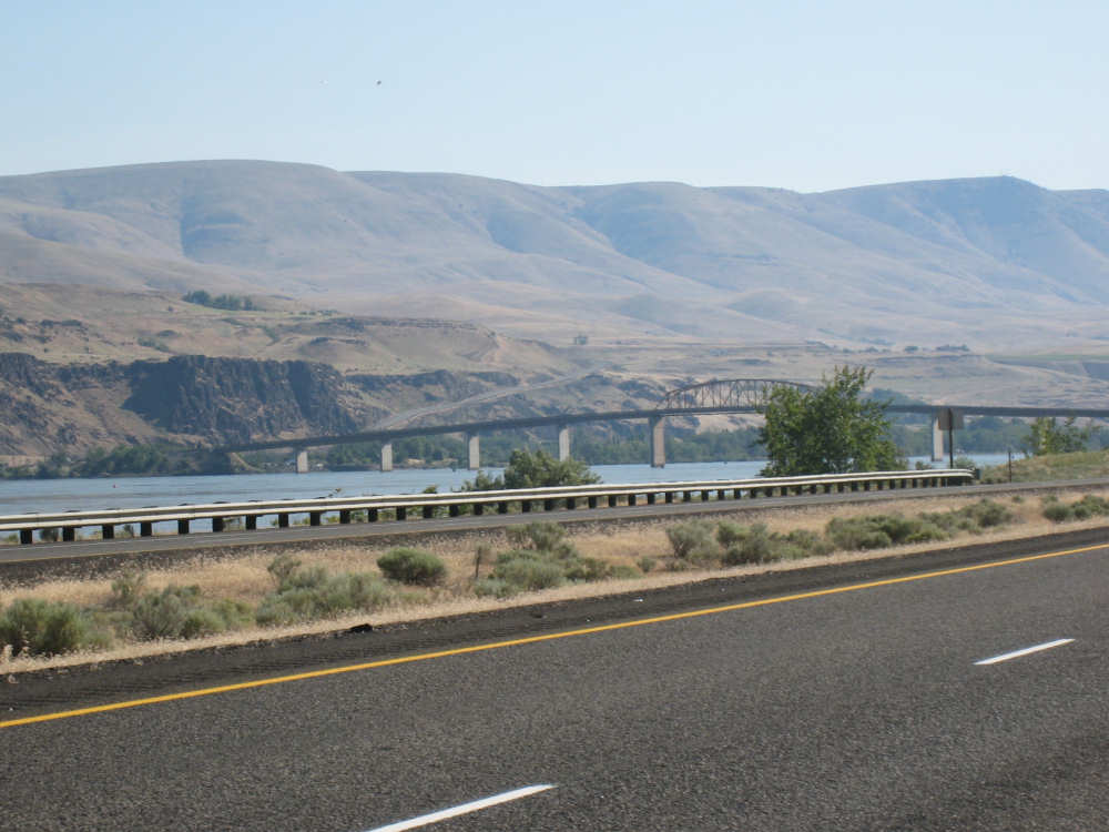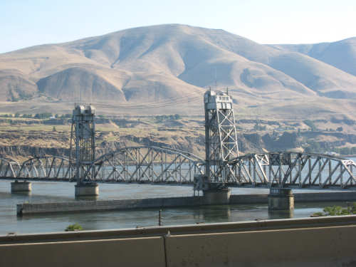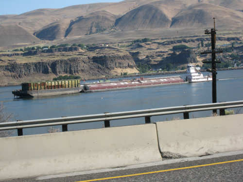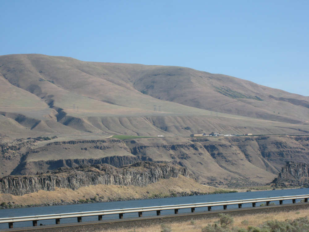 Sunday, June 29, 2008 OK, we are total, total wimps. You may have noticed we're not in a park in West Roosevelt. Well, last night as we checked today's route again and I was fussing about the 55 miles in 100+ heat and chance of thunderstorms and lots of hills ending up with tenting in a town park with no facilities, Pat noticed that there was a little town across the river from West Roosevelt and wondered why we couldn't just stay in Oregon on I-84 again today and stop there. We found a motel in town and they had an opening so here we are! About half the climb and we are in an air-conditioned motel room with a restaurant right next door (I just heard the first thunderclap). This change makes tomorrow's route shorter, too, since we would have been in Washington all day, popping back into Oregon for our motel. This way, we'll stay in Oregon, mostly on I-84 and then on 730 which heads straight into Umatilla. We started out early this morning, leaving The Dalles at 7 am, and got to Arlington at 1:45, so we weren't out in the worst part of the heat for long. Tomorrow, we hope to do the same, and with only 48 miles to go, we should make it in even earlier. The next two days after that, though, are both 75 mile days and there's not much we can do about that, so we're hoping the temperatures cool off some by then. So, today we were on I-84 all day, right next to the Columbia River on the Oregon side. The Washington side was pretty spectacular, mostly huge, brown grass-covered hills that seemed to go right down to the river. Somehow they carved out a railroad track close to the river and we saw lots of trains going by. Hwy. 14 (the one we were supposed to be on) also runs along there, higher up in the hills. We rarely saw cars and trucks going by there and often couldn't even tell where the road could be. We took lots of pictures of the Washington hills because they were so impressive, and a few have trains or trucks going by to try to give a sense of the scale. You'll probably have a hard time seeing them, they look miniscule. The Oregon side was equally impressive, mainly for the basalt cliffs that were still prevalent. There were a few places, especially toward the end of the day, where the hills were rounded, brown grassy slopes like Washington's, but mostly it was very rocky. We saw a deer, a blue heron, a hawk and lots of smaller birds and squirrels. We hope you're not getting tired of hills and river, because that's mostly what we have again in today's pictures. We also saw a few interesting bridges across the river, and a couple of large dams, as well as some side rivers and channels. We're still finding it fascinating so we hope you do too. We ended the day at a little under 54-1/2 miles in slightly over 5 hours of bike time, certainly a lot better than we could have done on the Washington side. And it's raining and very windy out at the moment. |