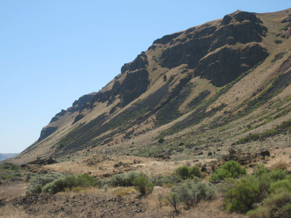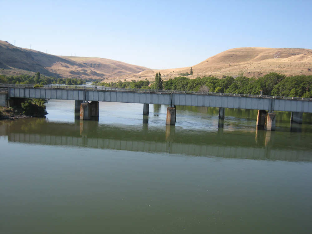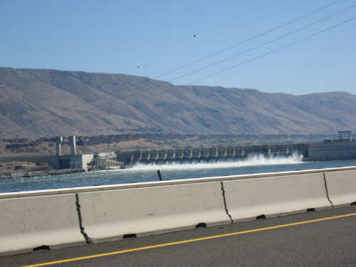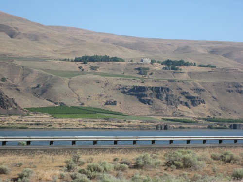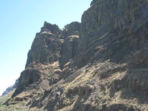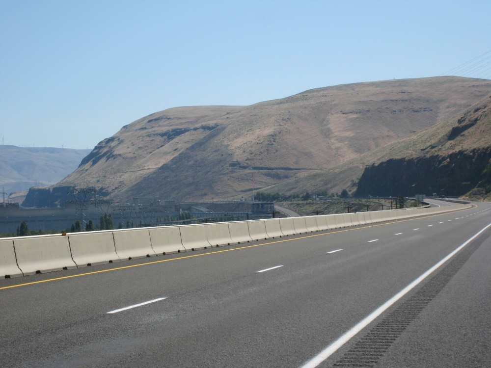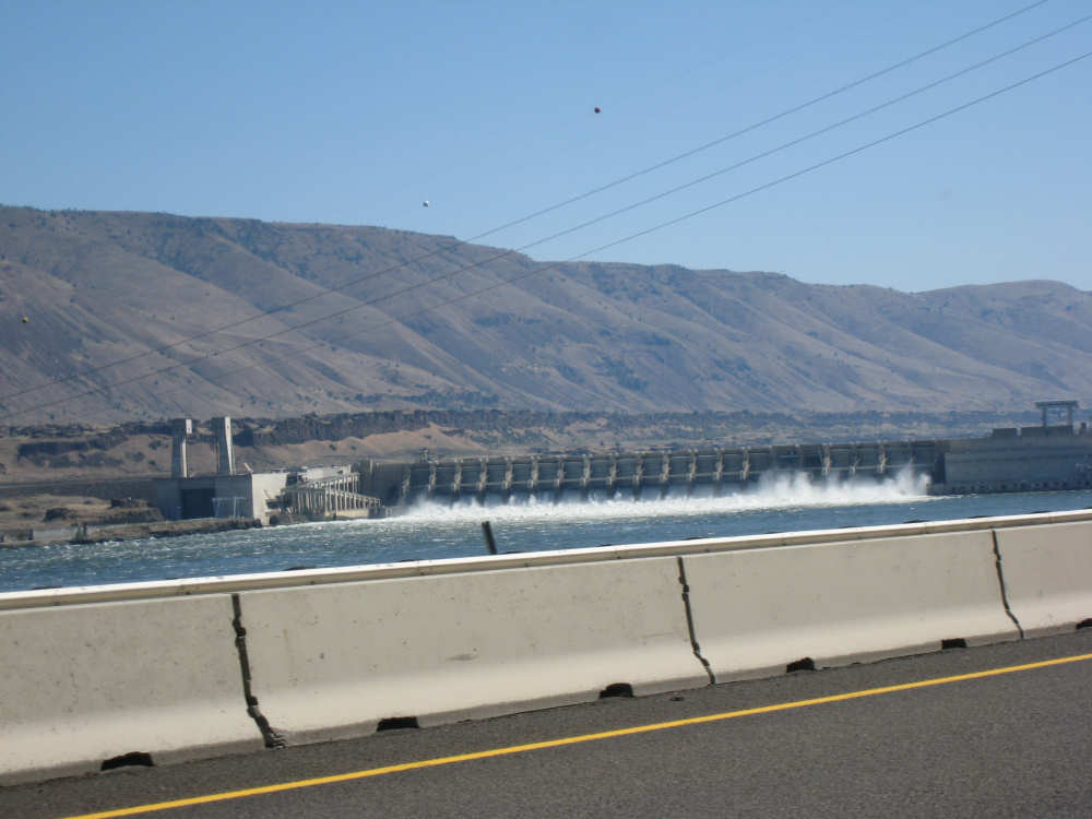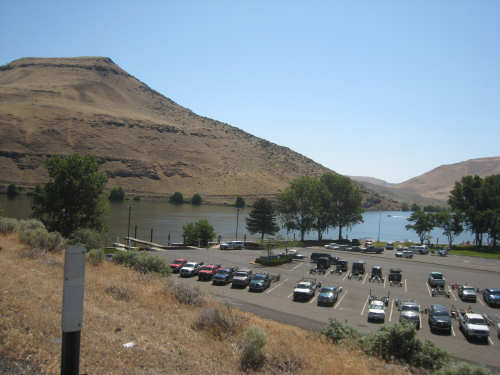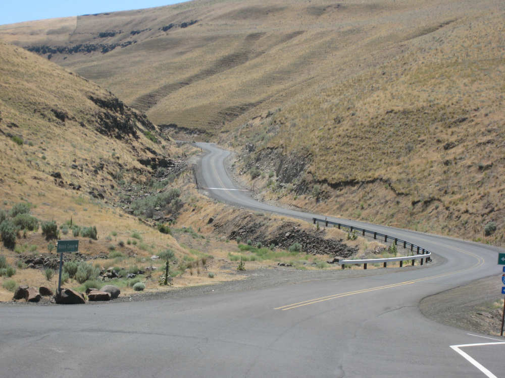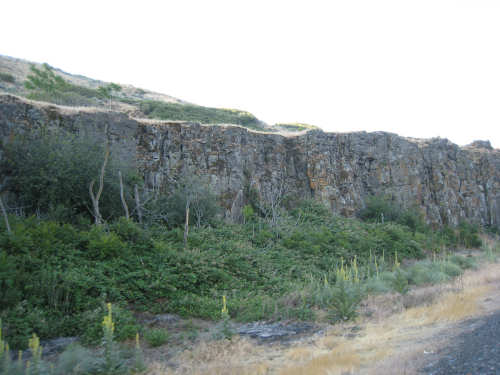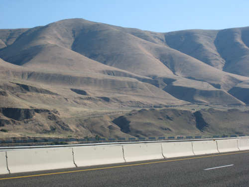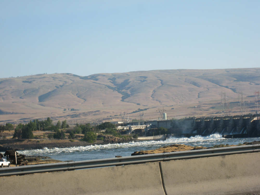 Sunday, June 29, 2008 OK, we are total, total wimps. You may have noticed we're not in a park in West Roosevelt. Well, last night as we checked today's route again and I was fussing about the 55 miles in 100+ heat and chance of thunderstorms and lots of hills ending up with tenting in a town park with no facilities, Pat noticed that there was a little town across the river from West Roosevelt and wondered why we couldn't just stay in Oregon on I-84 again today and stop there. We found a motel in town and they had an opening so here we are! About half the climb and we are in an air-conditioned motel room with a restaurant right next door (I just heard the first thunderclap). This change makes tomorrow's route shorter, too, since we would have been in Washington all day, popping back into Oregon for our motel. This way, we'll stay in Oregon, mostly on I-84 and then on 730 which heads straight into Umatilla. We started out early this morning, leaving The Dalles at 7 am, and got to Arlington at 1:45, so we weren't out in the worst part of the heat for long. Tomorrow, we hope to do the same, and with only 48 miles to go, we should make it in even earlier. The next two days after that, though, are both 75 mile days and there's not much we can do about that, so we're hoping the temperatures cool off some by then. So, today we were on I-84 all day, right next to the Columbia River on the Oregon side. The Washington side was pretty spectacular, mostly huge, brown grass-covered hills that seemed to go right down to the river. Somehow they carved out a railroad track close to the river and we saw lots of trains going by. Hwy. 14 (the one we were supposed to be on) also runs along there, higher up in the hills. We rarely saw cars and trucks going by there and often couldn't even tell where the road could be. We took lots of pictures of the Washington hills because they were so impressive, and a few have trains or trucks going by to try to give a sense of the scale. You'll probably have a hard time seeing them, they look miniscule. The Oregon side was equally impressive, mainly for the basalt cliffs that were still prevalent. There were a few places, especially toward the end of the day, where the hills were rounded, brown grassy slopes like Washington's, but mostly it was very rocky. We saw a deer, a blue heron, a hawk and lots of smaller birds and squirrels. We hope you're not getting tired of hills and river, because that's mostly what we have again in today's pictures. We also saw a few interesting bridges across the river, and a couple of large dams, as well as some side rivers and channels. We're still finding it fascinating so we hope you do too. We ended the day at a little under 54-1/2 miles in slightly over 5 hours of bike time, certainly a lot better than we could have done on the Washington side. And it's raining and very windy out at the moment. |