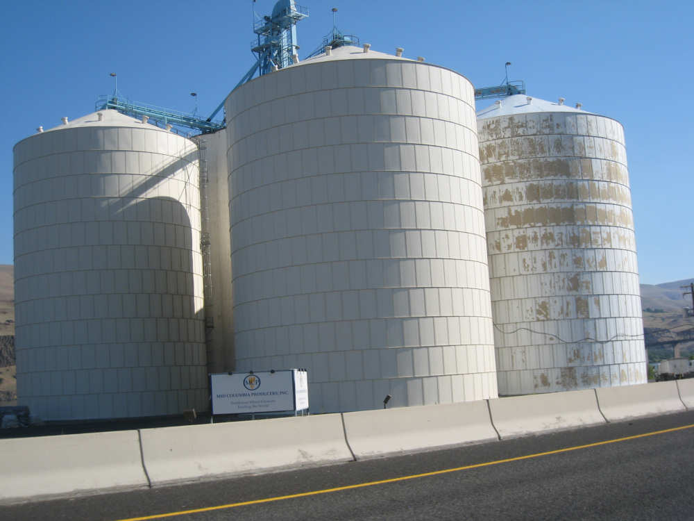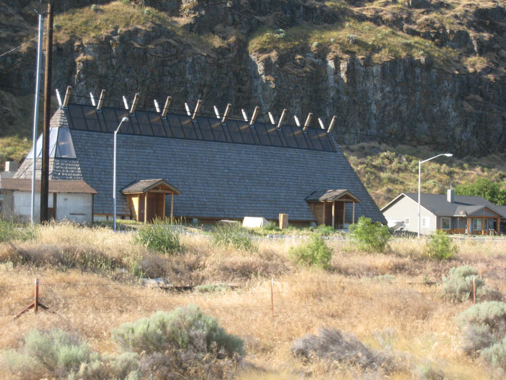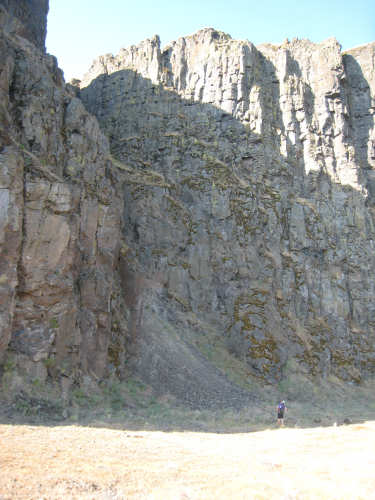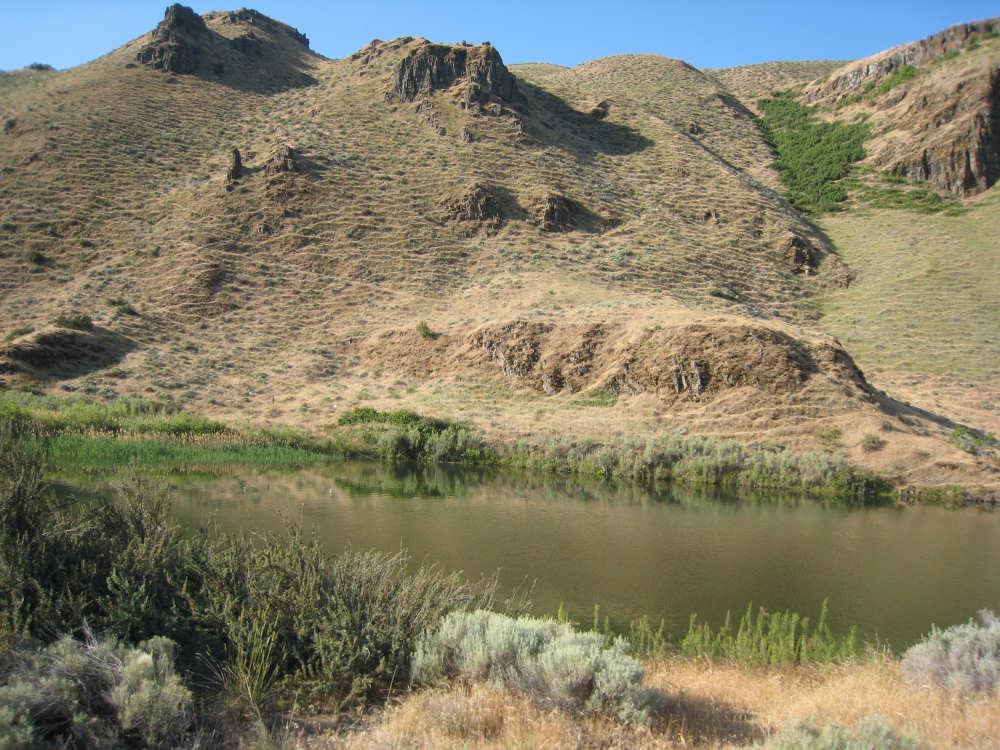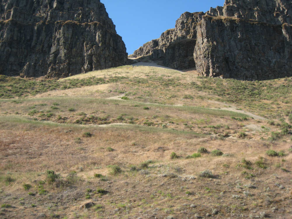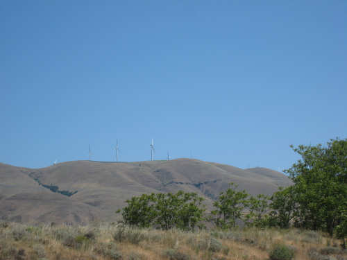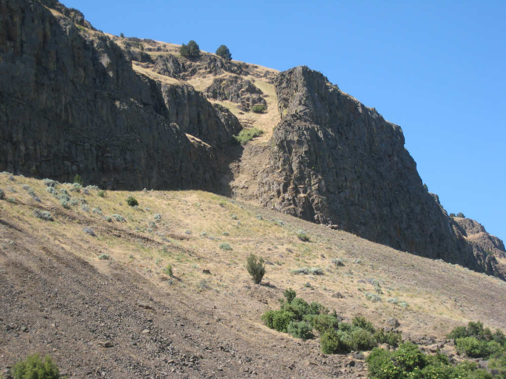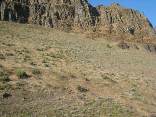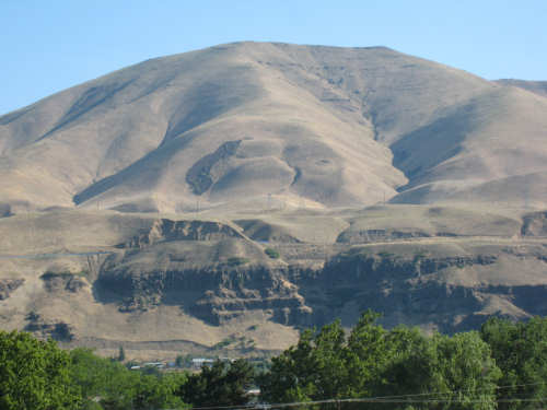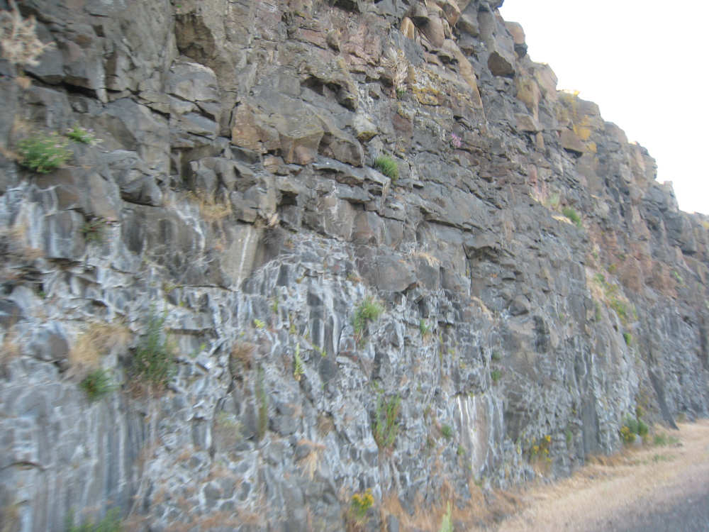 Sunday, June 29, 2008 OK, we are total, total wimps. You may have noticed we're not in a park in West Roosevelt. Well, last night as we checked today's route again and I was fussing about the 55 miles in 100+ heat and chance of thunderstorms and lots of hills ending up with tenting in a town park with no facilities, Pat noticed that there was a little town across the river from West Roosevelt and wondered why we couldn't just stay in Oregon on I-84 again today and stop there. We found a motel in town and they had an opening so here we are! About half the climb and we are in an air-conditioned motel room with a restaurant right next door (I just heard the first thunderclap). This change makes tomorrow's route shorter, too, since we would have been in Washington all day, popping back into Oregon for our motel. This way, we'll stay in Oregon, mostly on I-84 and then on 730 which heads straight into Umatilla. We started out early this morning, leaving The Dalles at 7 am, and got to Arlington at 1:45, so we weren't out in the worst part of the heat for long. Tomorrow, we hope to do the same, and with only 48 miles to go, we should make it in even earlier. The next two days after that, though, are both 75 mile days and there's not much we can do about that, so we're hoping the temperatures cool off some by then. So, today we were on I-84 all day, right next to the Columbia River on the Oregon side. The Washington side was pretty spectacular, mostly huge, brown grass-covered hills that seemed to go right down to the river. Somehow they carved out a railroad track close to the river and we saw lots of trains going by. Hwy. 14 (the one we were supposed to be on) also runs along there, higher up in the hills. We rarely saw cars and trucks going by there and often couldn't even tell where the road could be. We took lots of pictures of the Washington hills because they were so impressive, and a few have trains or trucks going by to try to give a sense of the scale. You'll probably have a hard time seeing them, they look miniscule. The Oregon side was equally impressive, mainly for the basalt cliffs that were still prevalent. There were a few places, especially toward the end of the day, where the hills were rounded, brown grassy slopes like Washington's, but mostly it was very rocky. We saw a deer, a blue heron, a hawk and lots of smaller birds and squirrels. We hope you're not getting tired of hills and river, because that's mostly what we have again in today's pictures. We also saw a few interesting bridges across the river, and a couple of large dams, as well as some side rivers and channels. We're still finding it fascinating so we hope you do too. We ended the day at a little under 54-1/2 miles in slightly over 5 hours of bike time, certainly a lot better than we could have done on the Washington side. And it's raining and very windy out at the moment. |