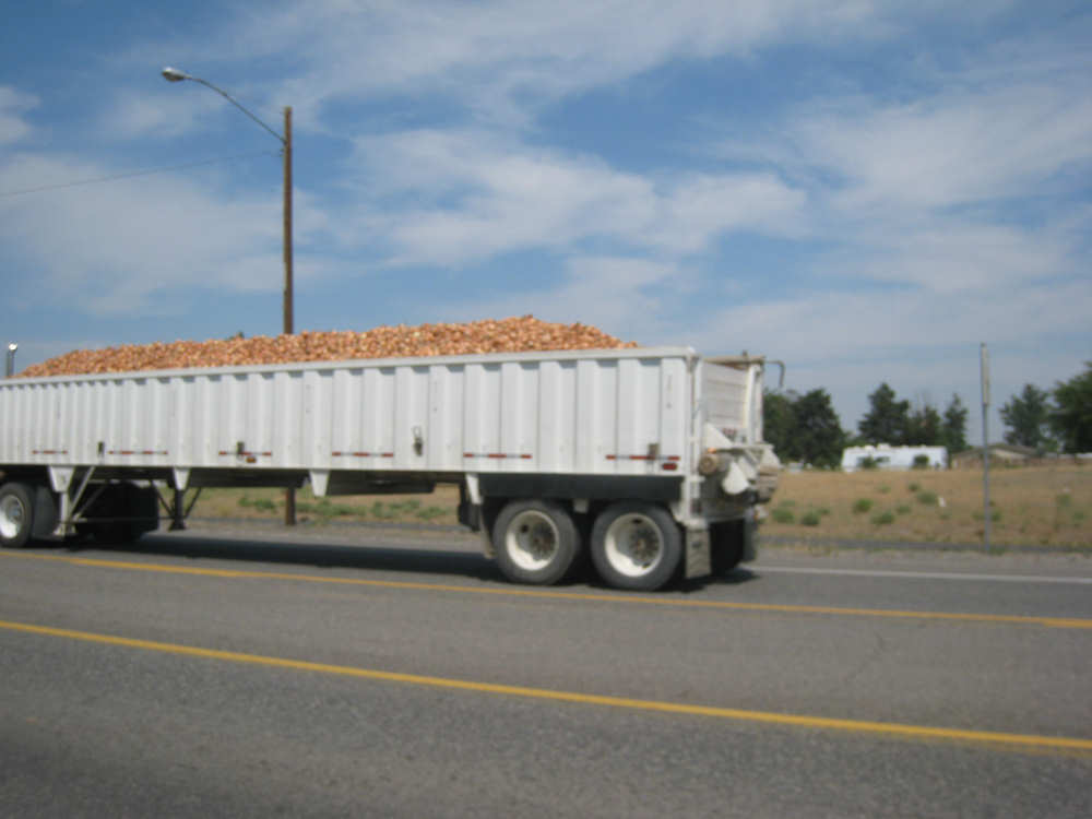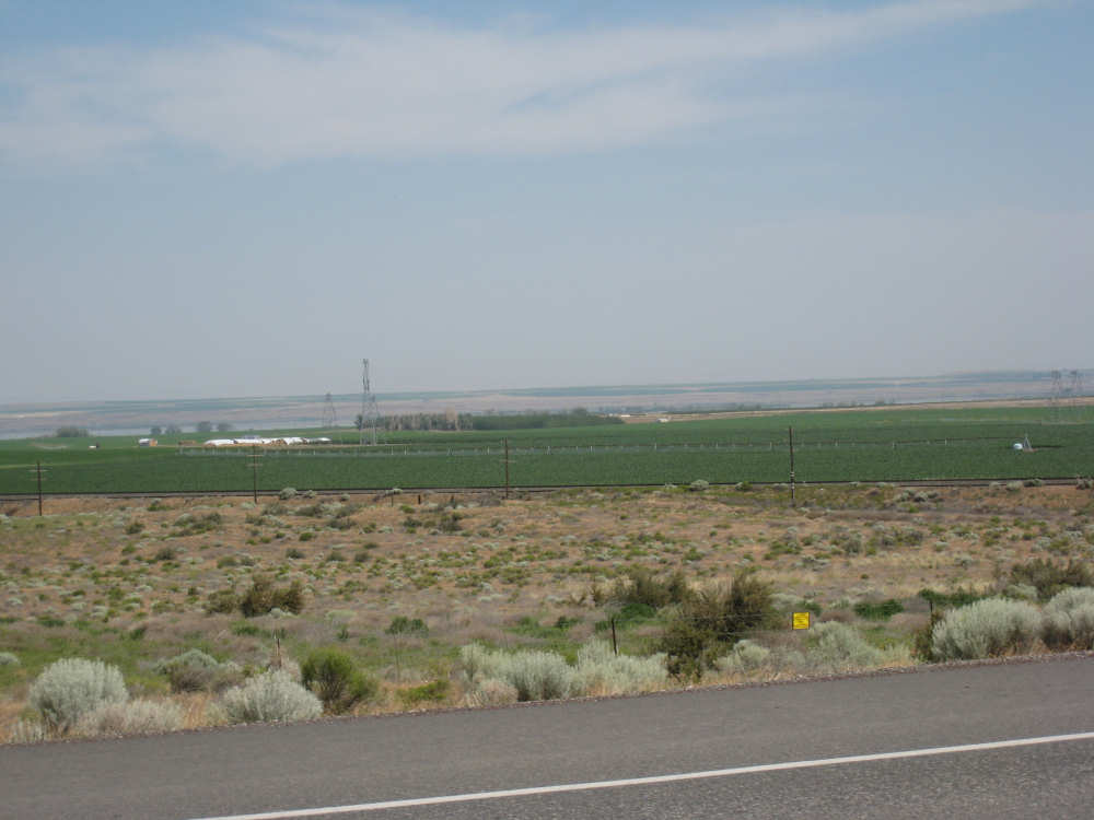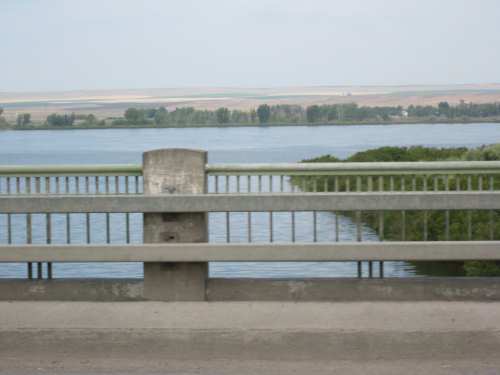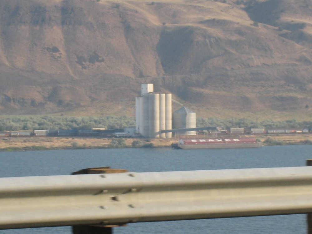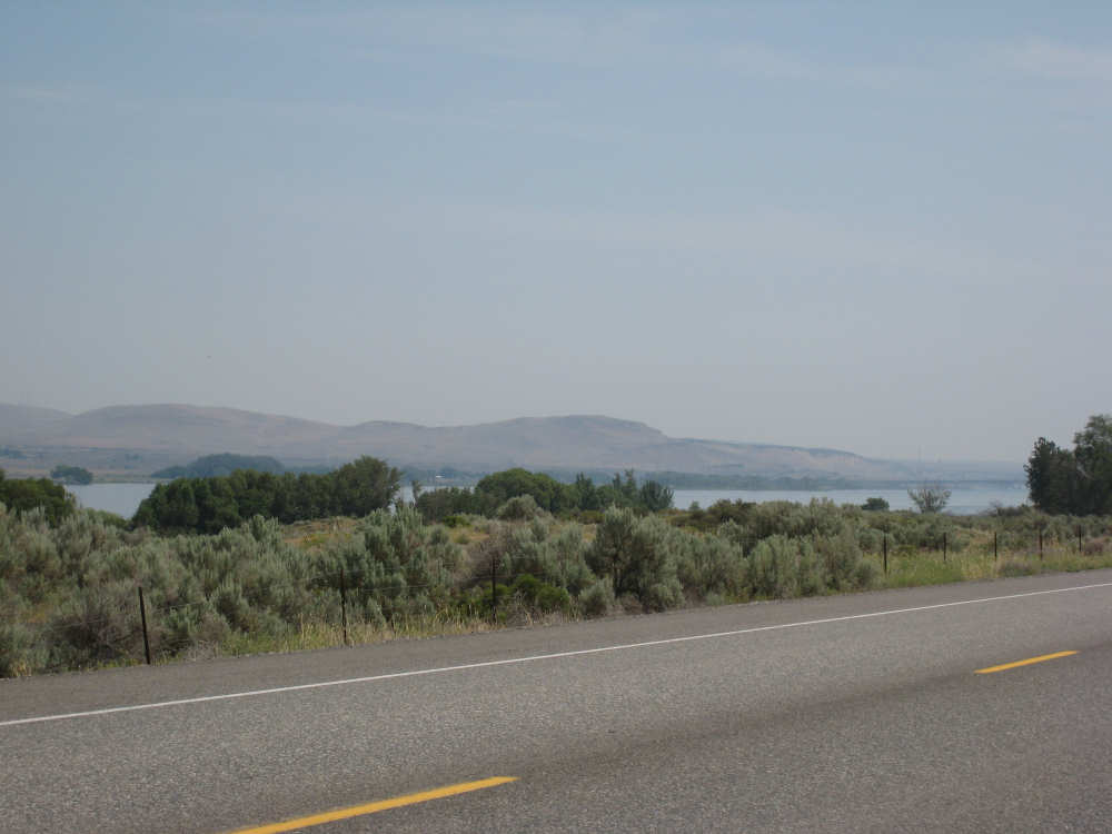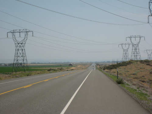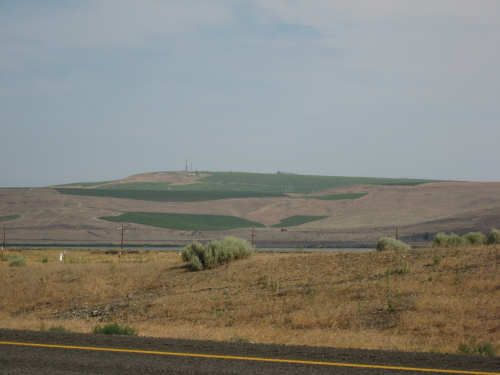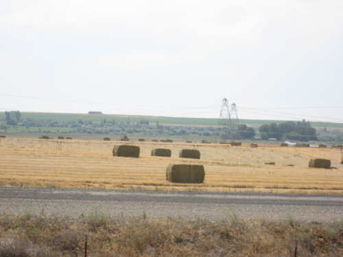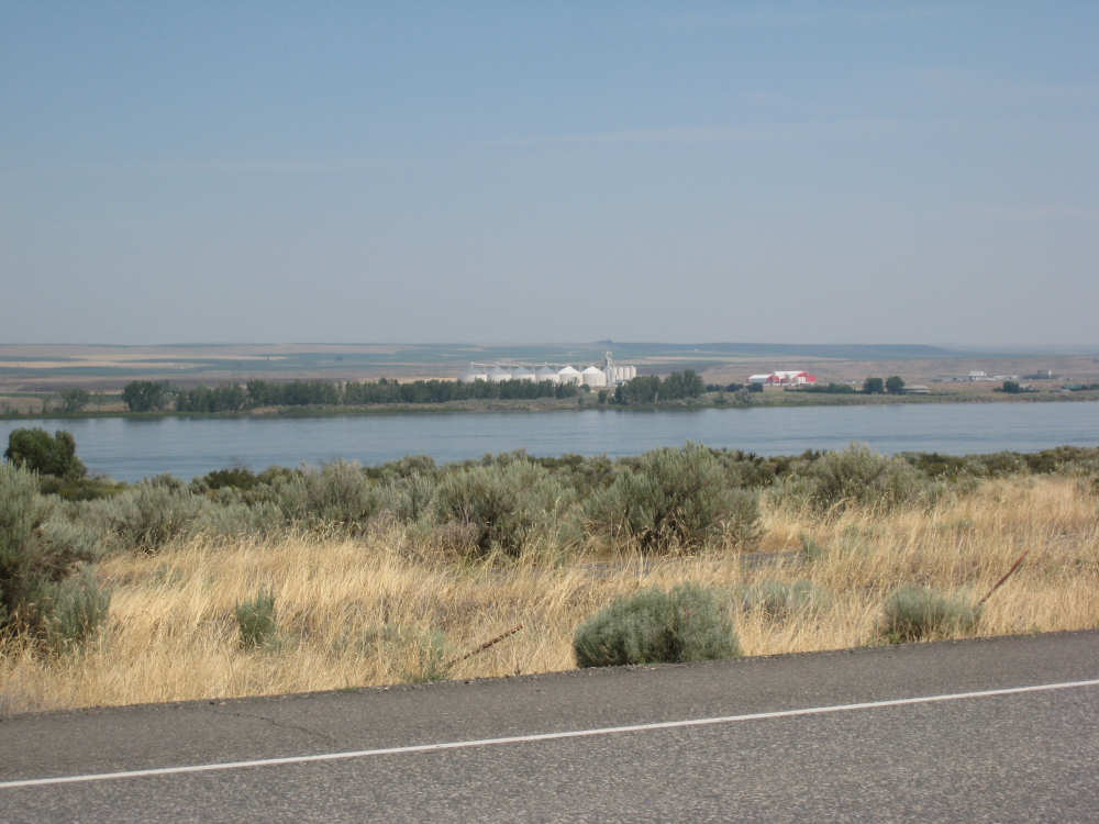 A few miles past Boardman, we turned off onto 730. I-84 had been veering south, away from the Columbia, and 730 veered us back toward the river. The land here was mostly farm land, crops and ranches, continuing the Texas theme. The temperature was getting higher and the heat felt more oppressive due to today's higher humidity. But the road was still smooth and mostly level, so we continued to make good time. We stopped in the town of Irrigon, right by the river, to get some cold sodas at the gas station, only to find it and everything else in the town was closed. Last night's thunderstorm had apparently hit them a lot harder than in Arlington - their power had been out since 11 pm. As we pedalled dejectedly out of town, we came across signs of the storm's damage - downed trees and several telephone poles lying in the street. Electric workers were hard at work on them. We had been noticing onions and onion skins along the side of the road from time to time which seemed odd, and finally saw the source of them. Onions appear to be a big crop in the area - we saw several large trucks full of them, without any covers on them, so onions often fall off the onion trucks, so to speak. We saw a fruit stand soon after Irrigon and stopped there for our cold drinks. They were doing a booming business, given they were the only place with power in several miles. Not too many miles later (although the last few miles always seem to take the longest), we came into Umatilla, crossing the Umatilla River. It's a fairly large town and our motel was on the far side, but we managed to reach it by 1 pm, coming 48-3/4 miles in a 4-1/2 bike hours, almost breaking an average 11 mph. Tomorrow and the next day will be long days with sparse services, so we plan to stock up on some food for the journey this afternoon.