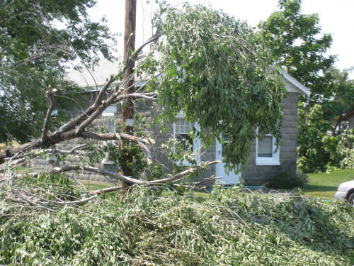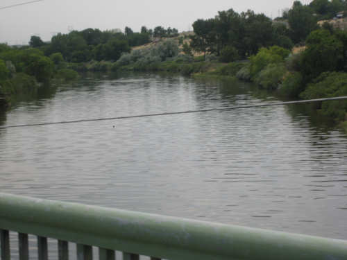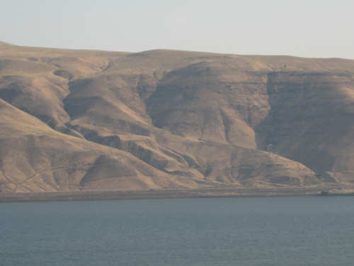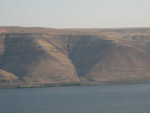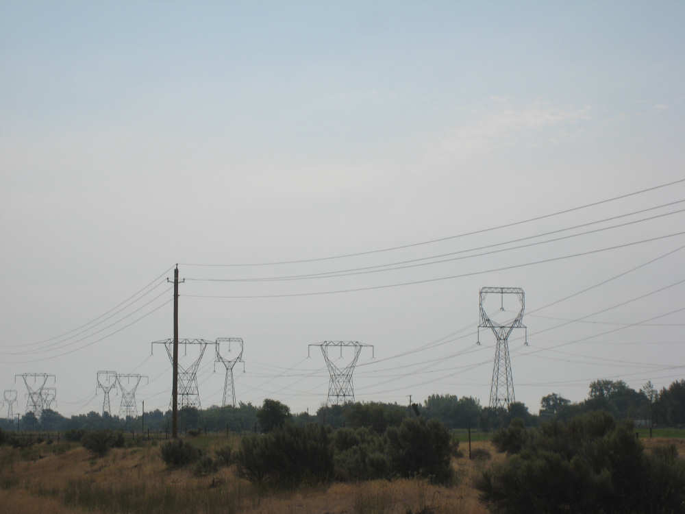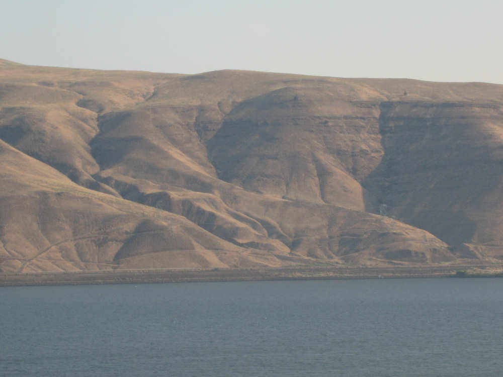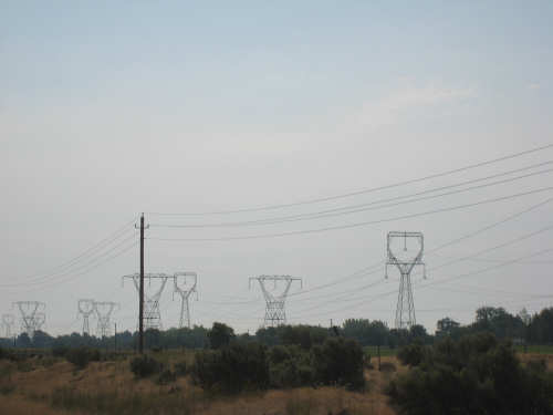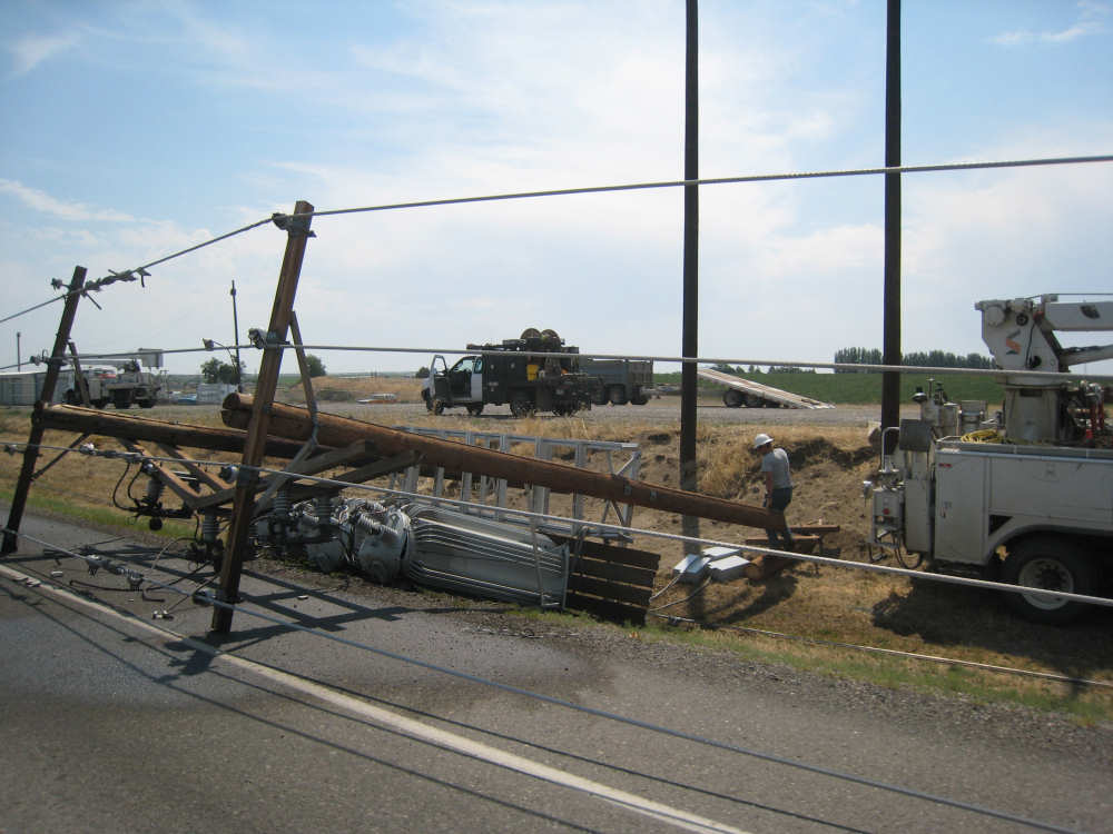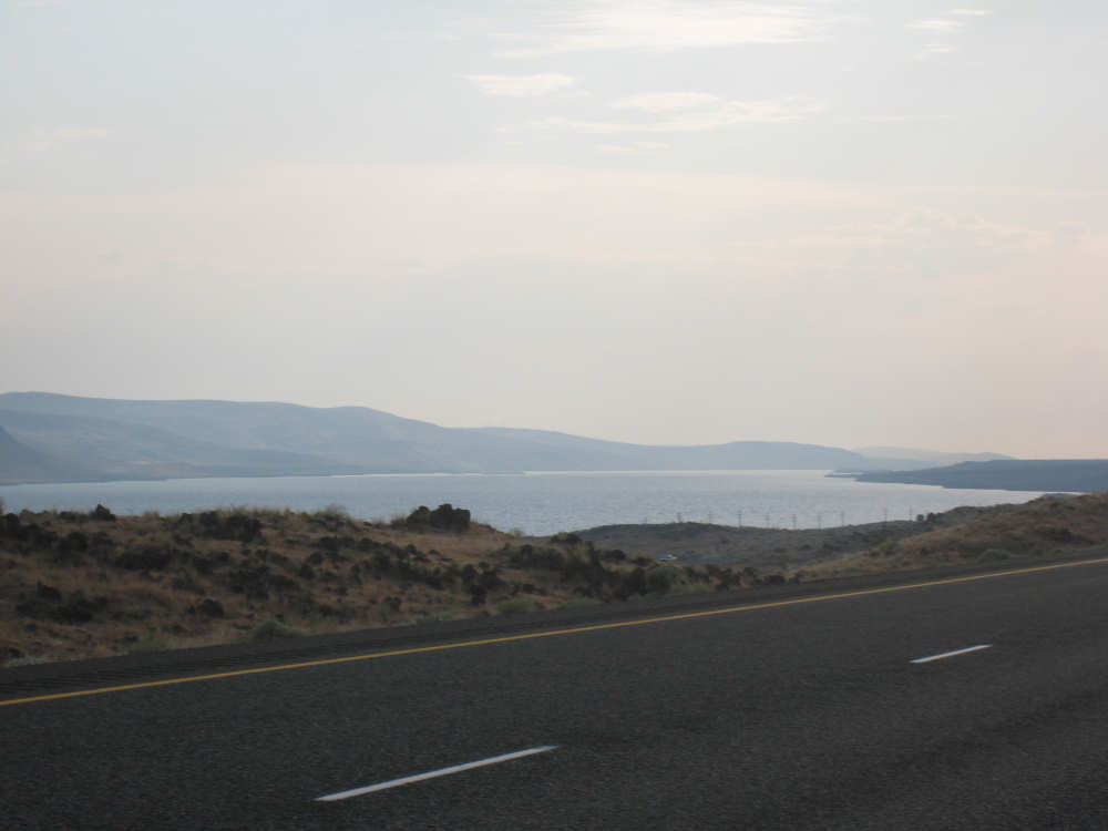 A few miles past Boardman, we turned off onto 730. I-84 had been veering south, away from the Columbia, and 730 veered us back toward the river. The land here was mostly farm land, crops and ranches, continuing the Texas theme. The temperature was getting higher and the heat felt more oppressive due to today's higher humidity. But the road was still smooth and mostly level, so we continued to make good time. We stopped in the town of Irrigon, right by the river, to get some cold sodas at the gas station, only to find it and everything else in the town was closed. Last night's thunderstorm had apparently hit them a lot harder than in Arlington - their power had been out since 11 pm. As we pedalled dejectedly out of town, we came across signs of the storm's damage - downed trees and several telephone poles lying in the street. Electric workers were hard at work on them. We had been noticing onions and onion skins along the side of the road from time to time which seemed odd, and finally saw the source of them. Onions appear to be a big crop in the area - we saw several large trucks full of them, without any covers on them, so onions often fall off the onion trucks, so to speak. We saw a fruit stand soon after Irrigon and stopped there for our cold drinks. They were doing a booming business, given they were the only place with power in several miles. Not too many miles later (although the last few miles always seem to take the longest), we came into Umatilla, crossing the Umatilla River. It's a fairly large town and our motel was on the far side, but we managed to reach it by 1 pm, coming 48-3/4 miles in a 4-1/2 bike hours, almost breaking an average 11 mph. Tomorrow and the next day will be long days with sparse services, so we plan to stock up on some food for the journey this afternoon.