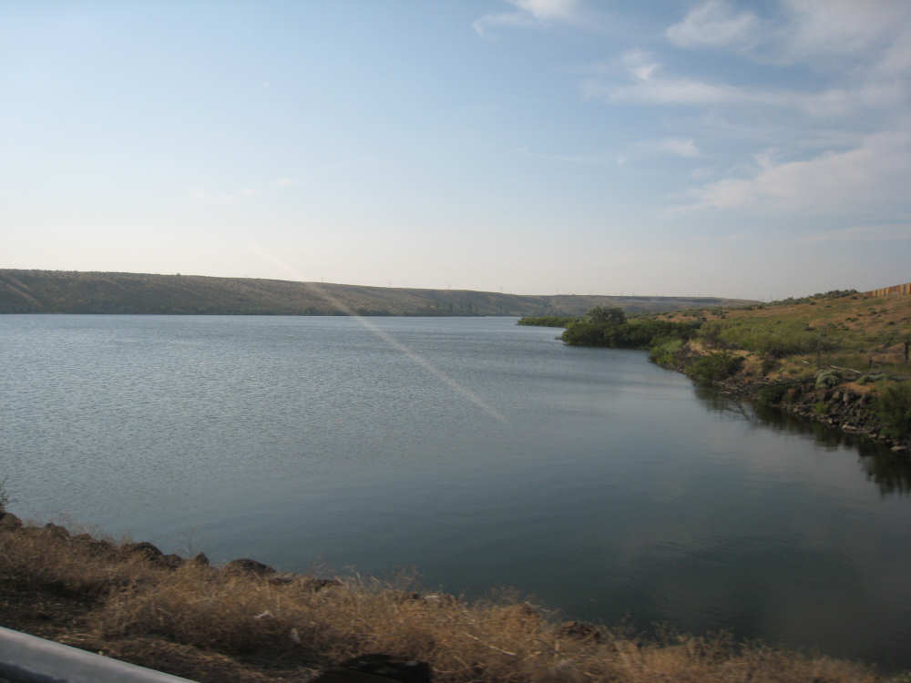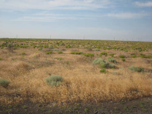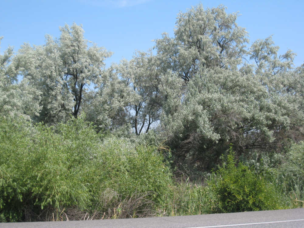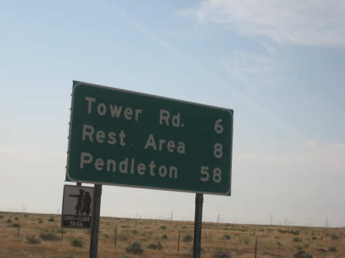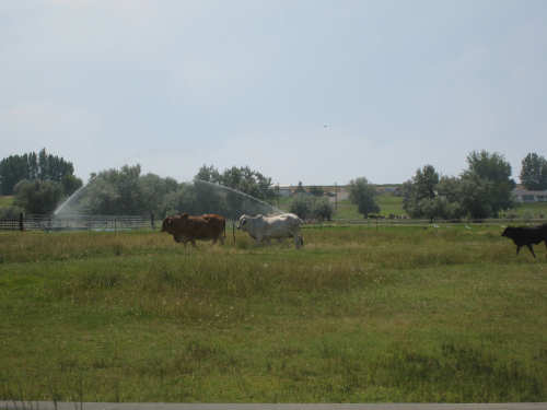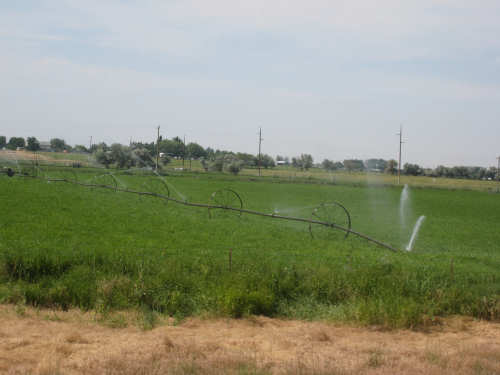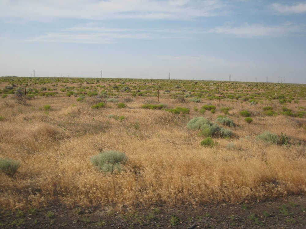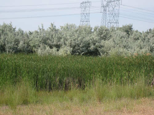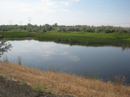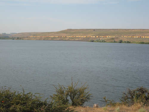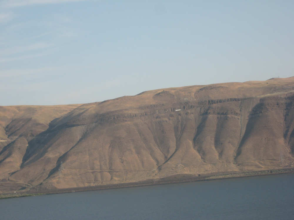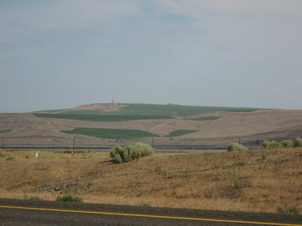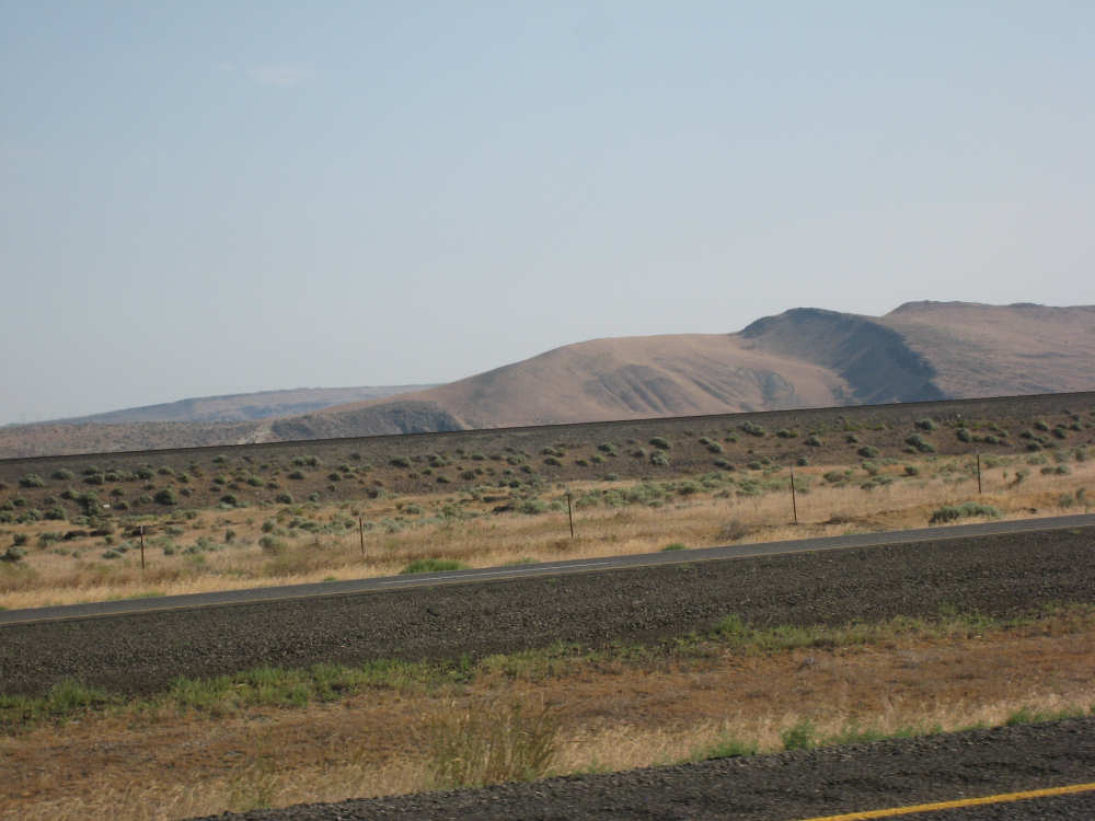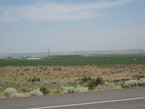 Today was another fairly easy day - 48-3/4 miles on basically 2 roads, I-84 and SR 730, both of which were smooth roads with ample shoulders. Last night's thunderstorm did not cool things off much, in fact, it made them steamier, but it was refreshingly cool when we set out this morning around 7 am and we had a very pleasant morning zipping along I-84. It was mostly level or even downhill most of the way and we had a decent tail wind for the first time since we turned east - we were beginning to think we had been misled about those prevailing west winds. We were along the Columbia again, with similarly gigantic hills on the Washington side and fewer and browner cliffs on the Oregon side. As we went along, we thought for a minute that we'd taken a huge jog to the south - the terrain went completely flat and was covered with brown grass and sage brush. Washington was still very brown and getting a bit flatter too; we also started to see more crops over on the hills there. We stopped at Boardman, the first town we came to after 27 miles of riding, and got milkshakes, one of our favorite mid-morning snacks. We also stopped at the rest area we had been promised 88 miles ago, but just to use the bathroom. Just before we reached Boardman, we went by the Umatilla National Wildlife Refuge. We couldn't really see it, because it was next to the river and we were beginning to pull away from it, but we did see a lot of wetland areas beside the road. The birds clearly loved the reeds and cattails there; there were many swooping around the plants. chirping delightfully. The wetlands added to the Texas look - we even saw a couple of tumbleweeds and some tamarisk trees, and the Ron Paul signs which were so prevalent in the South began to take over from the Obama signs that were all over coastal California and Oregon.