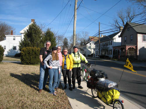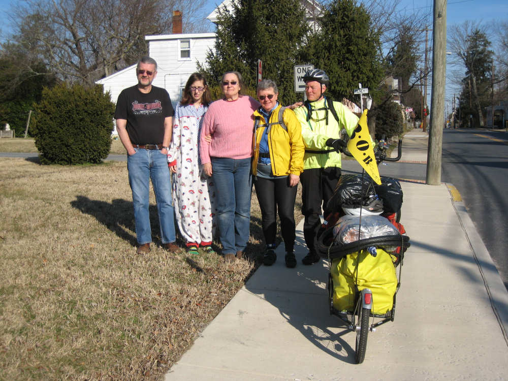 Monday, March 03, 2008 Day 3 - Ursula and her family continued their royal treatment of us, getting up early to give us a big waffle breakfast this morning. After packing up, and taking some pictures of her family, we headed off by 8:45. It was already about 42 degrees and bright and sunny. It continued to be a glorious day, warming up to somewhere around 60. Pat and I were peeling off clothes as the day went on. It continued to be very windy however - giving us practice for the California Coast headwinds we've heard so much about. Luckily, the terrain was very flat, so it was pretty easy going even when winds were against us. We were encouraged that we were feeling a little stronger today; yesterday's shorter ride seemed to help our muscles recover a bit. Today's ride was very pleasant, past well-kept family farms and various farm animals, including a bison farm we were very surprised to see. All the animals turned to look at us with curiousity. You'd think they'd never seen a tandem hauling a trailer before! The people we met along the way were all very friendly, too. We stopped to use the restroom and got a snack at a little general store and ended up having a pleasant chat with the owner. Our bike attracted attention at a Subway restaurant in Denton where we stopped for lunch. People came over to ask about where we were from and where we were headed. We arrived at the Best Western Hotel in Kent Narrows (Grasonville), just before the Bay Bridge across the Chesapeake Bay, at about 4:30 having covered 60 miles in about 5 and 1/2 hours riding time, almost 8 hours overall time. They treated us very nicely at the hotel - storing our bike in a conference room and being generally very friendly and helpful. Tomorrow, a truck will pick us up at the hotel to take us over the Bay Bridge, since bikes are not allowed on it. Then, we head off to Washington, DC where we'll spend the night with friends again. |