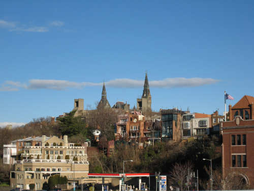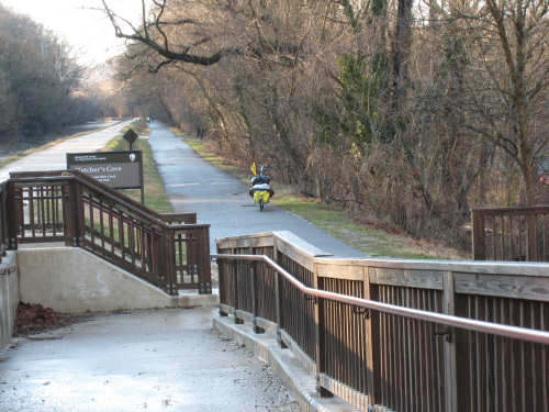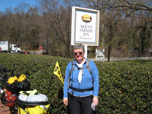 Wednesday, March 05, 2008 We hit 2 new milestones today - we traveled further south than we have ever been on the bike, and we entered our 5th state! The weather report the night before indicated a tornado watch and flood warnings, but we only had a heavy rain which stopped by morning. The clouds quickly left and we had another bright, sunny day. After the difficult time we had yesterday, getting lost in the DC streets, we didn't want to repeat that mistake by getting lost in the Arlington, VA streets during rush hour. So, we decided to take the bike trails instead, even though we knew it would be longer. We figured it would also be easier and less frustrating since we would almost certainly get lost and have to battle a lot of traffic if we went through Arlington. We ended up going 13 miles longer than planned, but it was definitely worth it. We started with the Crescent Trail, a beautiful trail that we picked up very close to Esther and Stan's condo, where we stayed last night. This was a bit of nostalgia for us, since it was the way we took to the C&O canal on our bike trip in Oct. 2006. The Cresent and the C&O trails join up at Fletcher's Cove which we went by. We followed the Crescent Trail down to the Francis Scott Key Bridge in the Georgetown section of Washington and took it into Arlington, VA. Rush hour traffic was in full swing and we were glad to be watching it from the walkway on the bridge. There were great views of Georgetown, the Potomac, and Arlington from there. From that point, we took the Mt. Vernon bike trail, instead of taking our planned route through the Arlington city streets, down to Route 1. The trail was beautiful - we had great views of various landmarks in DC across the Potomac. We lingered along the route, taking pictures and enjoying the scenery. At one point, we reached a fork in the trail and were uncertain which way to go. A friendly gent stopped to ask us if we needed help and proceeded to explain in great detail what was available down each fork. We took his advice and went down the fork that took us into Alexandria's Old Town, which had great little shops and cafes. Very quaint. We came to a detour in the trail, and again were helped out by a friendly local on a recumbent bike who told us exactly how to get around the detour and back on the trail. We arrived at Mt. Vernon in time for lunch and met 2 other bikers, Jeanette and Will, who admired our bike and stopped to chat. Jeanette was about to go off on her own adventure, a 6-month tour in Iraq on an R&R mission with USO, supporting the soldiers. We applauded her bravery and generosity. They estimated Fredericksburg, our destination for that night, to be about 50 miles away and since it was already noon, we figured we ought to get going! So we missed sight-seeing another great place. The rest of the trip, straight down Route 1 to Fredericksburg, was not so pleasant - the traffic was very heavy and there was no shoulder to speak of, so it was pretty nerve-wracking having cars whiz by us close enough to touch. Besides that, the road was one rolling hill after another. Most of them weren't too bad, and we could build up enough momentum on the downhill to take us up a fair way on the uphill. It was a bit encouraging that the hills didn't seem too tiring, although it got very tedious dealing with the hills and the traffic. Having had the delightful experience on the trails earlier, though, helped keep our spirits up until we finally arrived at our hotel at 6:45, in the dark. We ended up being on the road almost 12 hours, doing about 74 miles in almost 7 and 1/2 hours of bike time. |