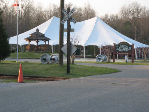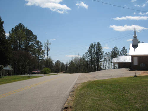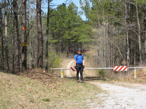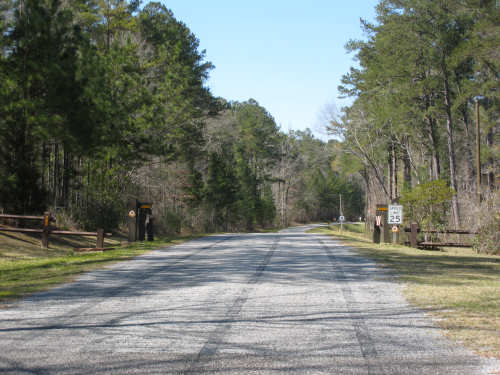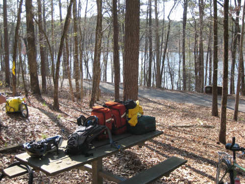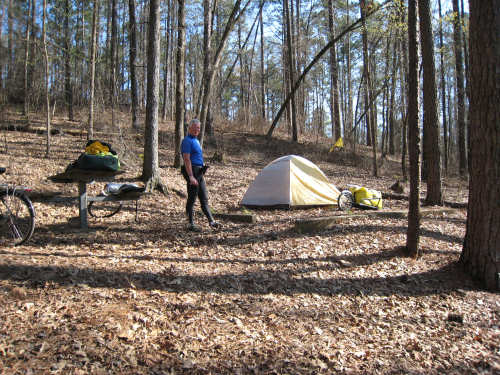 Monday, March 24, 2008 This morning started with a little adventure. We had only gone about a mile from the hotel when we noticed the traffic was all backed up. Turned out they were stopped by a freight train that was inching forward, stopping, going backward, stopping, and so on, completely blocking the intersection. We stopped behind a school bus to ponder our choices - some of the bratty boys in the back seat leaned out to chat and ask if they could borrow our bike. We decided to try a detour which, fortuitously, took us right past the Heart of Dixie Railroad Museum. So we stopped to take pictures of all the neat train cars they had on display there. Then we turned the corner and got by the end of the train and were on our way. It was chillier this morning so we were bundled up more than we have been in a while. Route 25 outside of Calera was very industrial with 2 limestone plants across the road from each other (all the trees near them looked ghostly, all dusted white), a steel plant, some logging operations, and others. There were lots of trucks going by as a result, and of course it was our usual 2-lane, no-shoulder country road. Plus it was a bit hillier and windier than it was yesterday, so all in all, not nearly as pleasant. Besides all the industrial buildings, there were a few large farms, all with very well-kept, grand-looking houses, neat fences and nice plantings - very little forest. As we got farther from Calera, the houses got less grand. We knew there would be only one large-ish town we'd go through today, Centreville, about 28 miles out. Although we had a continental breakfast at the hotel, we were feeling hungry when we saw a sign for a grocery store called Six Mile (turns out, the nearby town was called Six Mile too, but we forgot to ask what it was 6 miles from). The folks in the store were very nice and we chatted with them about Payne Lake, our destination for the night, and restaurants in Centreville. They recommended the 'Twix and Tween' restaurant and we ended up stopping there for lunch - had a great, inexpensive buffet. Figuring that we wouldn't have any restaurants at dinner time, we asked them to make us some sandwiches to take with us, and they were delicious, too. After Centreville, the traffic lightened up somewhat and the scenery became more like what we've been used to - a mix of houses in various states of repair, many shabby, some in good shape, with forest in between. We then got into the Talladega National Forest again and didn't see any more houses. There were still a lot of trucks, mostly logging trucks, and a few cars. The road got a lot hillier here and in worse shape, I guess because of all the truck traffic, but it wasn't too bad. We finally saw the sign for Payne Lake and turned in. The lake was beautiful, in the middle of the forest, all quiet and peaceful. We came to an information station but no one was around, so we studied the maps and made our way around to where we thought we were supposed to be. No one was anywhere in sight, which we thought was odd, but given the time of year we decided it wasn't too strange. We stopped at a site overlooking the lake and Pat went off to try to find the ranger while I set up the tent. Pat found out that we were actually on the wrong side of the lake, that other folks were on the opposite side where there was electricity and bathrooms, but we decided it wasn't worth moving at that point. Our Verizon connection didn't work anyway, so we couldn't update the site. We had our sandwiches, chips and apples for dinner, got all the work done on the website, except copying it to the web server, and went to bed. We had reached the campsite at 54.5 miles, but Pat put another 4 miles on it looking around. |