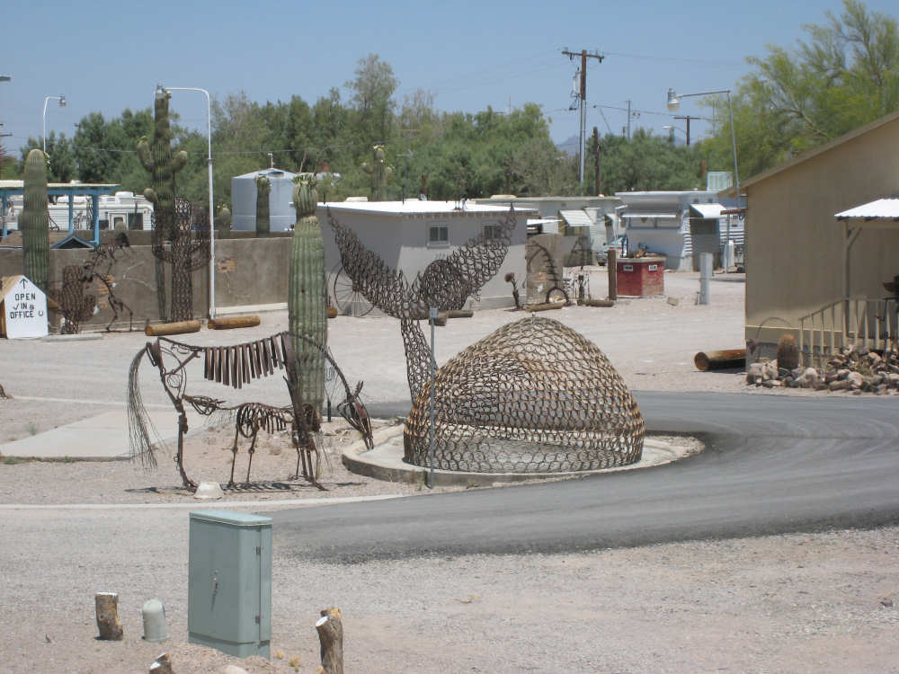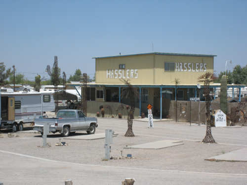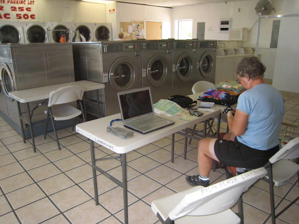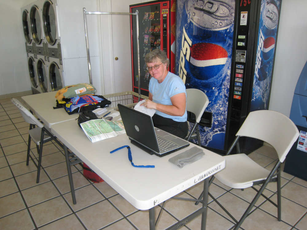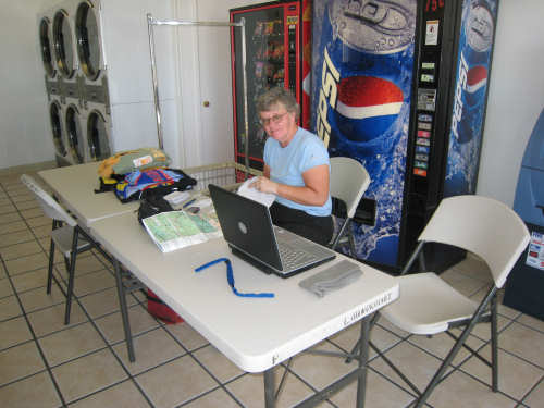 Wednesday, May 07, 2008 - Rest Day in Quartzsite, AZ Here we are in sunny, hot, windy Quartzsite, doing laundry, working out next week's route, and catching up on other mundane details. Next week should be pretty exciting - we enter California, our 15th state tomorrow, and we'll go across a valley that's below sea level, a desert with sand dunes, a mountain that's over 4000 feet high, and get to the Pacific Ocean! All in 5 days! We expect to reach San Diego on May 12th and do our ceremonial dipping of our bike's front wheel in the ocean there. Tomorrow night we'll be in Palo Verde where cell phones and internet apparently don't work, so no posting for 5/8 until the next night. And if we're too exhausted from the mountain we'll have climbed on 5/9, it may not happen until the next night - we'll see. Meanwhile, you can see pictures from our exciting day of rest in Quartzsite. |