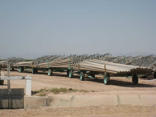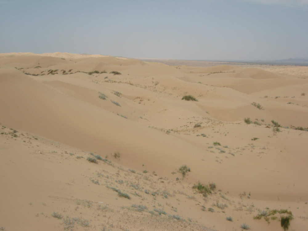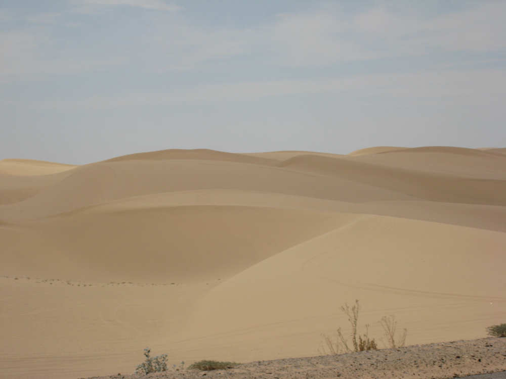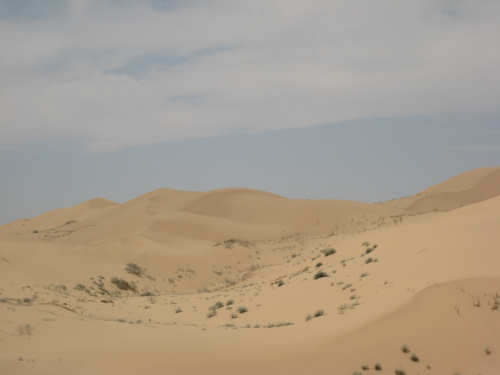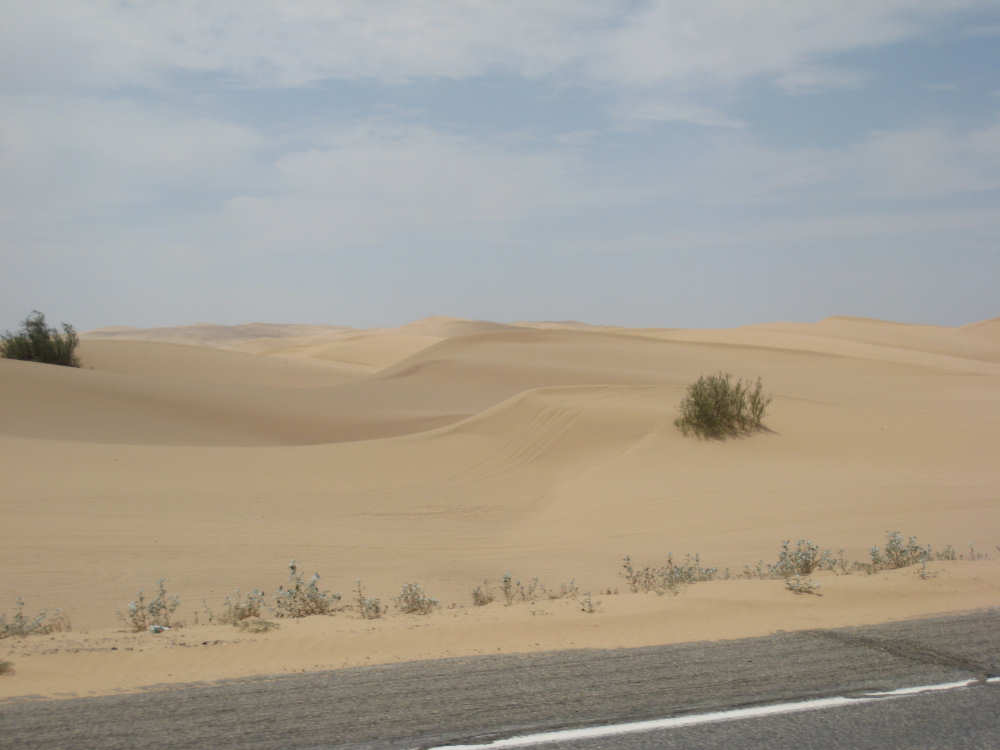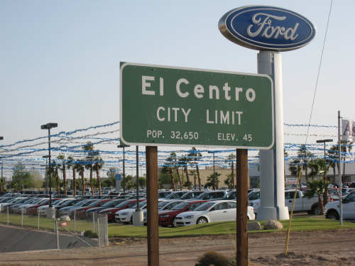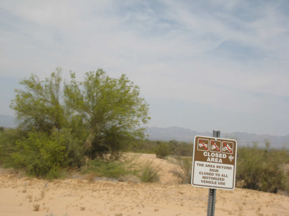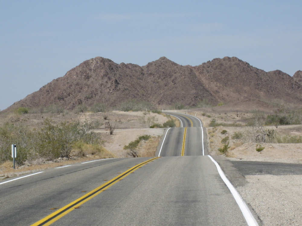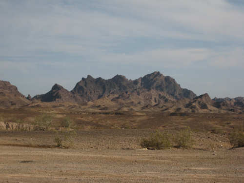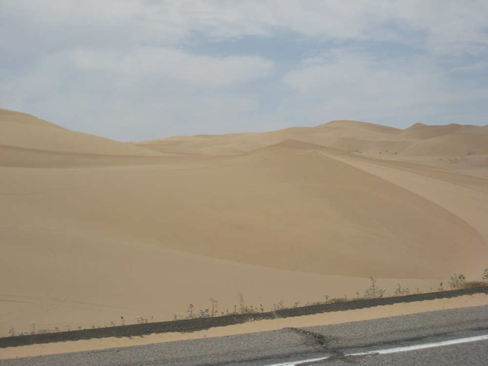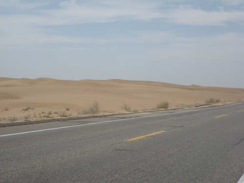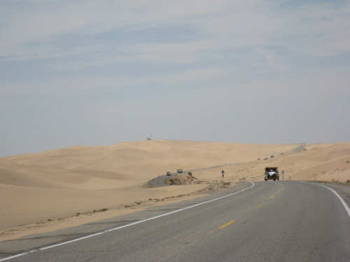 Friday, May 09, 2008 Big day today. We hadn't decided last night whether to stop at Brawley today (67 miles) or go all the way to El Centro; we thought we'd wait and see how the day went and decide when we got to Brawley. We started at 6:20 this morning to get as much of the cooler morning temperature as we could and to make sure we didn't end too late, even if we went to El Centro. Our nearby restaurant didn't open until 8 so we had 2 of the sandwiches we had bought for the day and a couple of little carrot cakes for the energy. We left before most of the town was up, but we passed a group of kids waiting for the school bus to take them to school in Blythe, 20 miles away. A parent waiting with his kids told us this and he looked concerned when we told him we were going down Rt. 78 to Brawley - he told us to be careful, that the road was treacherous. We only knew it was a difficult road, but his warning was a good reminder that we needed to be extra cautious. We started out pretty easily. We passed the Colorado River at the Palo Verde County Park. The Cibolla National Wildlife Refuge also extended to our left around that area, but we didn't see much of that. We went along the Colorado River for several miles but didn't see it again after the park area. To our right was the impressive Palo Verde Peak and the Palo Verde Mountains that it was a part of. We passed the Palo Verde Outfall twice; this was a wash from these mountains. There was a wide area called the Milpitas Wash which was covered with dark gravel. It looked like it had been carefully smoothed out - hard to tell if it was natural or not. There were signs in this area, and later ones similar to it, stating that motorized vehicles were restricted to designated areas, presumably to protect the fragile desert ecosystem here. The terrain was rugged, mountainous, and sparsely covered with the usual desert plants. The road was mostly uphill but with a rollercoaster set of dips and rises. The shoulders became quite narrow and the sight-lines were short because of all the dips. It was fairly slow-going and we were glad we were hitting this stretch while we were fresh. After about 30 miles, we finally started to go downhill more than up, so we picked up some speed. When we went by the Chocolate Mountains, so called for their deep brown color, we also entered an area designated the Naval Reservation Aerial Gunnery Range. We saw big piles of dirt and big dump trucks going up and down one of the big piles, dumping more dirt. We were confused as to why a gunnery range would need to have these big piles of dirt, but later realized that there was also a large mine in this area. We weren't sure what the relationship was between the two, though. Shortly after we passed the gunnery range and mine, we entered the town of Glamis, which was nearly deserted (no pun intended). It turns out their sole purpose was to support the dune buggy enthusiasts who flock to that area for the winter season, which had recently ended. We got some drinks at the convenience store in town and ate two more of our sandwich supply. We had come 40 miles at that point in about 5-1/2 hours, which given all the hills, seemed pretty good. Then the best part started - the sand dunes. We had been a little nervous about this area because the wind was a bit stronger today, so we were concerned that there might be a sandstorm. But we didn't have any trouble. The sand dunes were spectacular. Just like many of the mountains we'd seen, they had varied and interesting shapes, little valleys where a few desert shrubs grew, sharp peaks and rounded hills - we just couldn't stop taking pictures. The most interesting dunes were to the left (south side) of the road, The north side was a protected area where no vehicles were allowed. It was interesting in that there was a lot more vegetation on that side, even though it was just as sandy. The dunes went on for about 7 miles. They slowly flattened out and became less barren, until finally the terrain looked a lot like it had before the dune area. Shortly after that, we entered the Imperial Valley, a lush agricultural area that is below sea level! Here we passed huge crop fields, mostly growing hay it seemed but also other crops, an orange grove, a palm tree nursery, and a large cattle feedlot. We entered the town of Brawley, pretty hot and tired at this point. It was about 3:30 and 93 degrees and we had come about 67 miles. Brawley was packed with cars too, so it was not exactly relaxing. We stopped at a Mexican restaurant to rest, cool off, get something to eat and decide whether to chug on or find the nearest motel. We were greatly refreshed by our meal and large Cokes and decided it was still plenty early to go another 15 miles. We almost regretted the decision pretty quickly, though, because the wind had picked up a lot at this point and we were battling it nearly every inch of the way to El Centro. Luckily, the road was still good and had a decent shoulder; the traffic was still fairly heavy, so it still felt pretty hectic. We were very glad to see the motel we were aiming for, and it turned out to be a very comfortable one. We ended up at 82 miles in 8-1/4 hours of bike time; a perfect 10 mph average. Tomorrow, we go from sea level to 4000 feet in about 20-25 miles. It will be about half the length, but probably take just as long. |