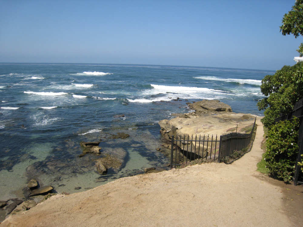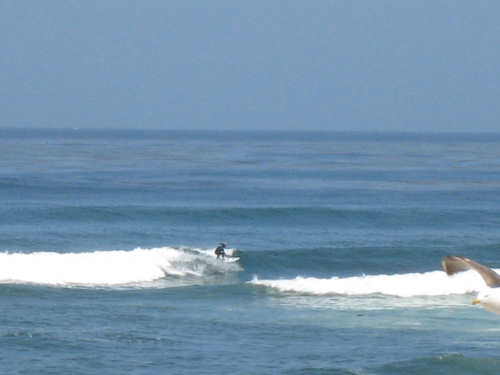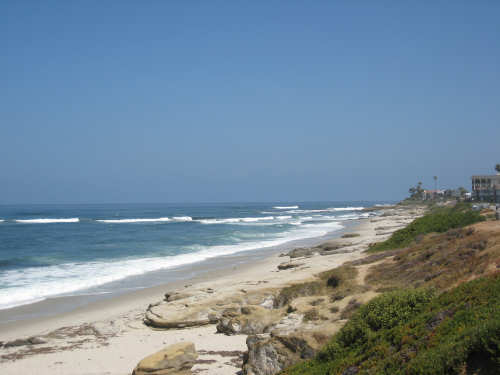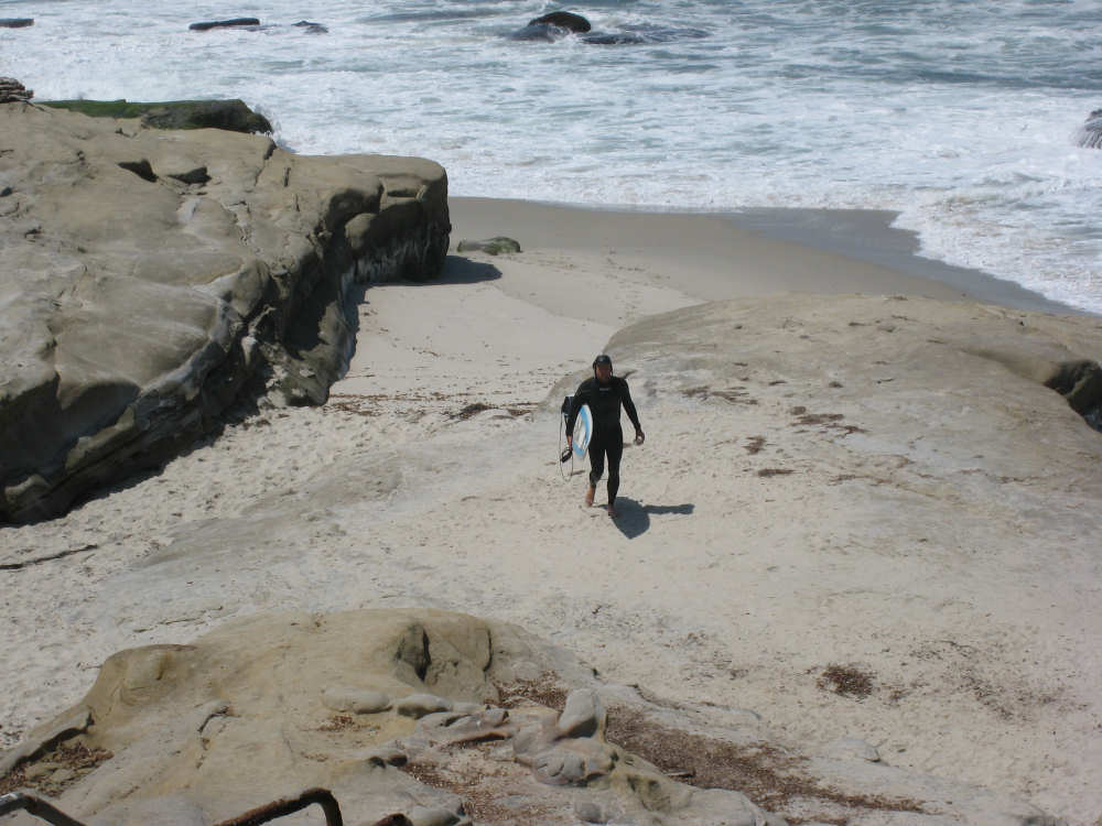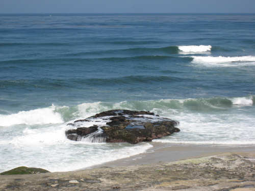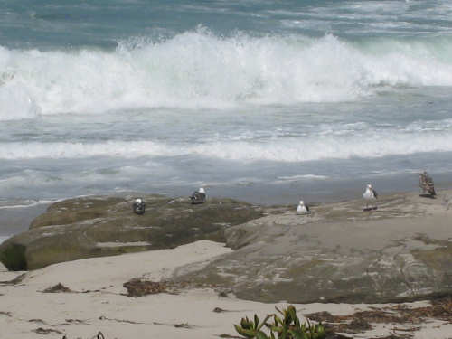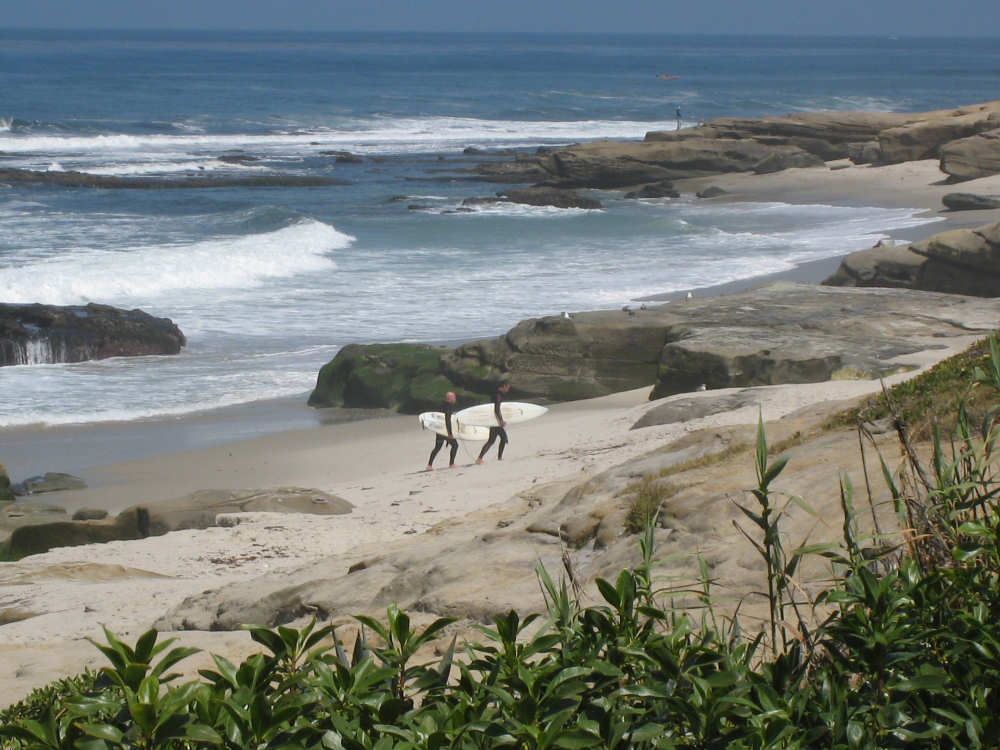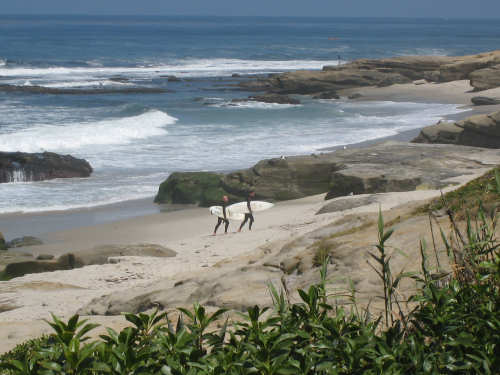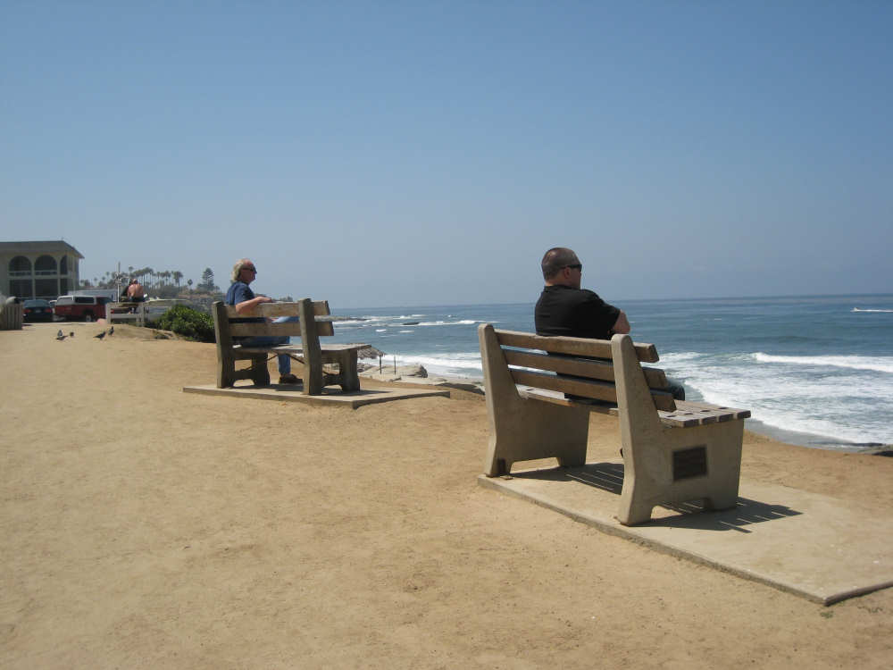 It's a beautiful day here in La Jolla - the May Gray blew away early this morning and it's been bright and sunny ever since. We may stay here forever. It's just too beautiful and relaxing to leave. We went for a walk along the ocean this morning and saw a number of other people enjoying the weather, the ocean, and the beauty of this place in general. People were jogging, walking dogs, sitting on benches watching the waves, playing on the beach, and surfing. We watched one surfer come off the beach and walk into his home across the street! What a life! We've heard that work here follows the surf - when the surf's up, work stops and people hit the beach. We saw a group of guys doing landscape work (THAT is a thriving business here) take a break and walk across the street to watch the ocean. It is very seductive. Like I said, we may have to stay here forever.