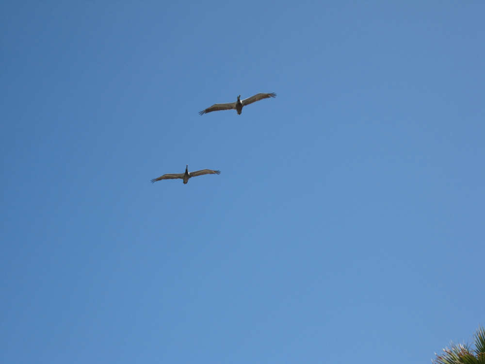The pelicans continue to amaze us. They look like small jets at times - they rarely flap their wings and soar in formation in groups of half a dozen or more. We also saw a hummingbird darting around flowering plants near the shore.