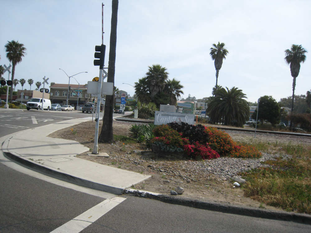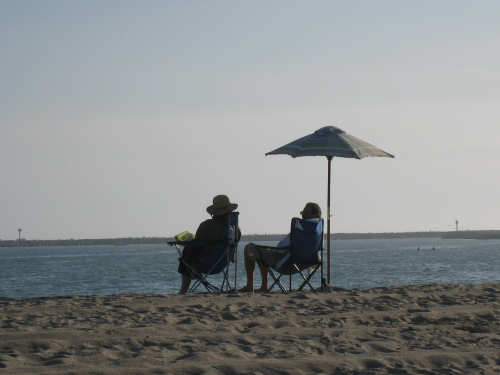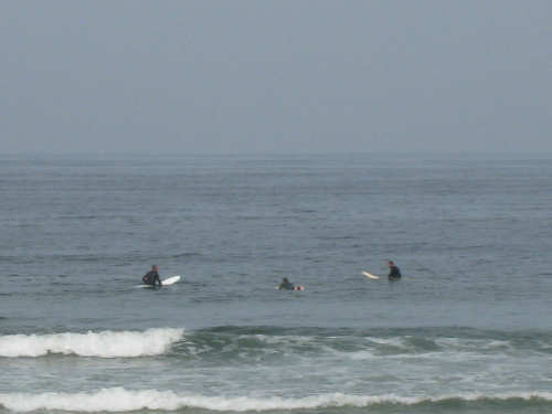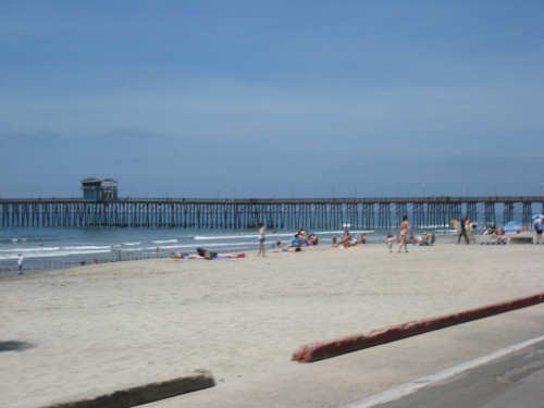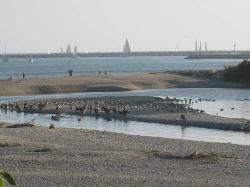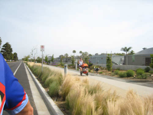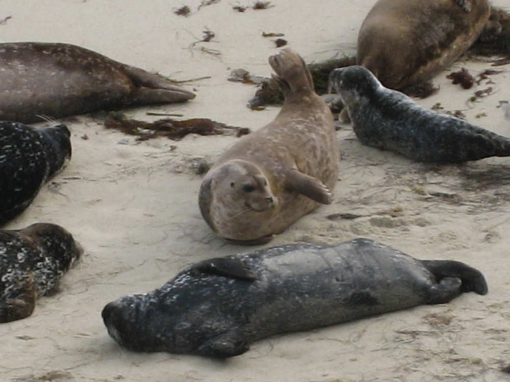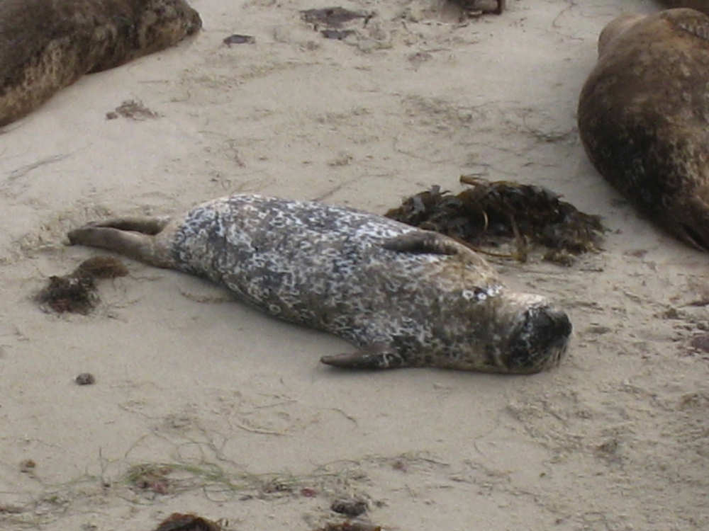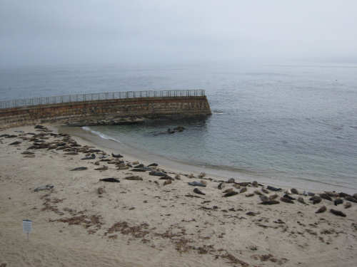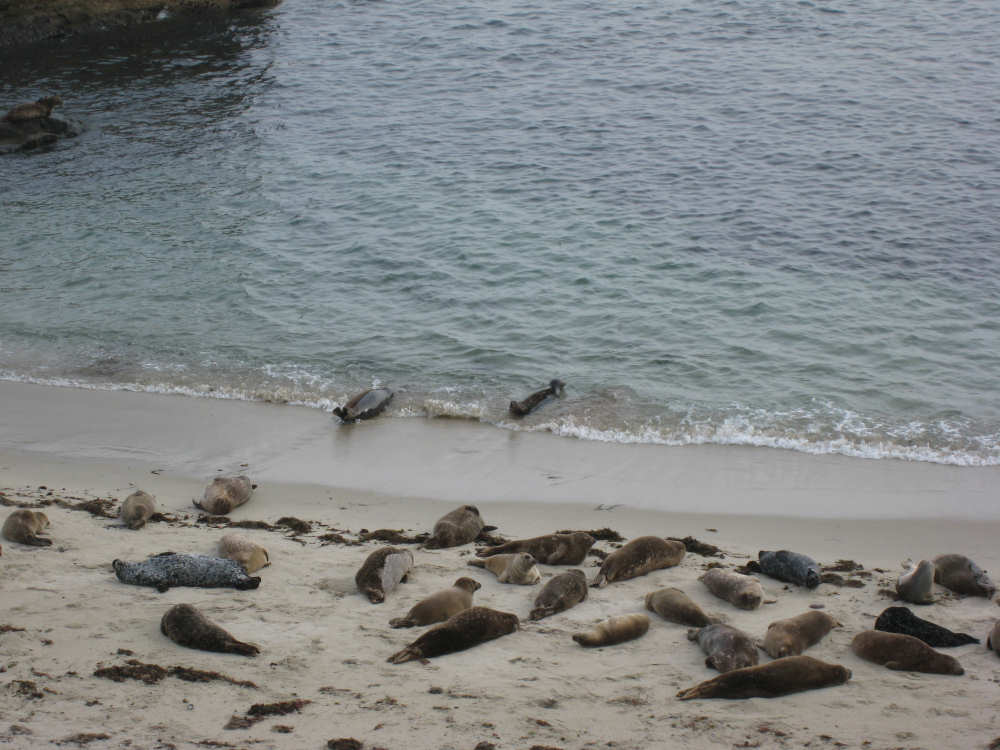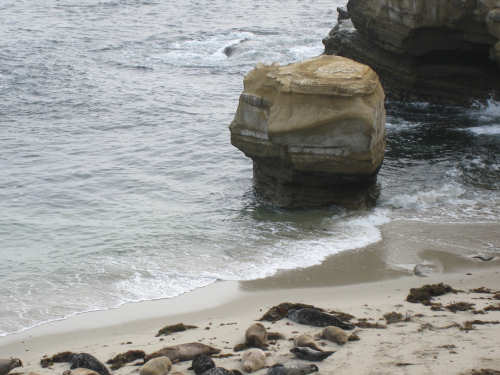 Thursday, May 15, 2008 We regretfully left Stu & Colleen's comfortable home this morning at 7:30 and headed north along the coast. Pat quickly discovered that the speedometer wasn't working. It turned out not to be working at all - the odometer, the mileage, the whole thing was unresponsive. We thought we'd have to get a new one and knew there was a bike shop about 20 miles away in Leucadia (thanks to Hank and Carolyn who tipped us off to it the other day when we said we'd need to buy some tubes). So we pedalled away without all that useful information. It turned out that the thing was stuck in reset mode and just needed to have all its numbers put in again. But we still lost the information on the first 20 miles or so of the day. We passed a lot of points of interest today. The first one was nearby, still in La Jolla - the seal beach. There was a nice little cove that Elizabeth Scripps had donated money to make into a children's beach, but the seals decided it would be a great place for them to hang out. And so they do. They were mostly all snoozing on the beach when we saw them. A couple of them went in the water for a swim and others flapped around a little now and then, but mostly they just lay there looking perfectly content! The waves were pretty calm in La Jolla today, but there were plenty of people out enjoying the beaches all along the coast - walking, jogging, biking, and just sitting and watching the ocean or playing on the beach. After a bit, we turned inland a little and climbed a very big hill up past the Scripps Institute and the University of California at San Diego. The Scripps Institute had several very scientific buildings (i.e. not very interesting architecture) but one very nice one which seemed to be the Geophysics building. The University had a lot of large buildings, and were constructing new ones (as universities are always doing). We were impressed by the number of students who biked around campus, especially given the hilliness there. We finally came down the hill, back to the coast and passed a number of very picturesque shore towns - Del Mar, Solana Beach, Cardiff-by-the-Sea, Encinitas, Leucadia, Carlsbad, and Oceanside. They all had great coastlines, lots of big, probably very expensive houses and lots of cute shops and restaurants. Solana Beach had a beautifully landscaped Rail-to-Trail path along the coast road as well. One beach had some decent waves and a number of surfers were in the water. After the shore towns, we entered Camp Pendleton, the Marine base. It wasn't at all what I expected. There were a lot of cars going through it - it started out as a 4-lane road and only later petered out to 2 lanes. It was a somewhat stark but beautiful landscape, hilly and covered with grasses and desert plants. There was also a shopping mall in it, though, a McDonalds, a large school, and housing that didn't look at all like barracks. We did see some troop movements and some training areas, but most of the area was deserted. After Camp Pendleton, we went along the coast again on a series of bike paths, through the San Onofre State Beach Park, past the San Onofre Nuclear Power Plant, and through the lovely town of San Clemente, following a very circuitous route through the neighborhood streets. We finally came to the town of San Juan Capistrano and the Doheny State Beach Park where we were going to camp for the night. The camping area was quite large, with some campsites right on the beach. There were a lot of families and other folks set up here. We arrived around 5, having had dinner at a restaurant in Capistrano. We went somewhere between 61-63 miles in probably about 6-1/2 hours or so of bike time. |