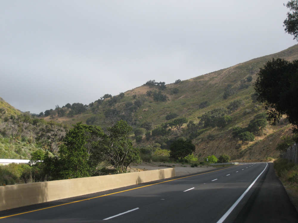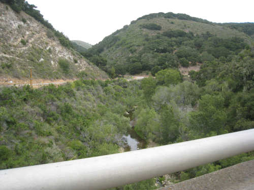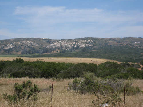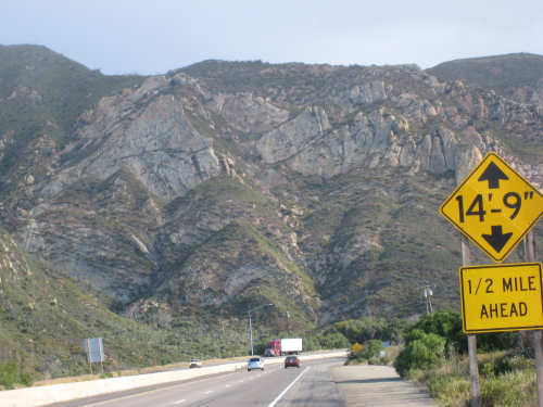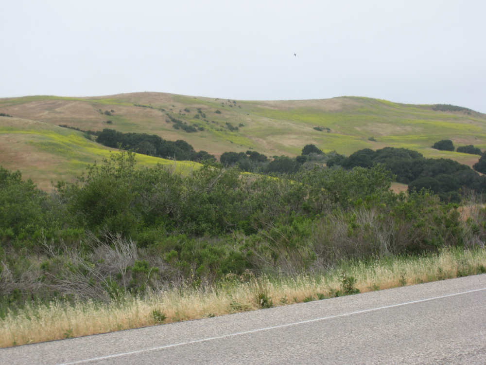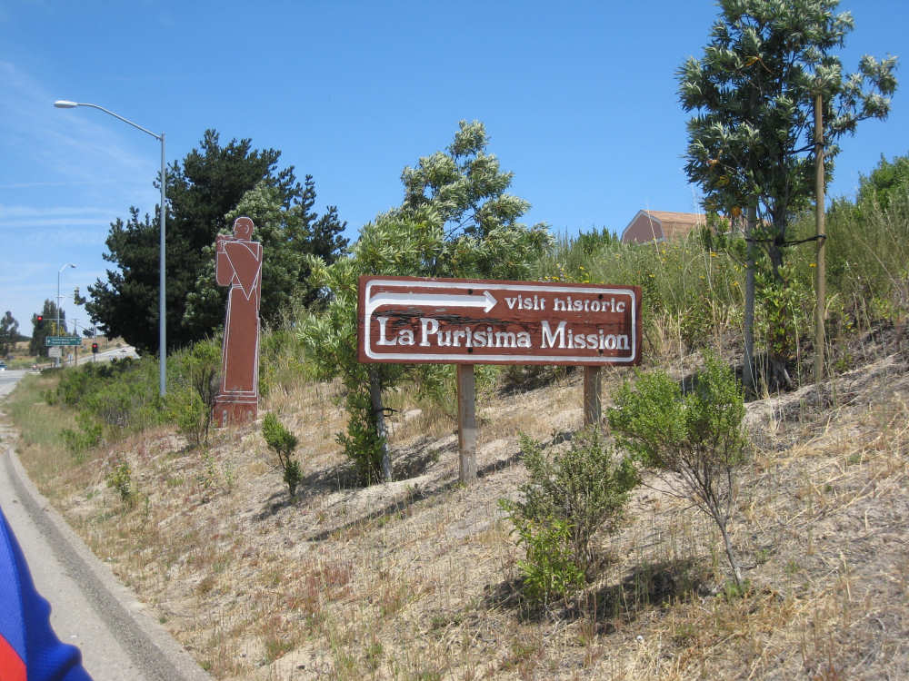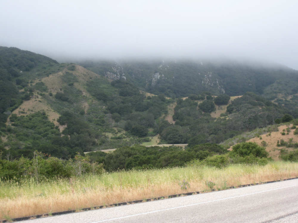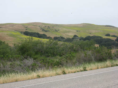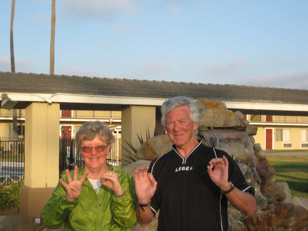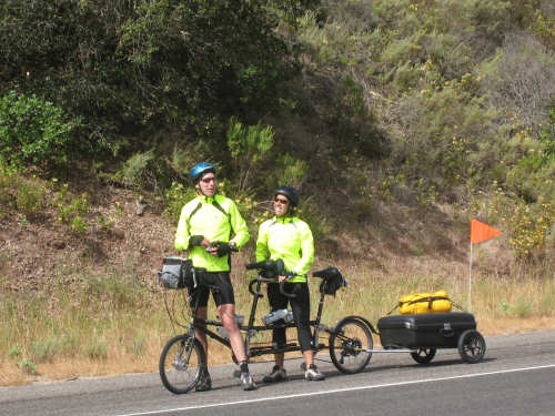 Tuesday, May 20, 2008 A very interesting day today - no ocean views, because we went a little more inland, but stunning mountainscapes instead. It got very windy last night, which we were well aware of, given we were out in the tent. I was hoping it would be over by morning, but no, it was still kicking when we got up today. It was also quite foggy over the mountains and cloudy over the ocean. Did not look like a good start to what we expected to be a difficult day. It was also pretty chilly - seemed like it might have been 50 degrees or a little less. So we bundled up, had the breakfast we packed the day before, packed up the bike, and left the campsite at about 8 am. We started going uphill right away but fairly gradually. The mountains ahead of us soon came into view and were absolutely awe-inspiring. There was a short tunnel up ahead and a rest area right before it. We stopped at the rest area to take some layers off, having already gotten warm, and found a lot of information about the mountains and plants of the area. The placards were not in good shape and were hard to read, so I thought I would transmit some of what was written on them instead of putting up pictures of them. "This province is unique among all the other California provinces. In the Transverse Ranges, all of the mountains and valleys run in an east-west direction, while most other mountains in the state trend in a north-south direction... The Santa Ynez Mountains were once the floor of an ancient sea, which was uplifted...millions of years ago. The steep and rugged outcrops of the pass are sandstone beds which have been tilted almost straight up. The sandstone gives way abruptly to clay shales as one moves south toward the coast. The transition from sandstone to clay, marked by a change in vegetation as well, is easily seen in aerial photos. The sandstone outcrops are covered by dense brush, or chaparral. This contrasts dramatically with the grasses and annual herbs growing on the gentle slopes of the softer clay shales." We went through the tunnel which was thankfully short - it was narrow and had a lot of traffic so it was a little scary and very noisy. After the tunnel, the climb got a lot steeper and went on for about 3 miles. The mountains continued to be gorgeous however and we thoroughly enjoyed the trip up. As the placards at the rest area indicated, this side of the Santa Ynez Mountains was much greener and softer than the sandstone/chaparral slopes. The colors ran from the dark green of the dense trees to the light green of new grasses, with large patches of yellow flowers and light brown grasses thrown in here and there. The rolling hills and deep canyons made a highly varied terrain that was constantly enchanting. We saw crops and cattle in a few places (how the cattle managed the steep slopes, I can't imagine), but mostly it was just wild and beautiful. Just as we got near the top of that first steep hill, we saw another couple on a tandem coming down on the other side of the road. We stopped to chat - they were Paul and Robin from Boulder, CO, and they were taking a 10-day trip along the coast, ending in Santa Barbara. They were amazed to hear that they were only the second tandem we had seen touring. We had a nice descent on the other side, not having to brake much, and eventually came to the town of Lompoc. We had lunch there, since it was about half-way and was the only town we'd see that day before our final destination. One of the original Spanish missions, La Purisima, was nearby but as usual we didn't stop to sight-see. The route out of Lompoc took us through Vandenberg Air Force Base although if we hadn't seen the signs for it, we would never have known. All we saw were more rolling hills (none as high as the first one) and greenery. We did pass a large middle school on the base, where a lot of kids were just coming out for recess or some sort of outdoor exercise. This half of the day was not quite as scenic and had a lot more short climbs, so we were getting pretty tired by the end. It had gotten less windy and warmer in the afternoon but was still surprisingly cool. We turned off of Rt. 1, on which we had been most of the day, onto Rt. 135 which took us into Santa Maria, a large town of about 77,000. We ended the day around 4 pm, having gone almost 48 miles in almost 5-1/2 hours - pretty slow going. Oh, and we hit another milestone - 4,000 miles today. Pat still has trouble making zeroes with his hands. |