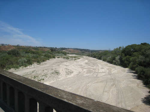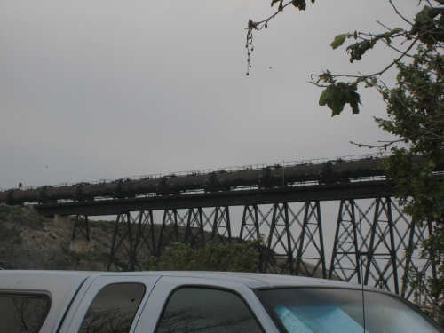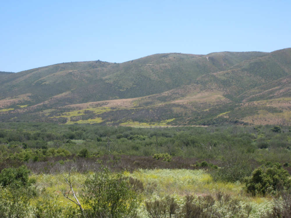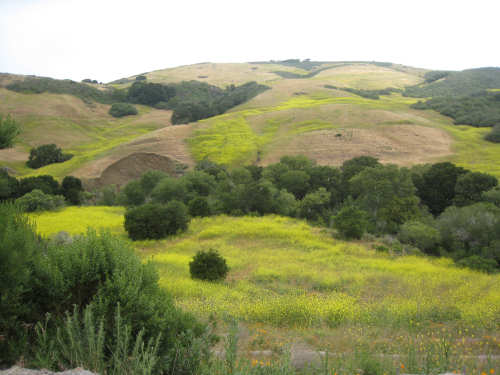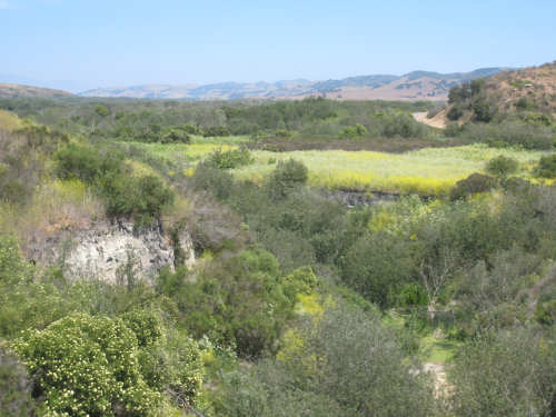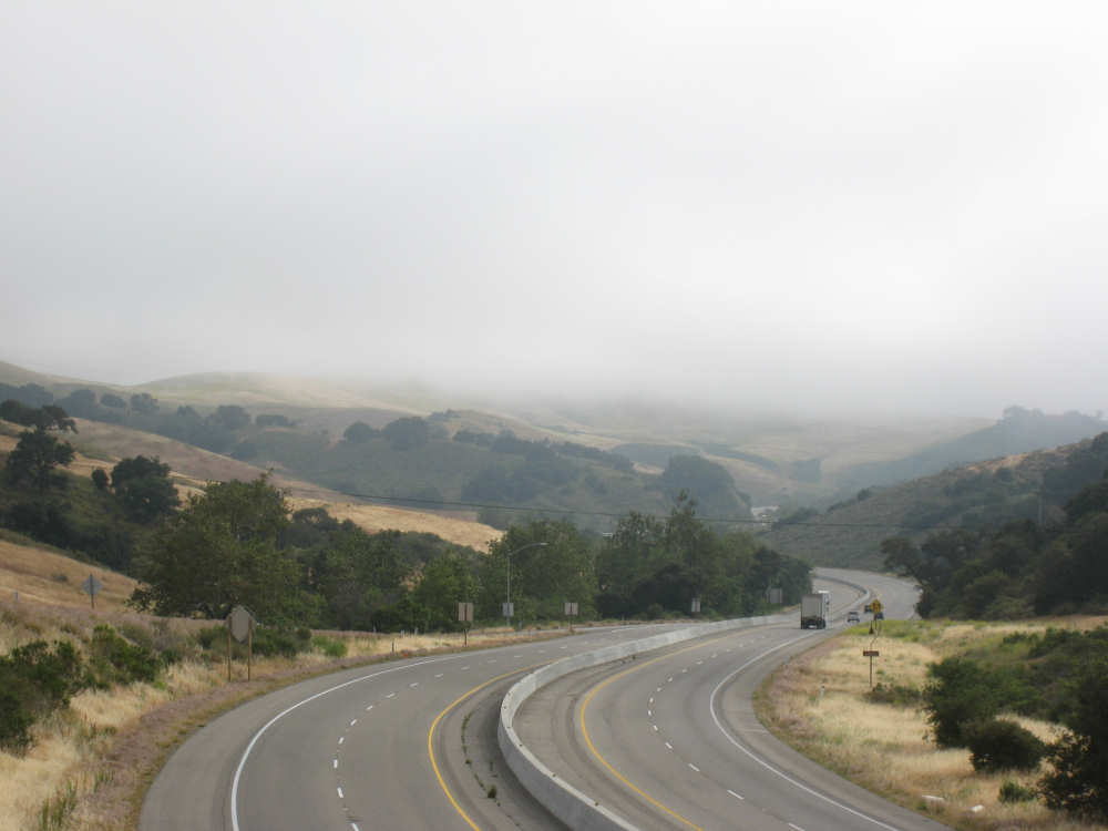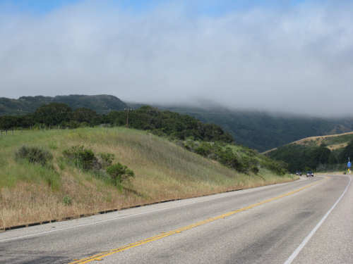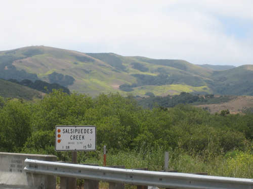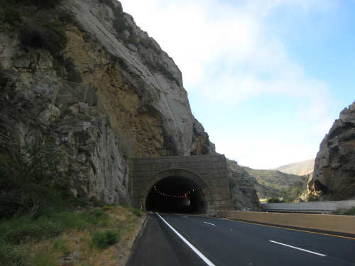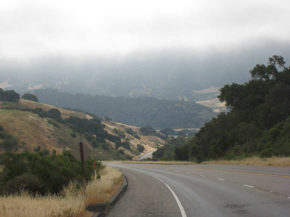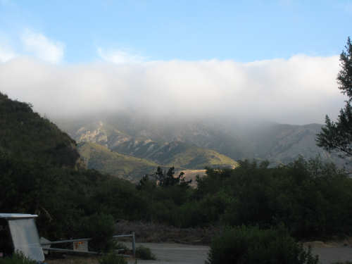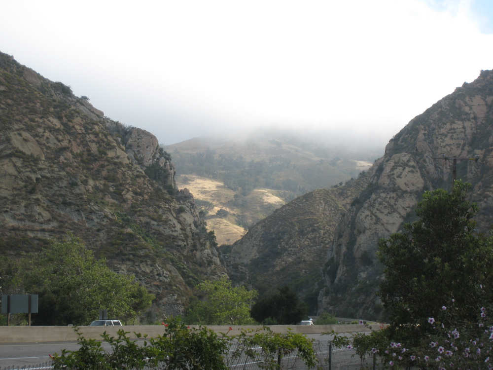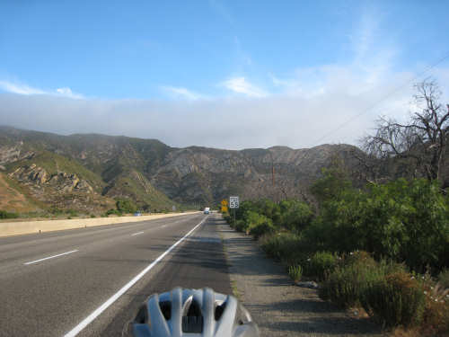 Tuesday, May 20, 2008 A very interesting day today - no ocean views, because we went a little more inland, but stunning mountainscapes instead. It got very windy last night, which we were well aware of, given we were out in the tent. I was hoping it would be over by morning, but no, it was still kicking when we got up today. It was also quite foggy over the mountains and cloudy over the ocean. Did not look like a good start to what we expected to be a difficult day. It was also pretty chilly - seemed like it might have been 50 degrees or a little less. So we bundled up, had the breakfast we packed the day before, packed up the bike, and left the campsite at about 8 am. We started going uphill right away but fairly gradually. The mountains ahead of us soon came into view and were absolutely awe-inspiring. There was a short tunnel up ahead and a rest area right before it. We stopped at the rest area to take some layers off, having already gotten warm, and found a lot of information about the mountains and plants of the area. The placards were not in good shape and were hard to read, so I thought I would transmit some of what was written on them instead of putting up pictures of them. "This province is unique among all the other California provinces. In the Transverse Ranges, all of the mountains and valleys run in an east-west direction, while most other mountains in the state trend in a north-south direction... The Santa Ynez Mountains were once the floor of an ancient sea, which was uplifted...millions of years ago. The steep and rugged outcrops of the pass are sandstone beds which have been tilted almost straight up. The sandstone gives way abruptly to clay shales as one moves south toward the coast. The transition from sandstone to clay, marked by a change in vegetation as well, is easily seen in aerial photos. The sandstone outcrops are covered by dense brush, or chaparral. This contrasts dramatically with the grasses and annual herbs growing on the gentle slopes of the softer clay shales." We went through the tunnel which was thankfully short - it was narrow and had a lot of traffic so it was a little scary and very noisy. After the tunnel, the climb got a lot steeper and went on for about 3 miles. The mountains continued to be gorgeous however and we thoroughly enjoyed the trip up. As the placards at the rest area indicated, this side of the Santa Ynez Mountains was much greener and softer than the sandstone/chaparral slopes. The colors ran from the dark green of the dense trees to the light green of new grasses, with large patches of yellow flowers and light brown grasses thrown in here and there. The rolling hills and deep canyons made a highly varied terrain that was constantly enchanting. We saw crops and cattle in a few places (how the cattle managed the steep slopes, I can't imagine), but mostly it was just wild and beautiful. Just as we got near the top of that first steep hill, we saw another couple on a tandem coming down on the other side of the road. We stopped to chat - they were Paul and Robin from Boulder, CO, and they were taking a 10-day trip along the coast, ending in Santa Barbara. They were amazed to hear that they were only the second tandem we had seen touring. We had a nice descent on the other side, not having to brake much, and eventually came to the town of Lompoc. We had lunch there, since it was about half-way and was the only town we'd see that day before our final destination. One of the original Spanish missions, La Purisima, was nearby but as usual we didn't stop to sight-see. The route out of Lompoc took us through Vandenberg Air Force Base although if we hadn't seen the signs for it, we would never have known. All we saw were more rolling hills (none as high as the first one) and greenery. We did pass a large middle school on the base, where a lot of kids were just coming out for recess or some sort of outdoor exercise. This half of the day was not quite as scenic and had a lot more short climbs, so we were getting pretty tired by the end. It had gotten less windy and warmer in the afternoon but was still surprisingly cool. We turned off of Rt. 1, on which we had been most of the day, onto Rt. 135 which took us into Santa Maria, a large town of about 77,000. We ended the day around 4 pm, having gone almost 48 miles in almost 5-1/2 hours - pretty slow going. Oh, and we hit another milestone - 4,000 miles today. Pat still has trouble making zeroes with his hands. |