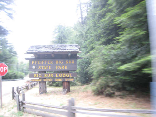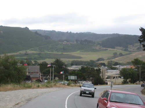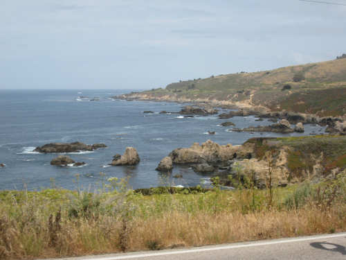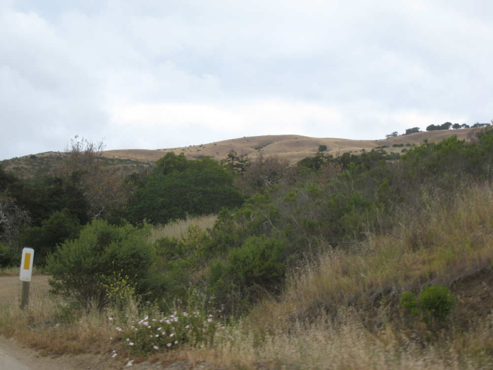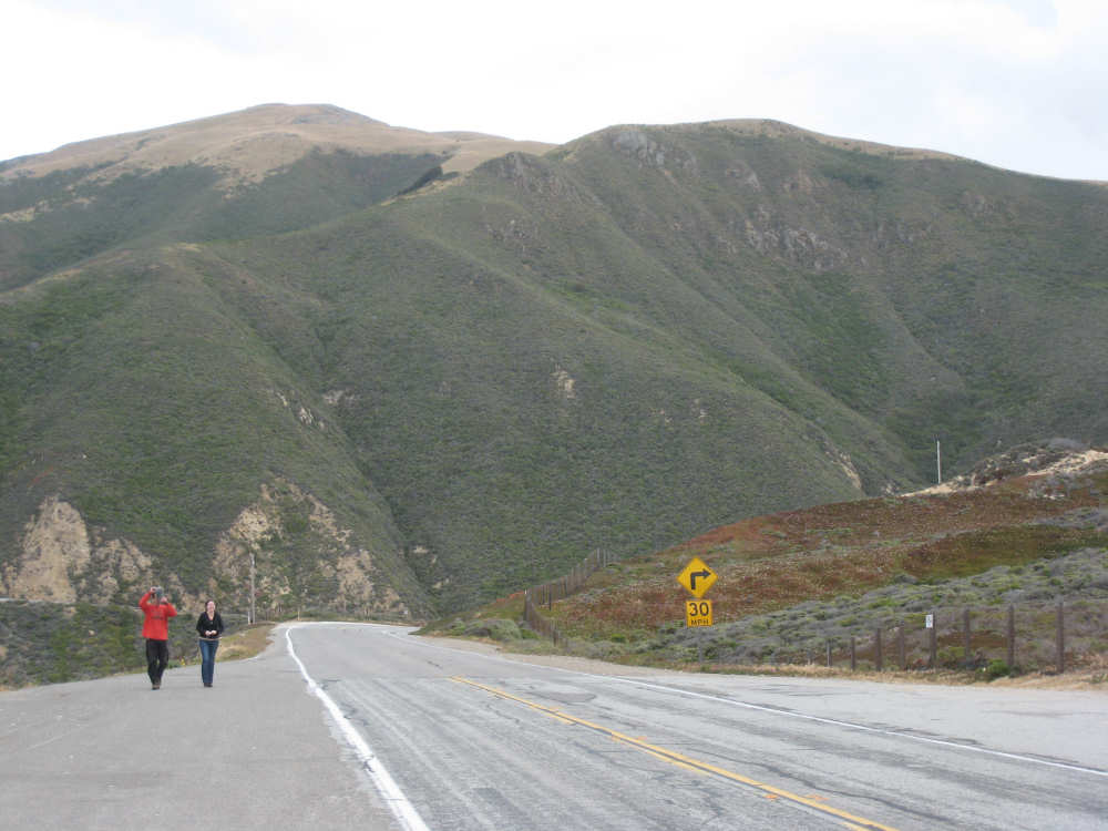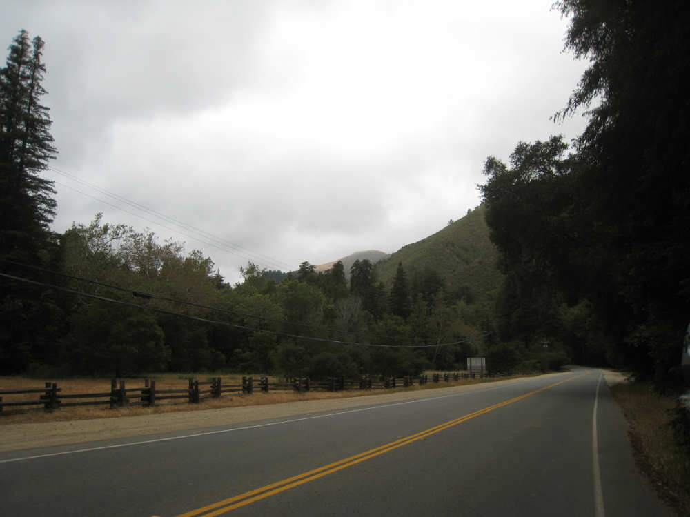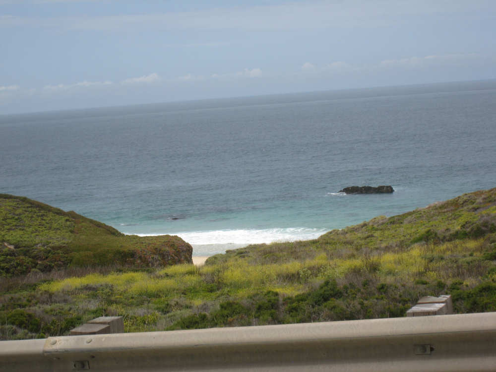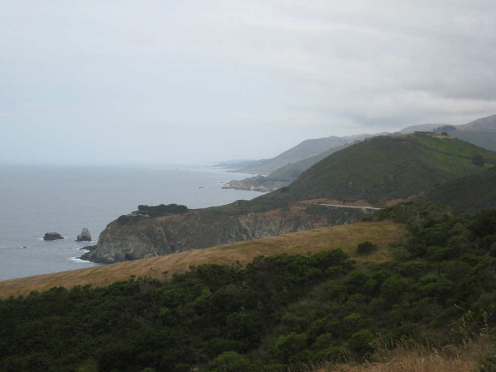 Cloudy again today, and rather cool. We packed up the tent and everything this morning and headed out by 8:10, having decided to find breakfast on the road instead of eating in the Big Sur Lodge again (they didn't open until 8 anyway). The road was lined with redwoods so the scenery was very dark and woodsy for a bit. We followed the Big Sur River for a good while and passed several other state parks with camping facilities. We saw a small restaurant that was open for breakfast and stopped there. Another couple arrived just after us and was seated at the table next to us. We got to talking - they were Anthony and Jenny from Worchestershire, England. Anthony was here for business, and they decided to stay on for 10 more days, traveling along the west coast. We had a pleasant chat and a delicious breakfast and then headed off. The road opened up after a few miles, and we were back to the rolling hills with grasses and short shrubs. We finally got a glimpse of the ocean again around Point Sur. As we approached the ocean, we saw a hill poking up in the distance, with what looked like a big house and water cistern on top of it and a long winding road going up to it. As we got closer, we saw that the hill was right along the ocean, almost an island. There was a sign down the road leading to it that seemed to indicate it was a naval facility of some kind, but that might have been the buildings closer to the road and not the one on top of the hill. We got several more views of this hill as we got closer to the coast, and as we traveled farther up the coast as well.