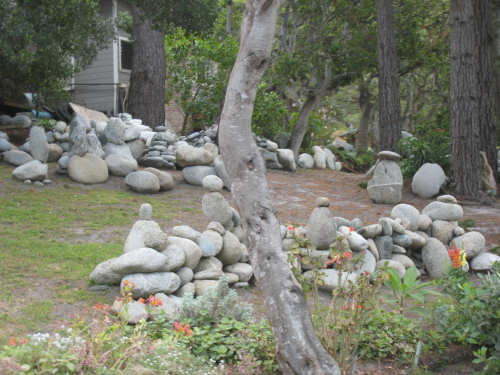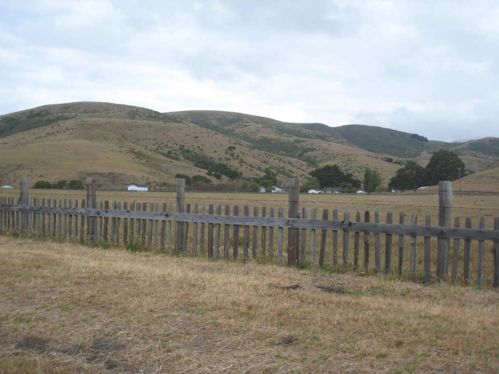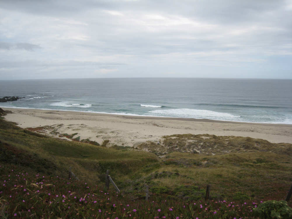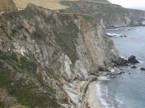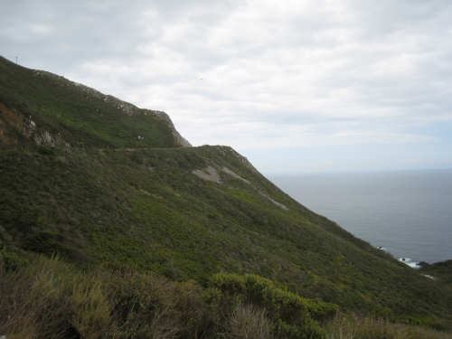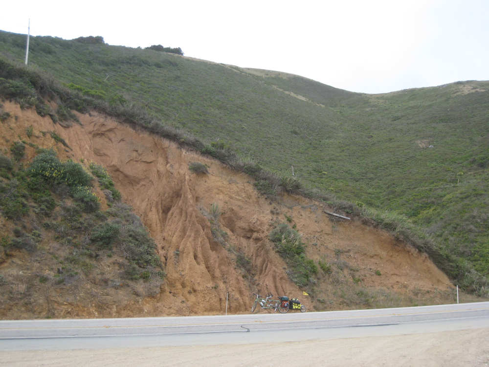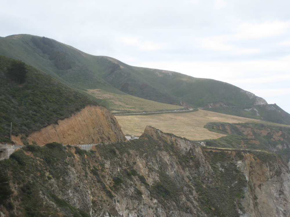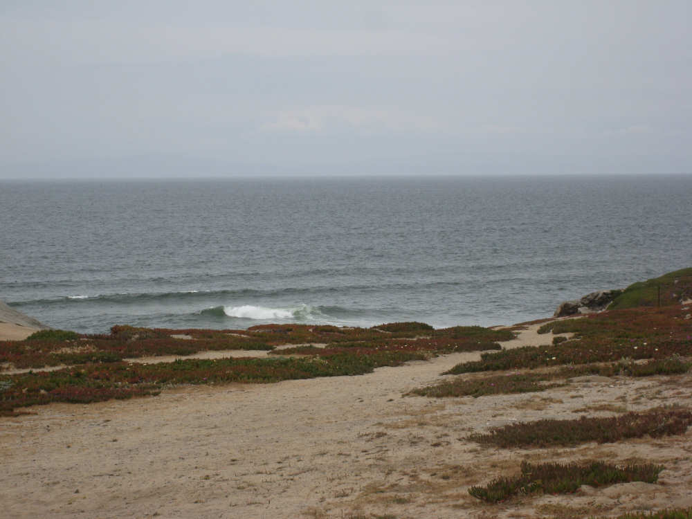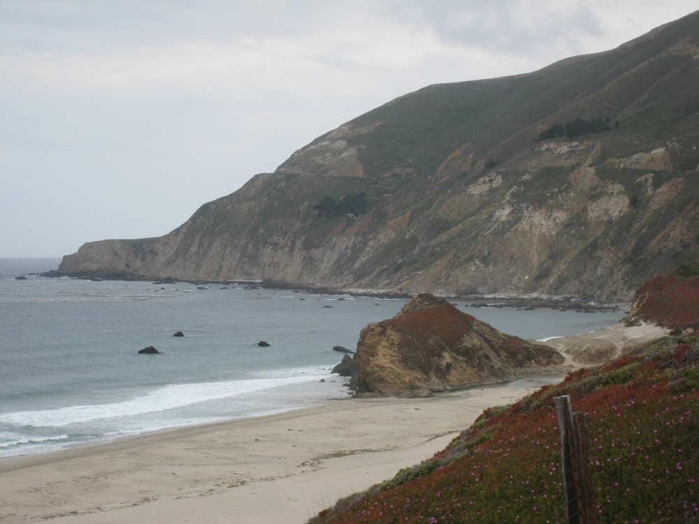 Cloudy again today, and rather cool. We packed up the tent and everything this morning and headed out by 8:10, having decided to find breakfast on the road instead of eating in the Big Sur Lodge again (they didn't open until 8 anyway). The road was lined with redwoods so the scenery was very dark and woodsy for a bit. We followed the Big Sur River for a good while and passed several other state parks with camping facilities. We saw a small restaurant that was open for breakfast and stopped there. Another couple arrived just after us and was seated at the table next to us. We got to talking - they were Anthony and Jenny from Worchestershire, England. Anthony was here for business, and they decided to stay on for 10 more days, traveling along the west coast. We had a pleasant chat and a delicious breakfast and then headed off. The road opened up after a few miles, and we were back to the rolling hills with grasses and short shrubs. We finally got a glimpse of the ocean again around Point Sur. As we approached the ocean, we saw a hill poking up in the distance, with what looked like a big house and water cistern on top of it and a long winding road going up to it. As we got closer, we saw that the hill was right along the ocean, almost an island. There was a sign down the road leading to it that seemed to indicate it was a naval facility of some kind, but that might have been the buildings closer to the road and not the one on top of the hill. We got several more views of this hill as we got closer to the coast, and as we traveled farther up the coast as well.