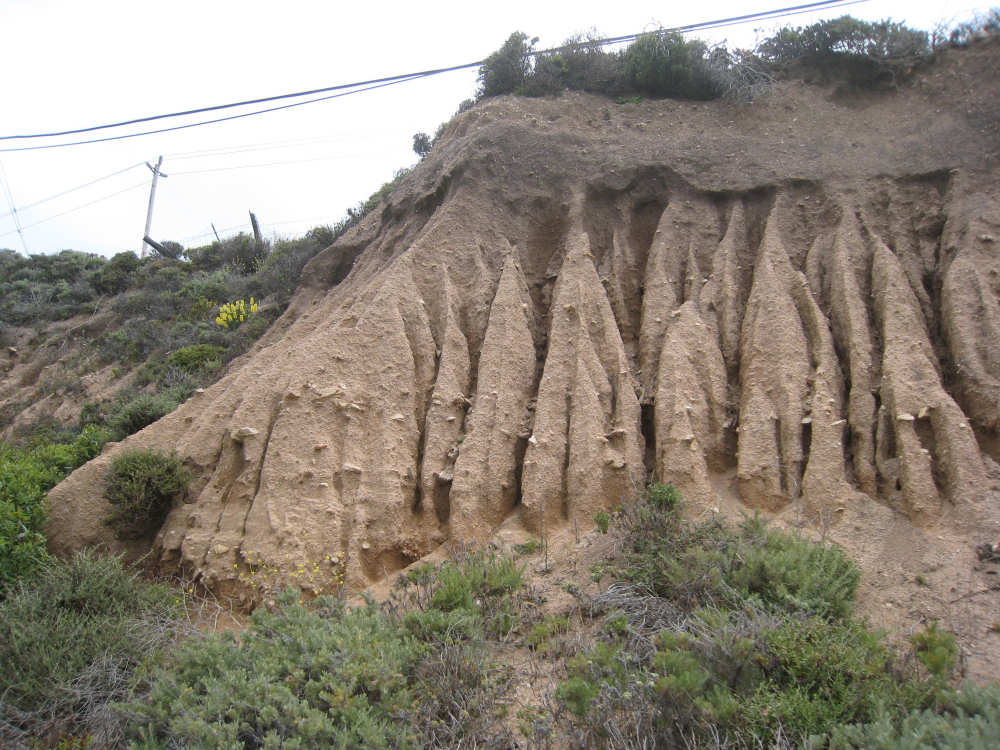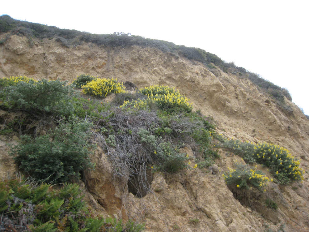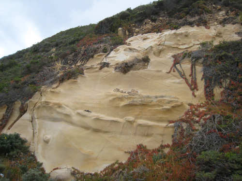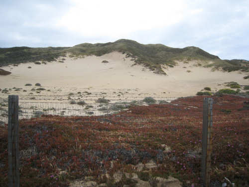 A very sandy area, ice plants (the reddish-brown plants in the foreground)