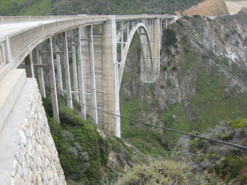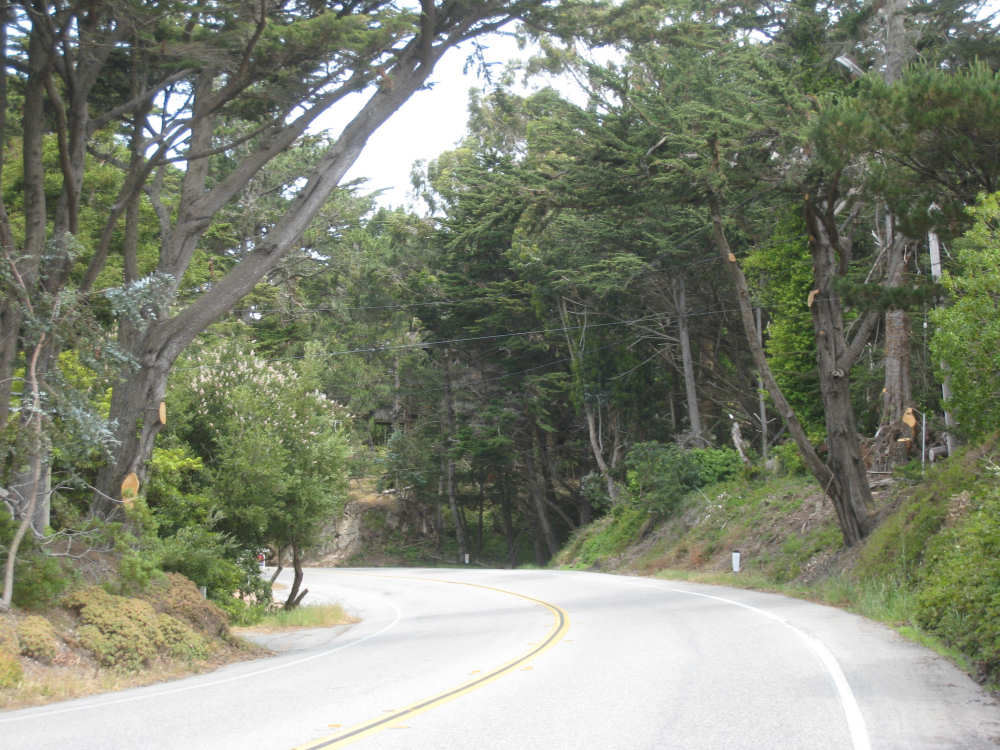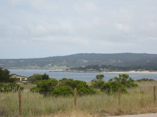 We continued up the coast, with one long (2-mile) climb, for another 15 or 20 miles without going through another town until Carmel Highlands. We did see some beautiful coastline, though, as well as some tall, green-covered mountains, and several creeks that emptied into the ocean. Across some of these creeks there were a series of historic bridges, built between 1931 and 1935. They were impressive monumental structures and had obviously stood the test of time. We also saw lots of wildflowers, including some yellow lupine which one of the camp hostesses told us was just beginning to come out (she did wildflower photography and so was very familiar with what was coming out when). It was a delightful stretch of the road. We then came into Carmel Highlands and, shortly after that, Carmel. These were both lovely towns, with well-to-do neighborhoods and lots of green space. Coming into Carmel, we passed a large body of water which had a sign saying Carmel River, but it looked more like a lake. We passed the Carmel River again soon afterwards when it looked much more like a river. We stopped for lunch at a quaint place called the Black Bear Diner which was very good and then headed up our second long hill of the day. It had started to drizzle a little and felt even cooler than it had in the morning. The road had changed from the narrow 2-lane road to which we had become accustomed, to a 4-lane busy highway. By the time we got to the top of the hill, we were quite glad to be pulling off onto a bike path and getting away from the busy, nosiy highway. The bike path went steeply downhill for a good stretch - again, we were glad to be on a bike path away from traffic; we could go a lot faster without worrying about cars turning or coming in from cross streets.