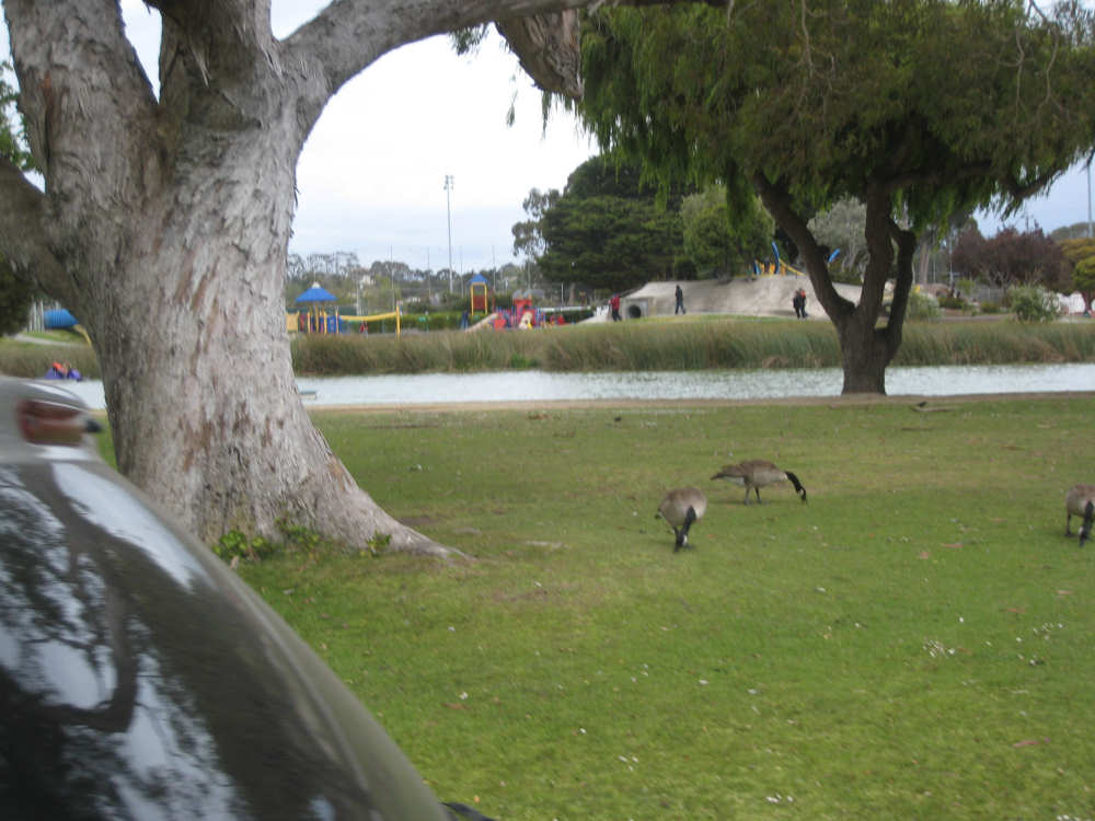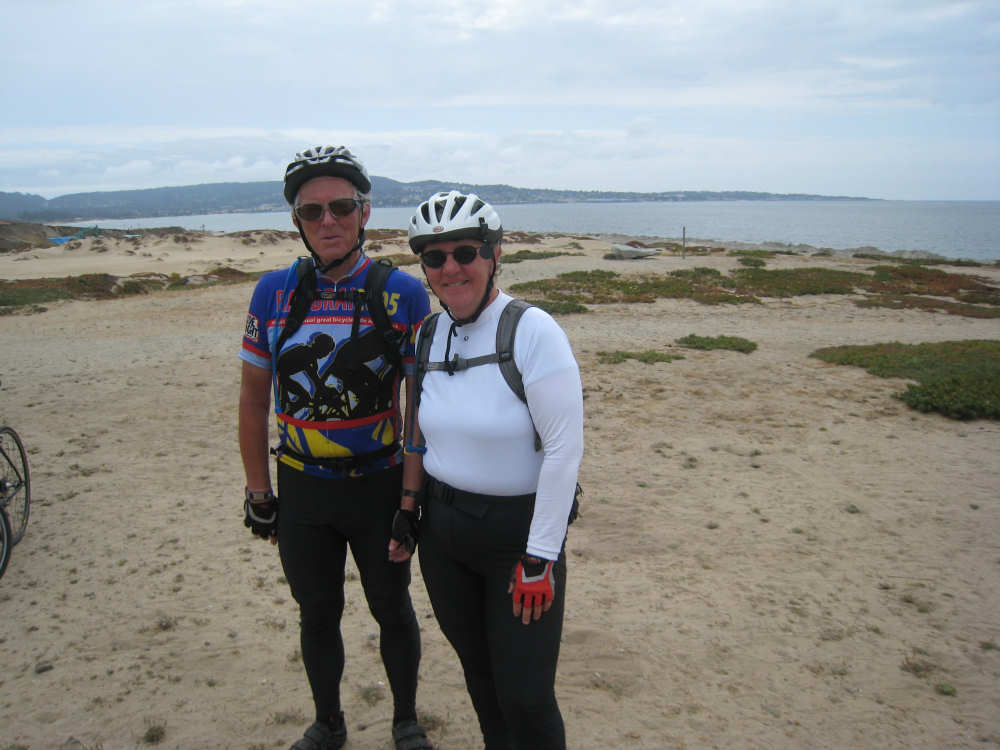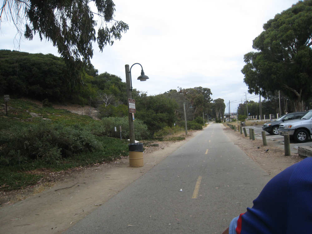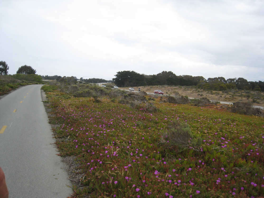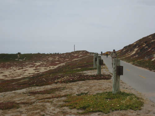 The bike path took us into Monterey and we came to the Monterey State Beach, which had a lovely park with a water channel through it. There were several people out in paddleboats on the water and walking, biking, and roller blading in the park. Our route took us away from Fisherman's Wharf and the Aquarium, which would have been nice to see, but the traffic in that area was pretty dense. So we went off on the bike path, which I expected to be very scenic, but after one spot with a good view of the Monterey Peninsula and the Bay, the water was hidden behind a wall of sand dunes. The dunes themselves were not very picturesque, and it was still very cloudy and chilly - it was a rather disappointing way to finish an otherwise wonderful day.