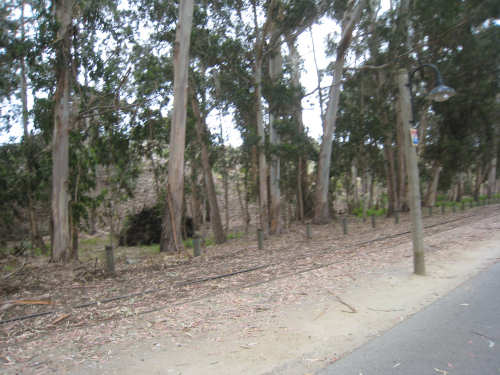 The bike path in Monterey, lined with eucalyptus trees and a railroad track