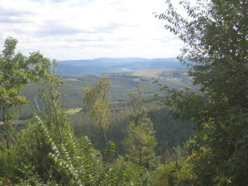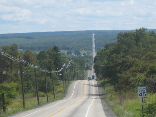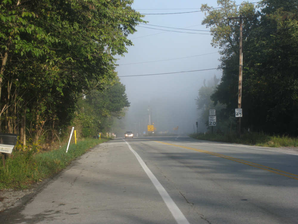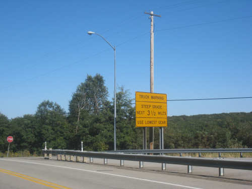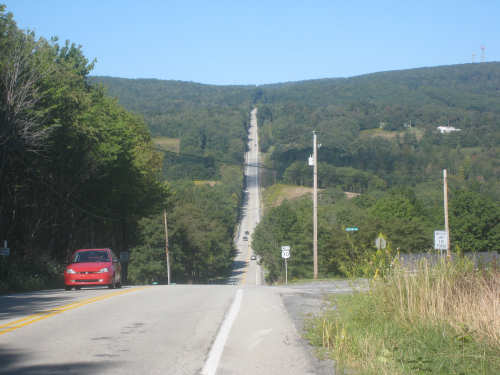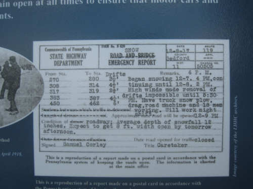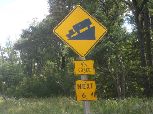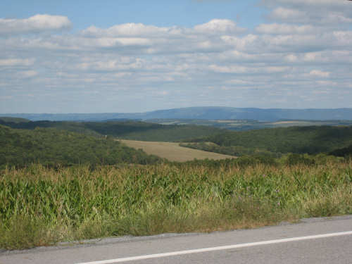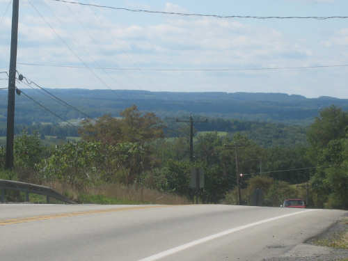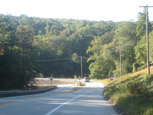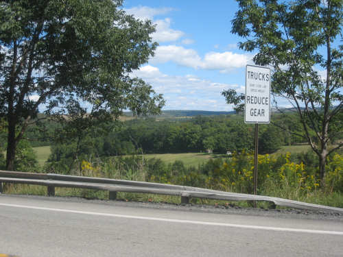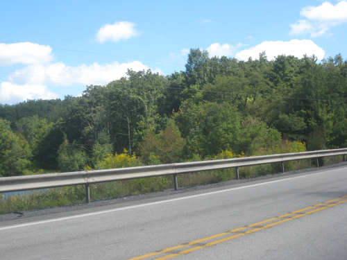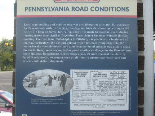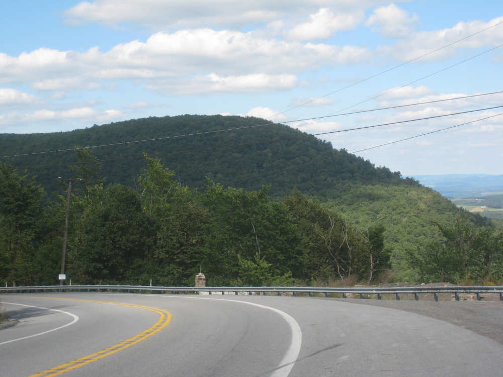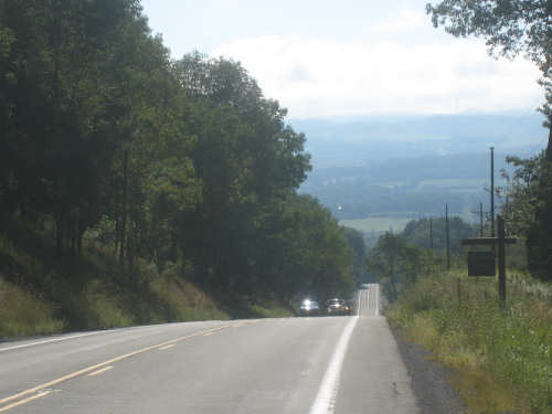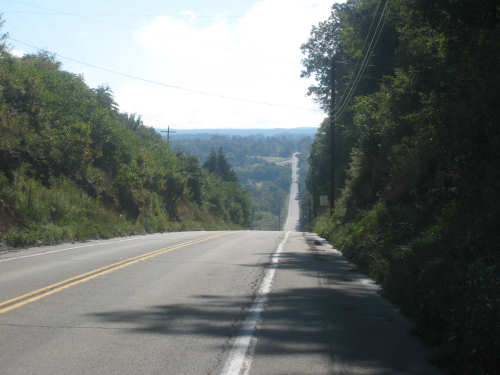 Wednesday, September 10, 2008 Today was a totally spectacular day, despite the long climbs. The Alleghenies were absolutely beautiful and the weather today was perfect. It started out foggy and chilly as we left our motel at 7:50. We debated whether to wear our jackets but decided not to since we'd get warm soon enough. That was certainly the case - we started to climb right away, only about 1% at first, then 3%, and then 5-6%. The road was good but the shoulder was narrow and rough, which was worrisome - if it were like that all day, we'd have a very hard day of it. Luckily, the shoulder improved greatly after the first 4 miles, before the real climbs began, and it was wide and smooth pretty much all day. The fog also lifted (or maybe we just got above it) after 7 or 8 miles and it was a beautiful, sunny day with puffy white clouds the rest of the day. The temperature remained cool, for which we were thankful because it made riding up all those steep hills much more pleasant. We knew we had 3 major climbs today, the steepest and longest one starting off right at the beginning of the day. We started at about 1,100 feet and reached 2,684 feet at the Laurel Hill Summit. The ascent was over about 4 or 5 miles and had many long stretches of 9-10% grades. There was a long, steep descent from that summit, during which we had to brake constantly, but we didn't go all the way back down to 1,100 feet. The second hill was not as long or as high, but still had some steep rises. The third, Bald Knob Summit, went up to 2,906 feet although it only started from about 2,400 feet. It was long but not as steep as the others. In between all the major climbs were a lot of ups and downs, as well. The third hill had a 6-mile 9% grade descent (according to the truck warning sign) with a few plateaus where we could give our brakes a rest. And then it was slightly rolling with another small hill just before our destination. It was interesting to compare today's climbs with some of the others we've struggled over in the last 6 months. Although the Alleghenies weren't as high as a lot of the others, they were steeper than most of them. The other hills were usually graded so that they kept to a 5% grade more uniformly. The Alleghenies route went pretty much up and over, as you can see from some of the pictures! Still, we agreed that the Leggett Hill in California was worse than today's hills; the grades there were pretty intense, and the shoulder was basically non-existent, with a steep cliff on one side of the road and a very steep drop on the other. And we thought the Pennsylvania mountains had the best scenery of any place we've been - beautifully wooded hills with a variety of deciduous trees and evergreens. We didn't have as many towns to pass through today. Among the first ones we came to were Jennerstown, closely followed by Jenners Township, immediately bordered by the Village of Jenners Crossroads (it must be very confusing to live here). We stopped for a snack in Jennerstown, having made it over our first hill by then. We spotted a little place called the Snack Shack which seemed perfect. They had some apple dumplings and turnovers that we chose and snarfed down while chatting with the guy at the counter. When we were ready to leave, he told us the snacks were on the house - something he regularly does for bikers coming through. What a nice guy! We then had a 4-hour stretch before we came to another place with food, Reels Corner, where we had lunch. The Hertiage Highway Restaurant was an interesting place with some historic markers beside its doors. One of them really amazed us - it described the snow removal operations on the road before they had snow plows. We have pictures below. Route 30 seems to have been called the Lincoln Highway and is now called Heritage Highway. There were many references to the Lincoln Highway and some great murals of the road in its heyday, as well as other historic markers along the road. In another kind of tribute, shortly before Reels Corner we saw a sign for the Flight 93 memorial, about 3 miles down the road towards Shanksville. It was a longer day than we've had in a while. We arrived at our motel at 4:20, having gone only 38.7 miles in almost 5-3/4 bike hours, our slowest average to date, I believe. Still, the gorgeous hills made it a thoroughly enjoyable day. Tomorrow, we'll go 5 miles longer but have a little less climb, we think. We'll be going through PA turnpike territory - Bedford and Breezewood - before turning farther south through McConnellsburg. We should be through the mountains after tomorrow, so we'll have a lot less climbing to do after that. The weather should still be nice tomorrow, although it will probably rain for the rest of the week. |